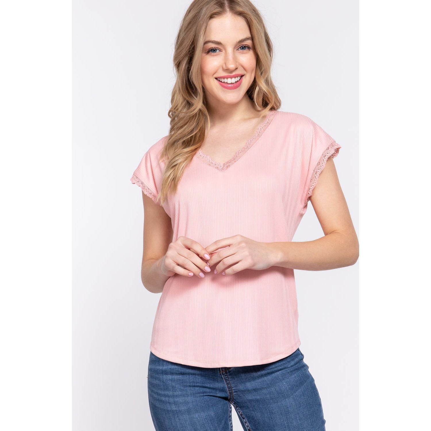 ACTIVE BASIC Lace Trim V-Neck Short Sleeve Ribbed Top