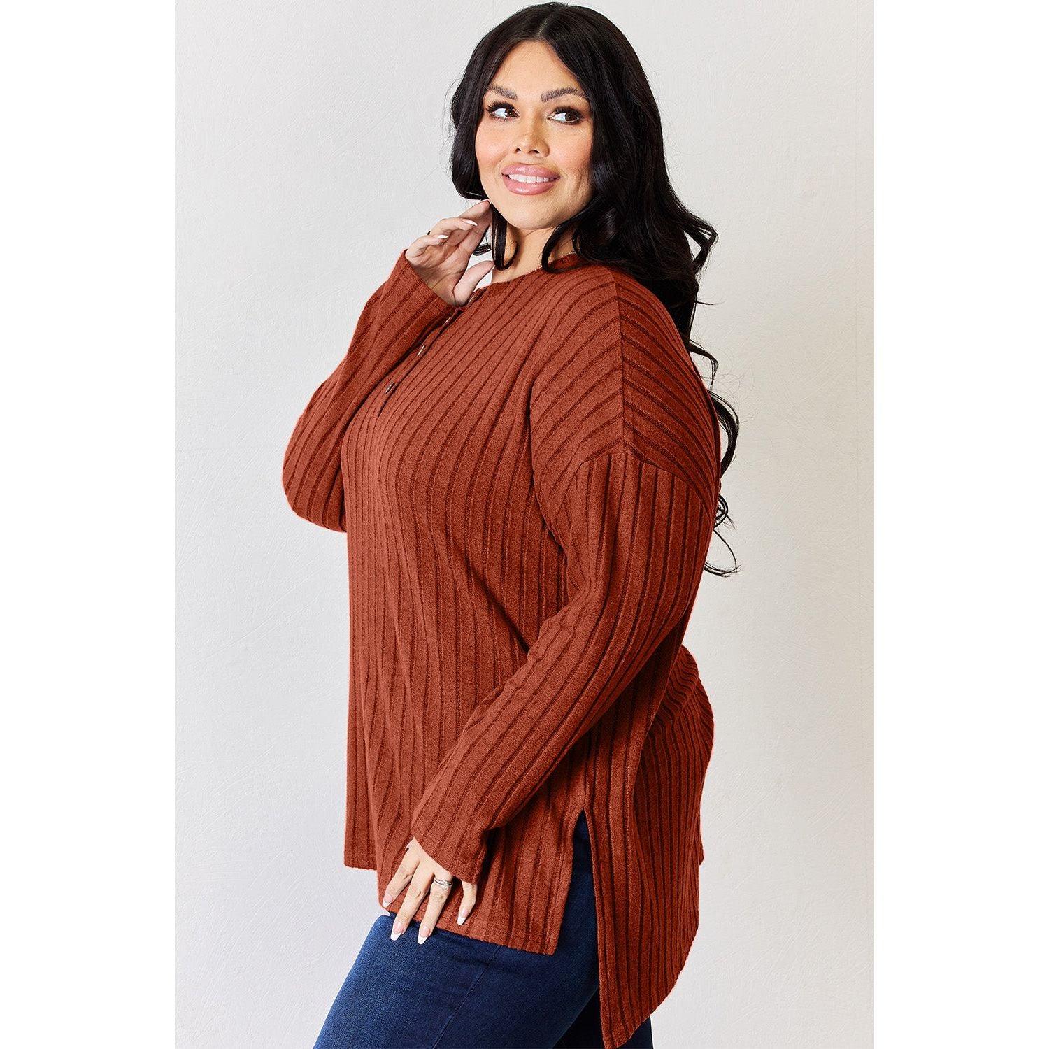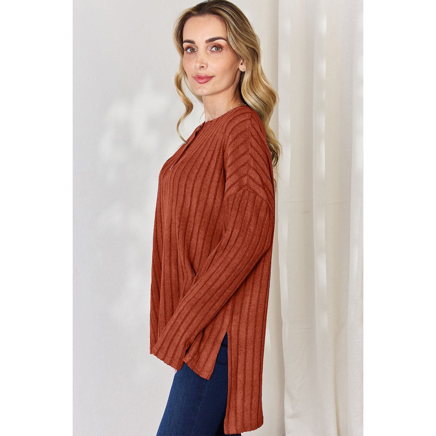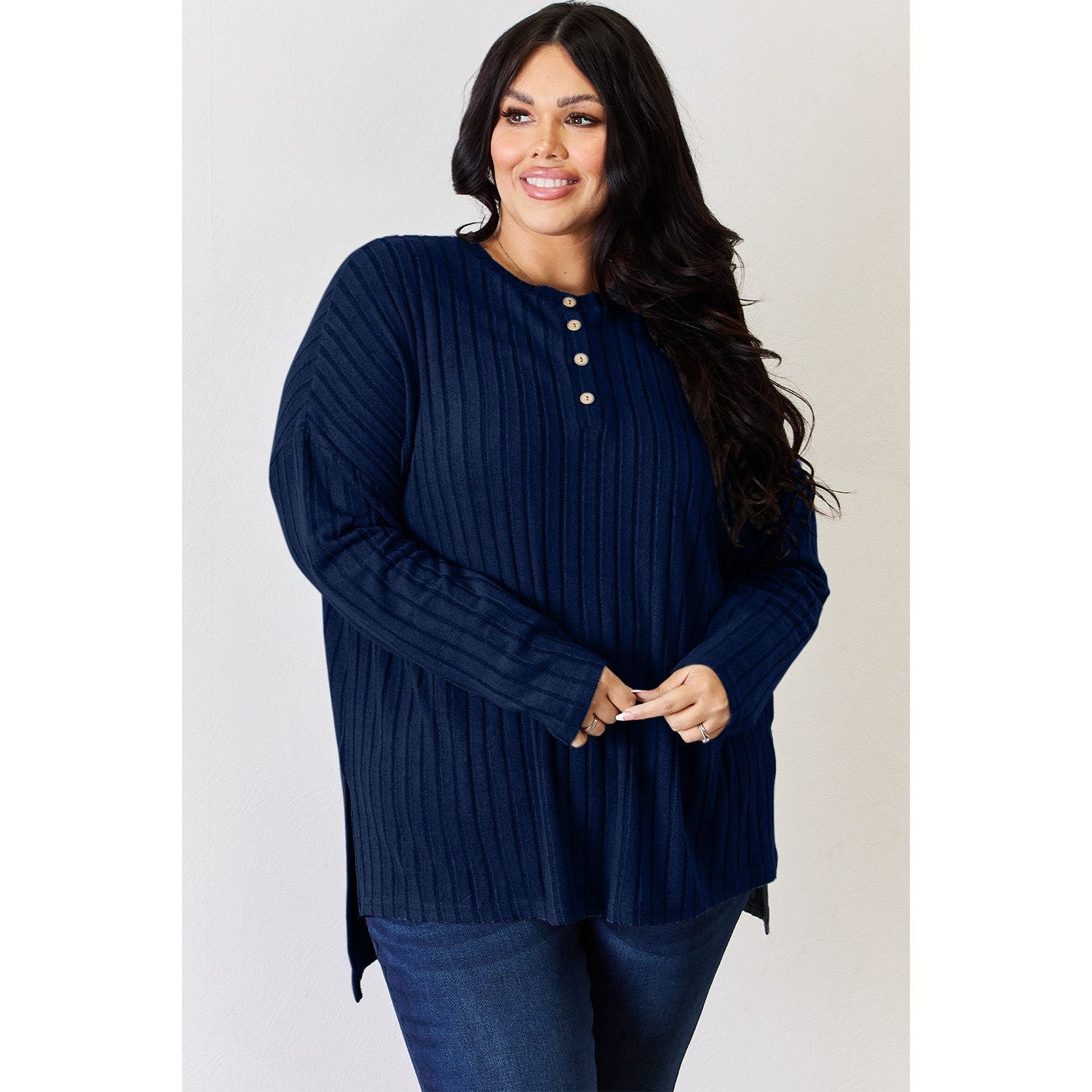 Basic Bae Full Size Ribbed Half Button Long Sleeve High-Low T-Shirt