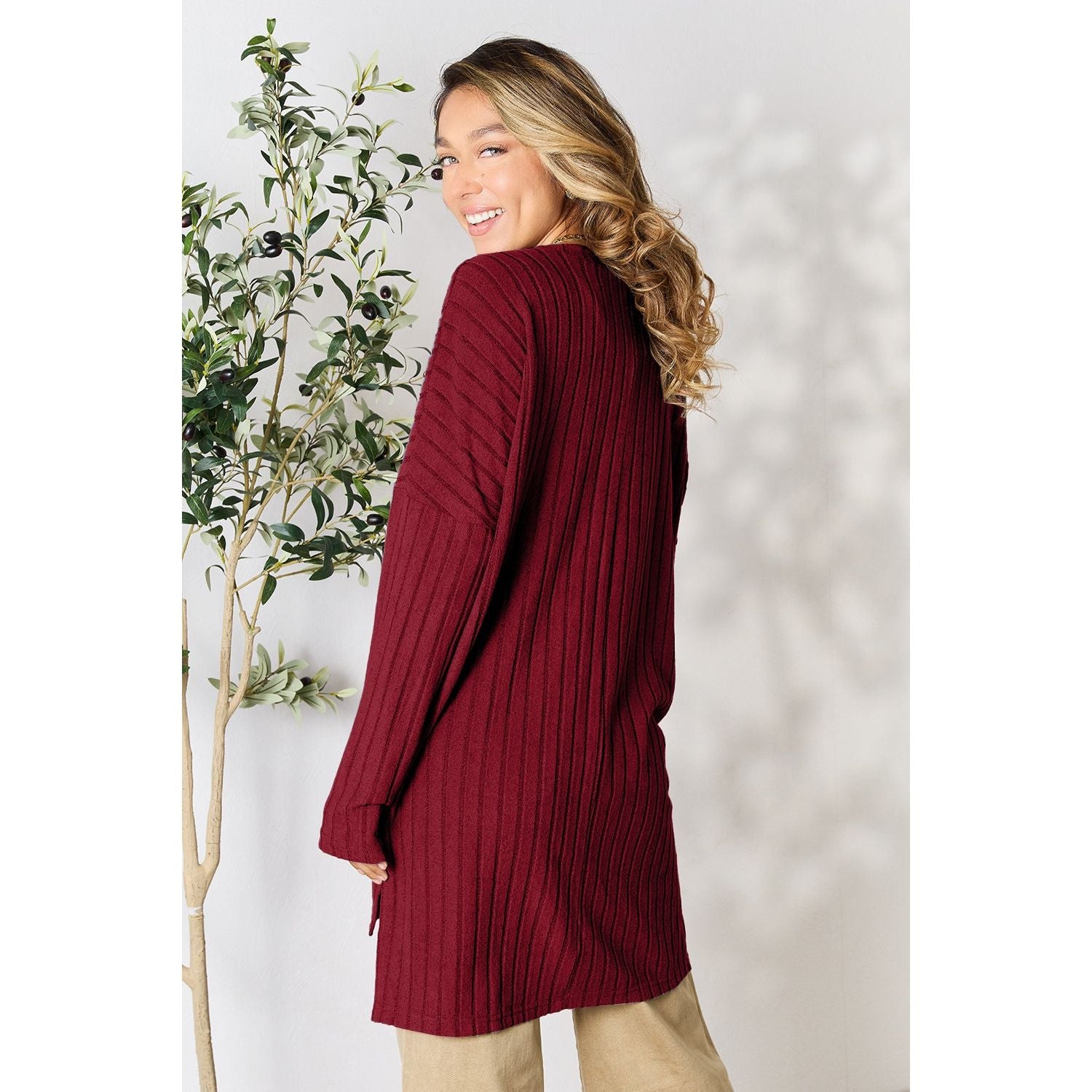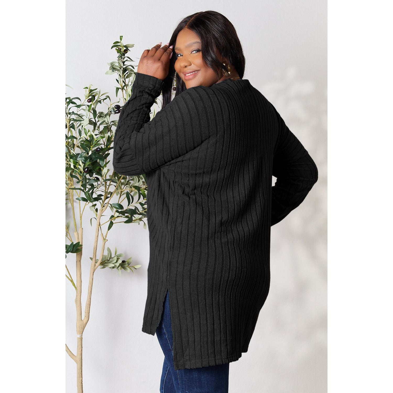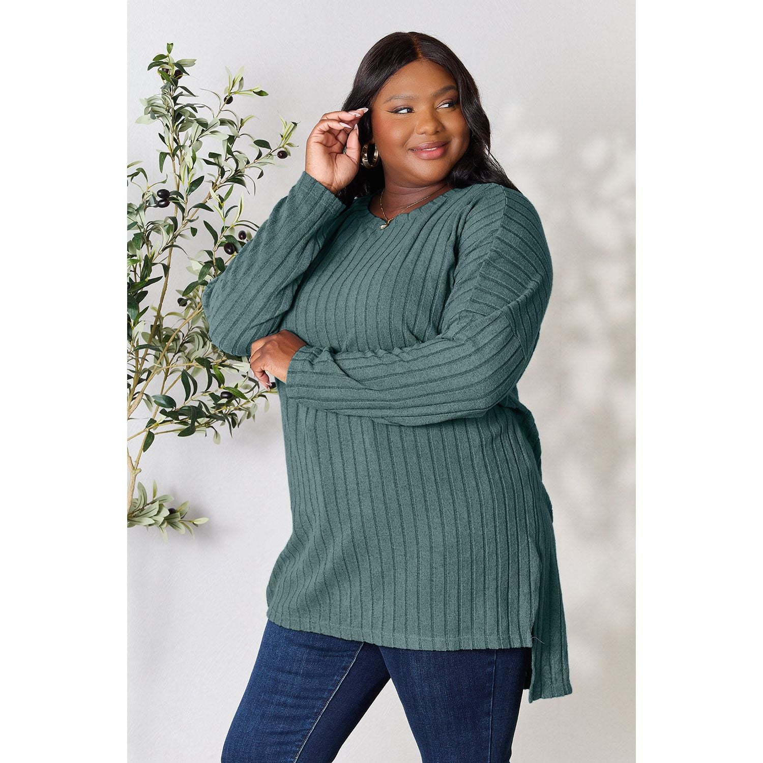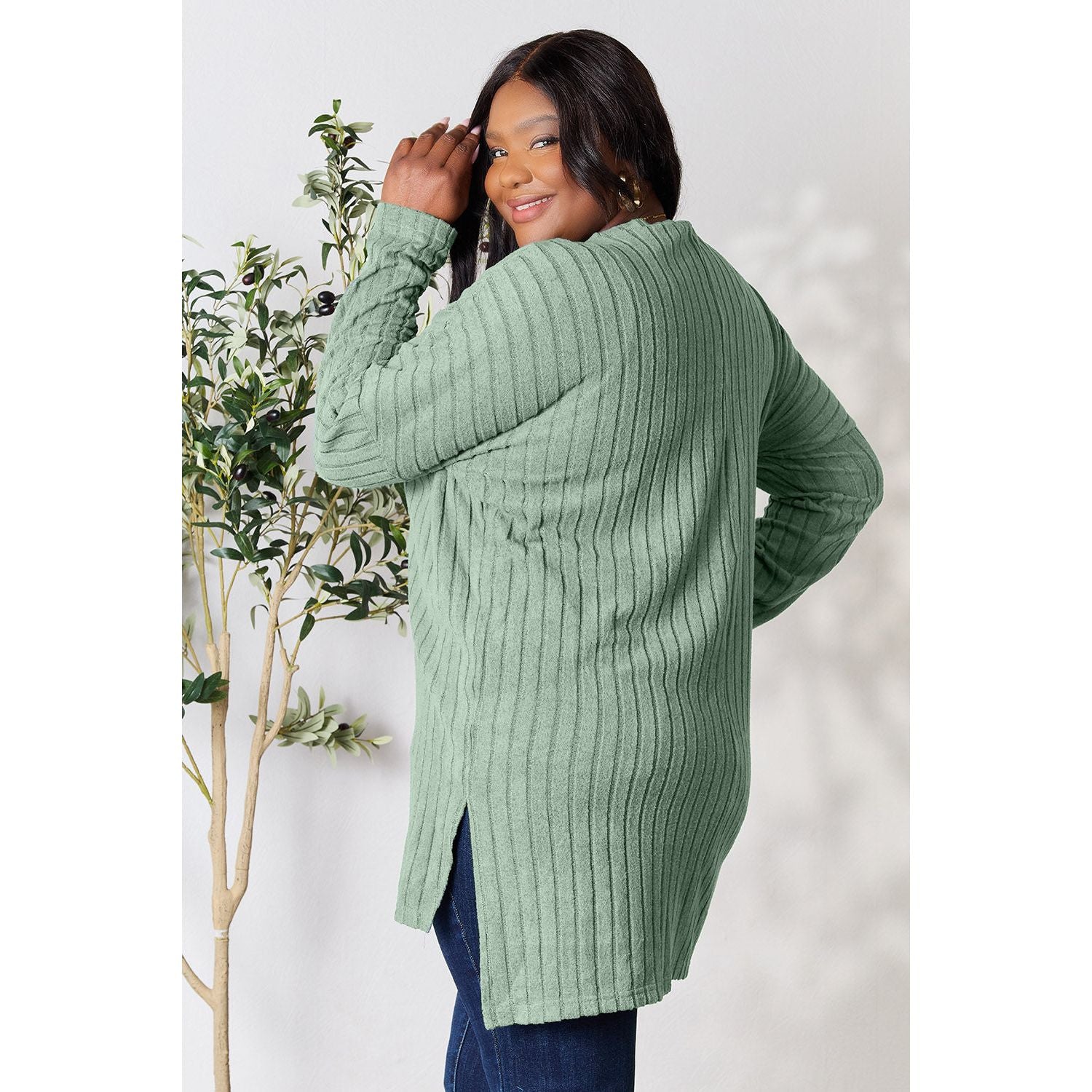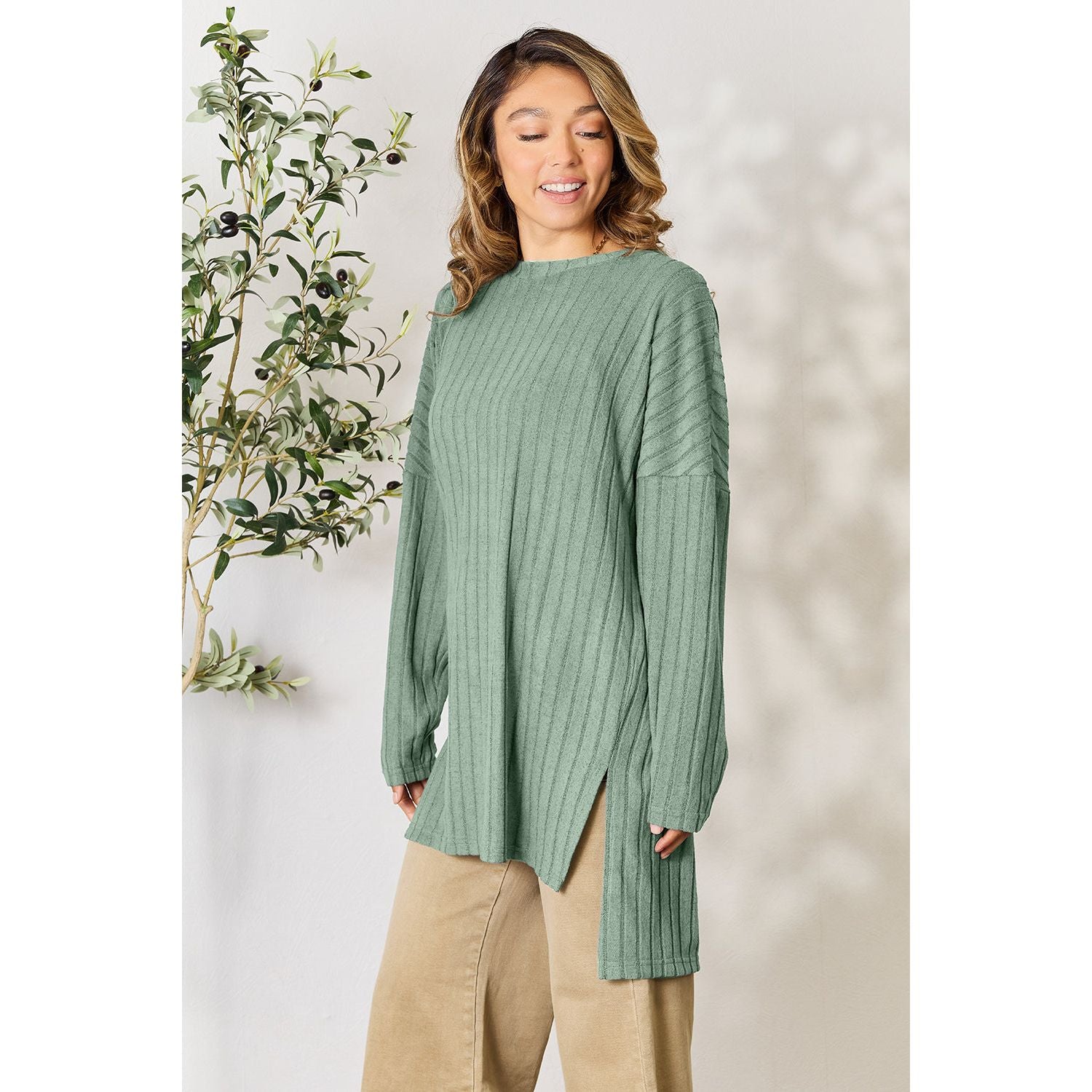Basic Bae Full Size Ribbed Round Neck Long Sleeve Slit Top