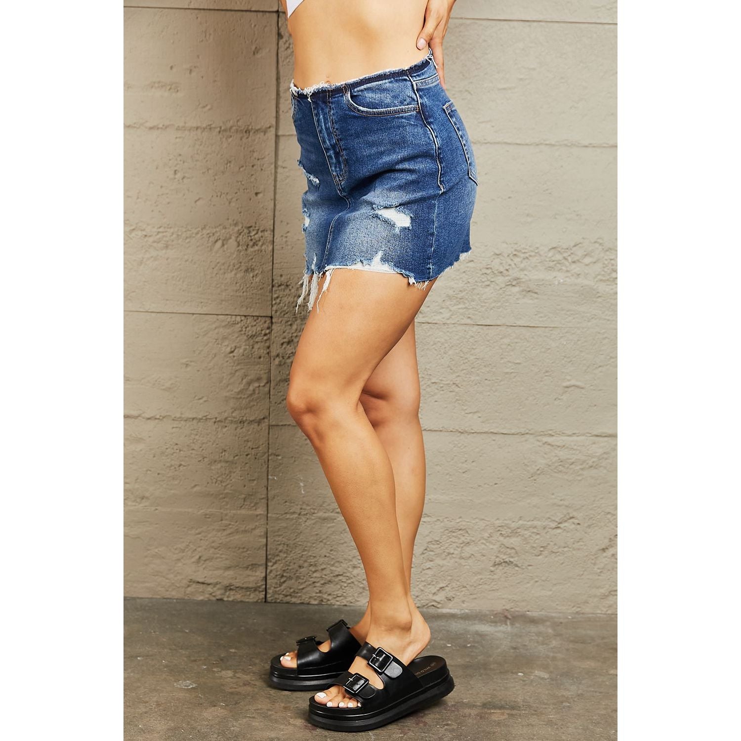 Embrace style and comfort with this trendy skirt, crafted from premium denim that hugs your curves just right. The high-waisted design cinches your waist, creating a flattering silhouette, while the distressed details add an edgy touch. Perfect for any casual occasion, this versatile mini skirt pairs effortlessly with your favorite tees, tanks, and blouses for a chic and effortless look that will turn heads wherever you go. Elevate your wardrobe with this essential denim piece that combines fashion-forward elements with timeless appeal.