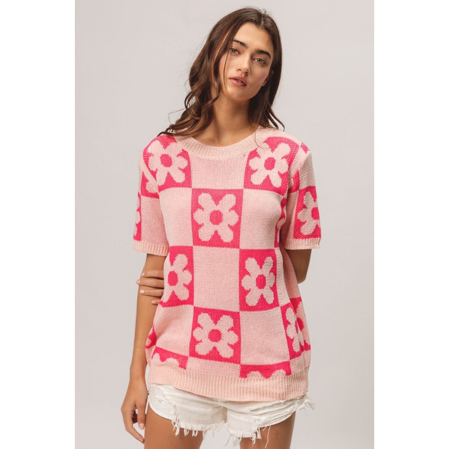 Make a bold statement with this BiBi Flower Checker Pattern Short Sleeve Sweater, featuring a unique design that combines floral and checker patterns for a modern and stylish look. The short sleeves add a touch of versatility, perfect for transitioning between seasons or layering with other pieces. This eye-catching sweater is sure to stand out in any wardrobe, offering a chic and playful twist on a classic sweater silhouette. With its intricate pattern and comfortable fit, it's an ideal choice for adding a pop of personality to your outfit. Stay on-trend and make a fashion statement with this BiBi Flower Checker Pattern Short Sleeve Sweater that combines whimsy with sophistication.