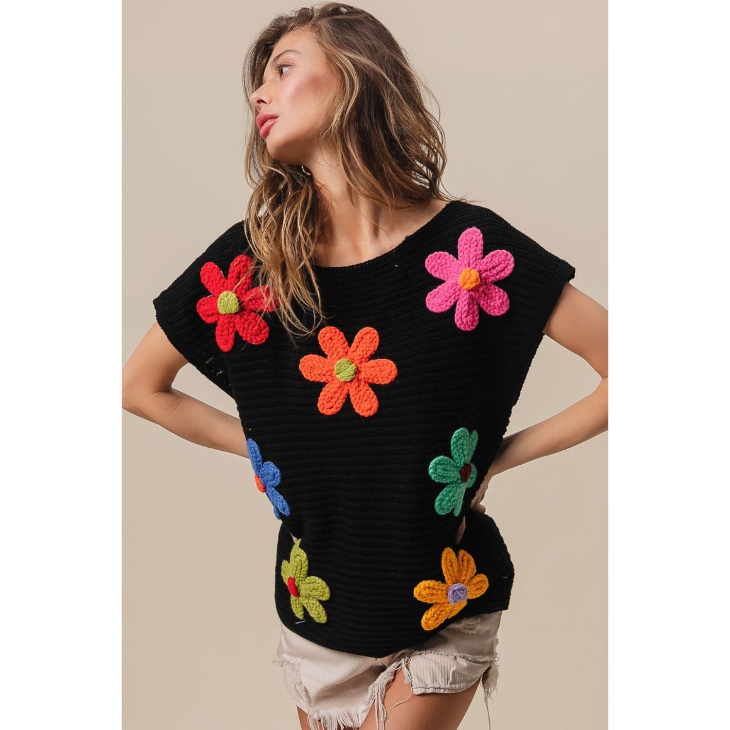 BiBi Flower Round Neck Cap Sleeve Knit Top
