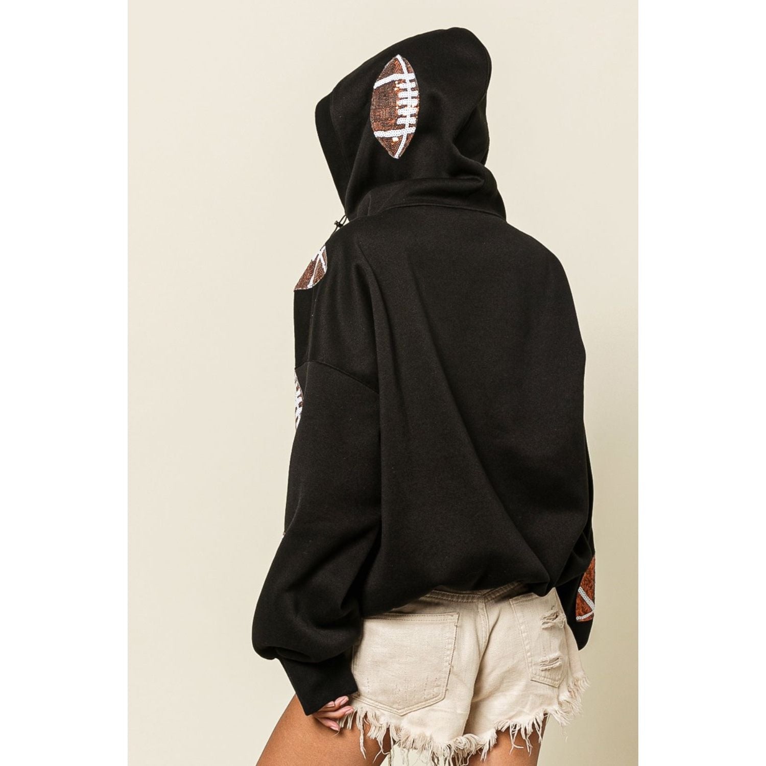 The Sequin Football Half Zip Hoodie is a fun and sporty addition to your wardrobe. Featuring sequin football embellishments and a convenient half zip design, this hoodie combines style with comfort. The playful sequin detail adds a touch of sparkle and personality, making it a great choice for game days or casual outings. Stay cozy and trendy while showcasing your love for football in this eye-catching hoodie.