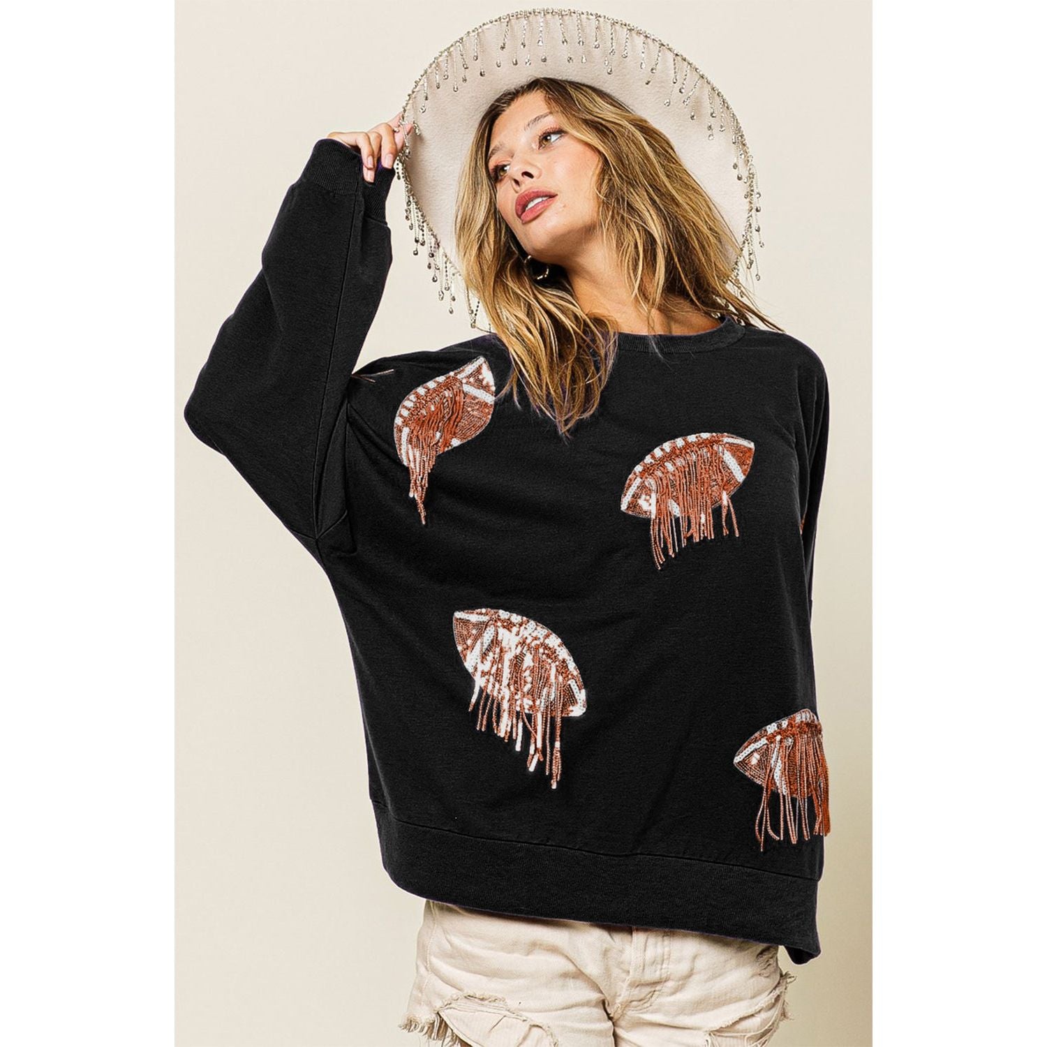 BiBi Sequin Fringe Football Patch Round Neck Sweatshirt