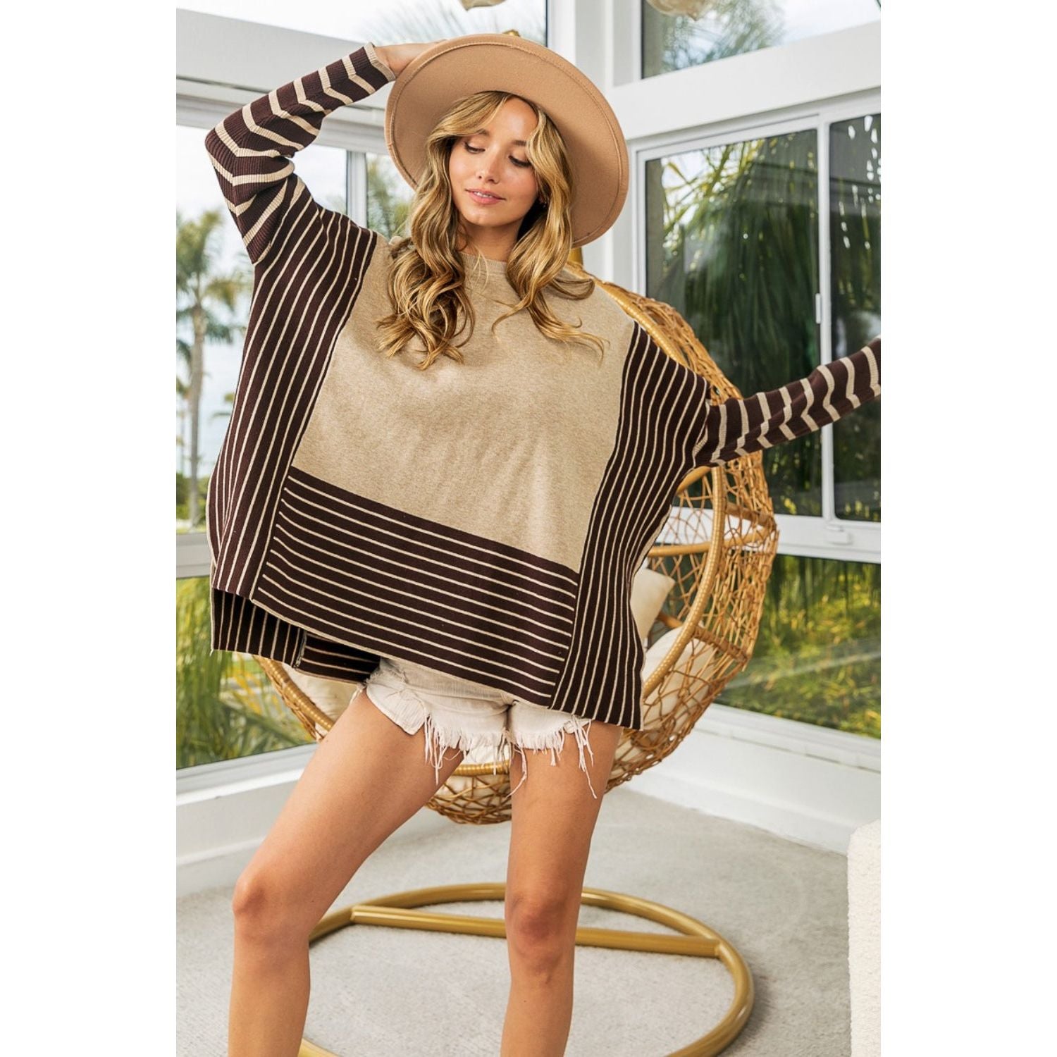 The striped contrast long sleeve slit top is a trendy choice that effortlessly combines style and flair. With its unique striped design and contrasting details, it adds a playful and eye-catching element to your outfit. The long sleeves and side slits provide a comfortable and flattering fit, making it a versatile piece for any occasion. Whether paired with jeans for a casual day out or dressed up with a skirt and heels for a night on the town, the striped contrast long sleeve slit top is sure to make a stylish statement wherever you go.