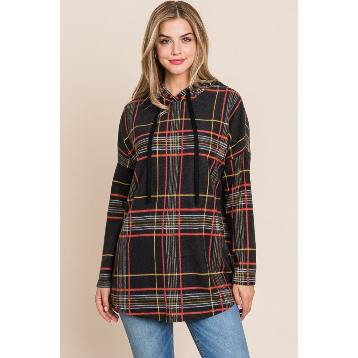 The Drawstring Plaid Long Sleeve Hoodie combines casual comfort with a touch of trendy style. The classic plaid pattern adds a modern twist to this laid-back hoodie, while the drawstring detail allows you to adjust the hood for a perfect fit. With long sleeves for extra warmth and a relaxed fit, this hoodie is perfect for cozy days at home or casual outings. Pair it with jeans and sneakers for a sporty-chic look that is both comfortable and stylish.