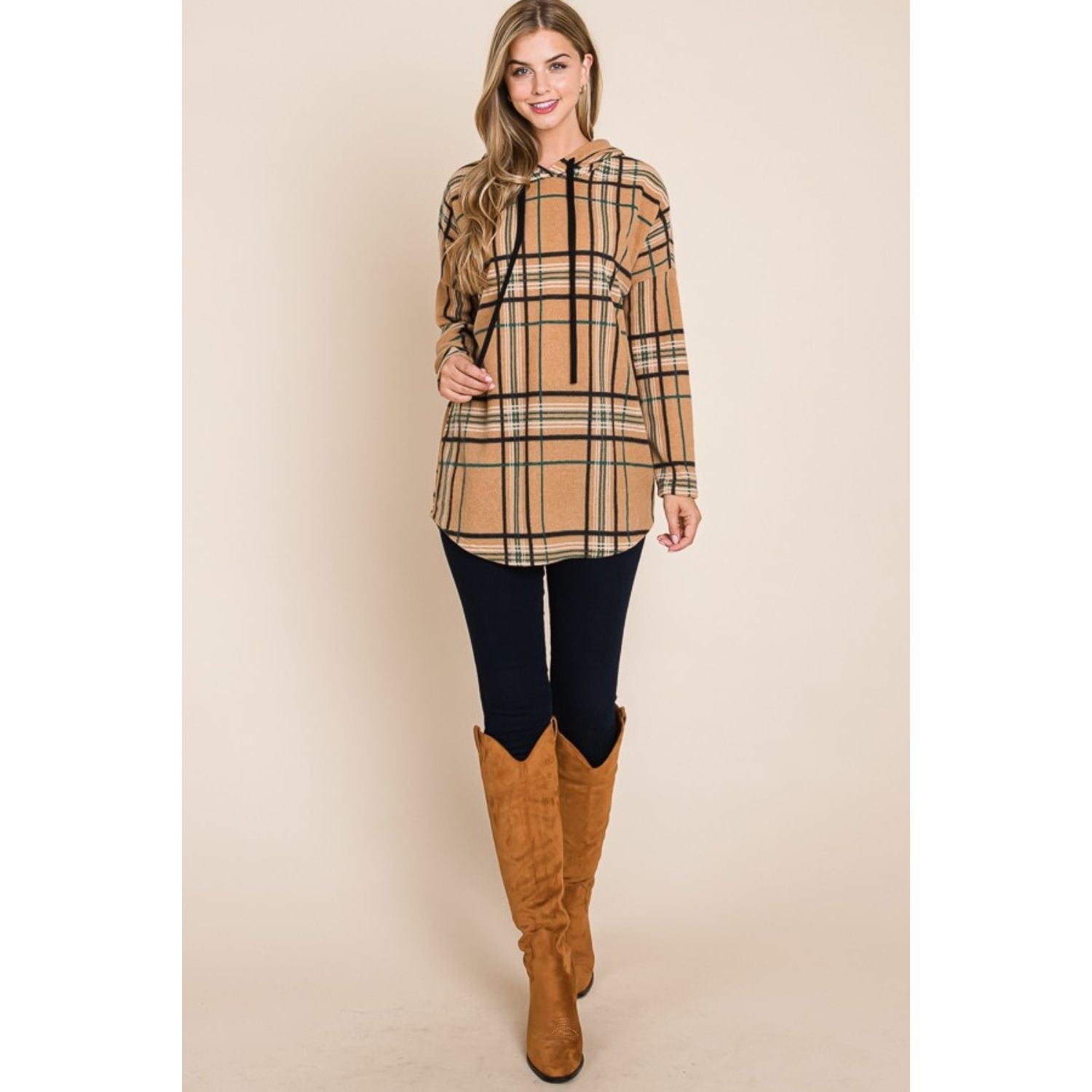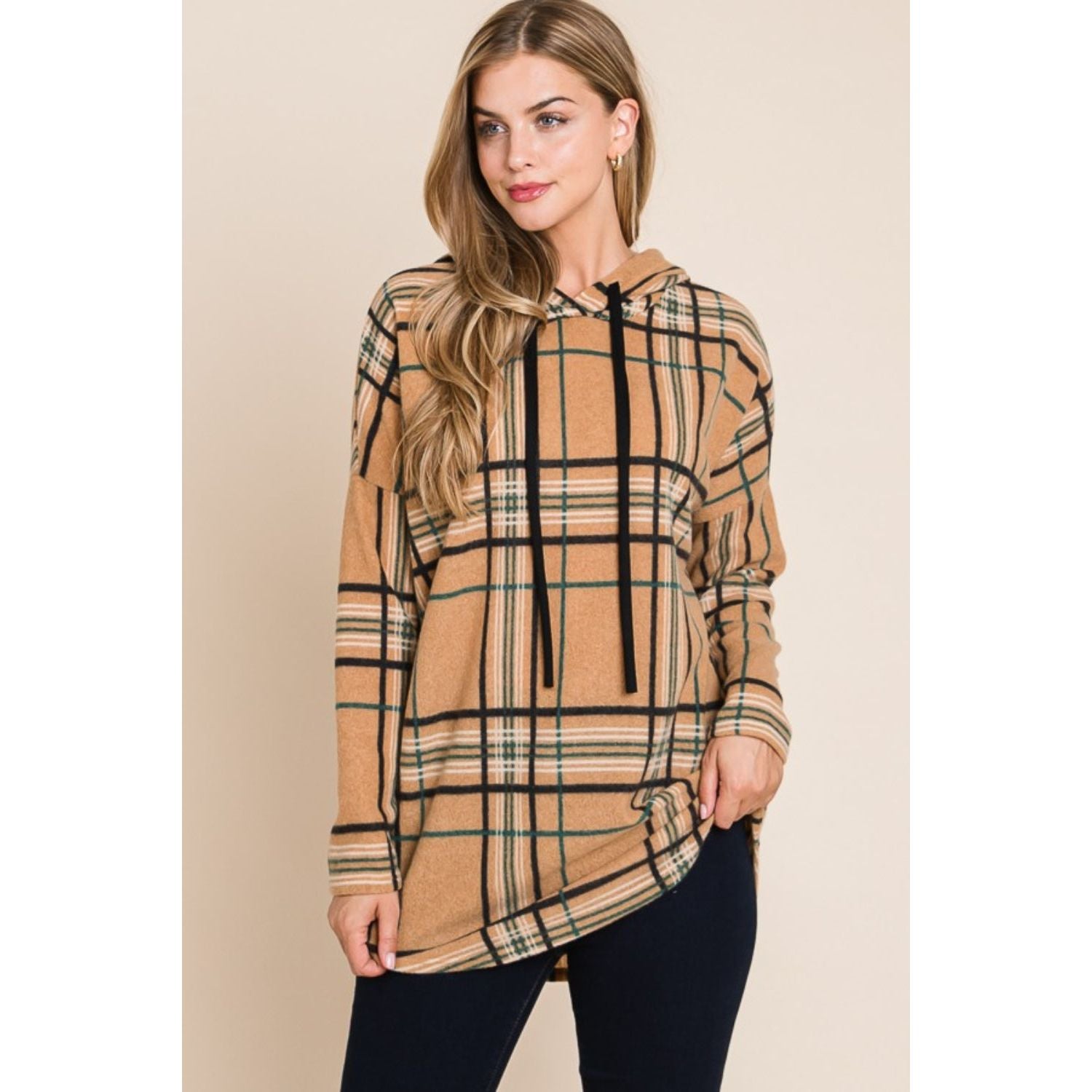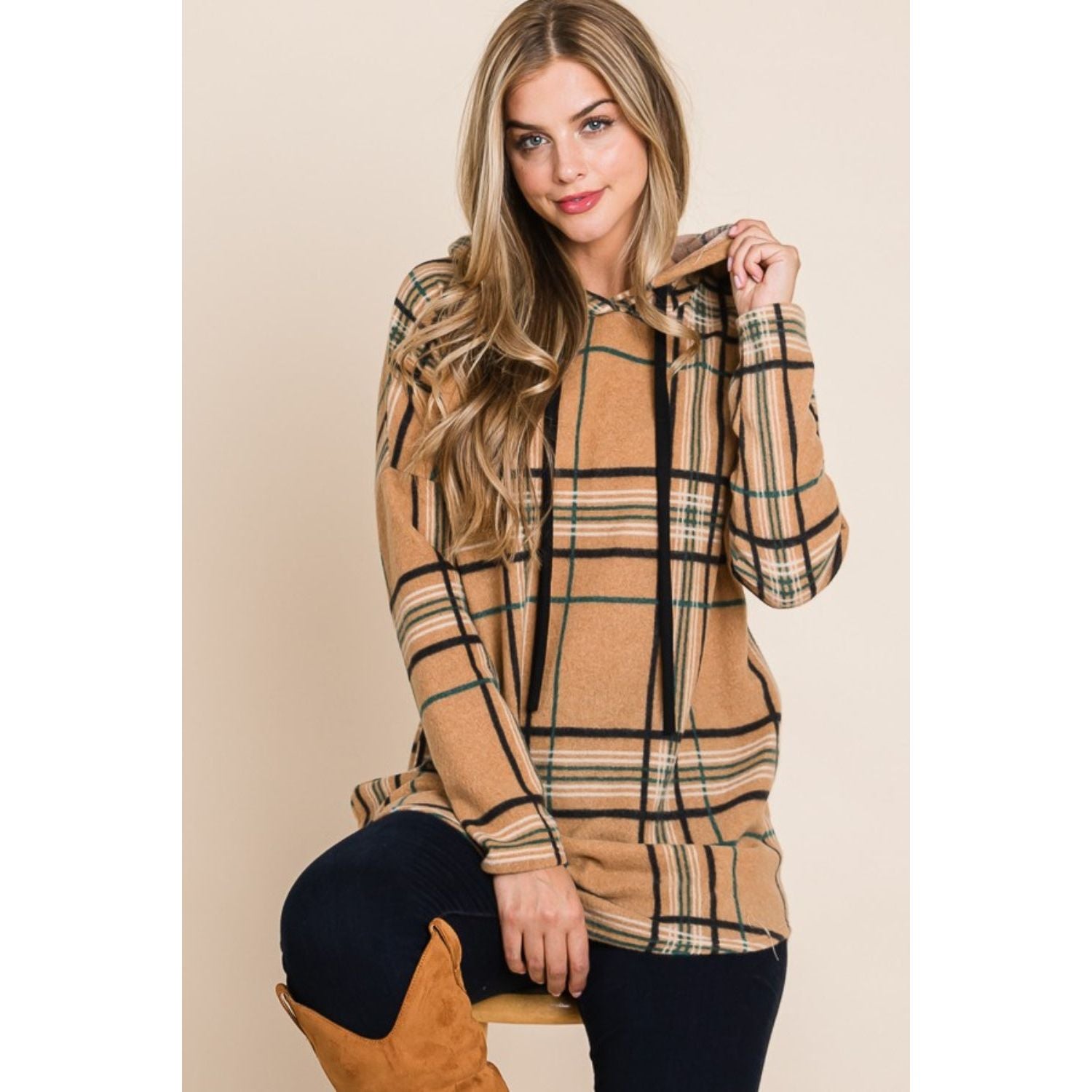 BOMBOM Drawstring Plaid Long Sleeve Hoodie