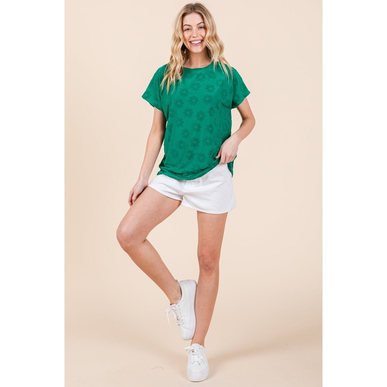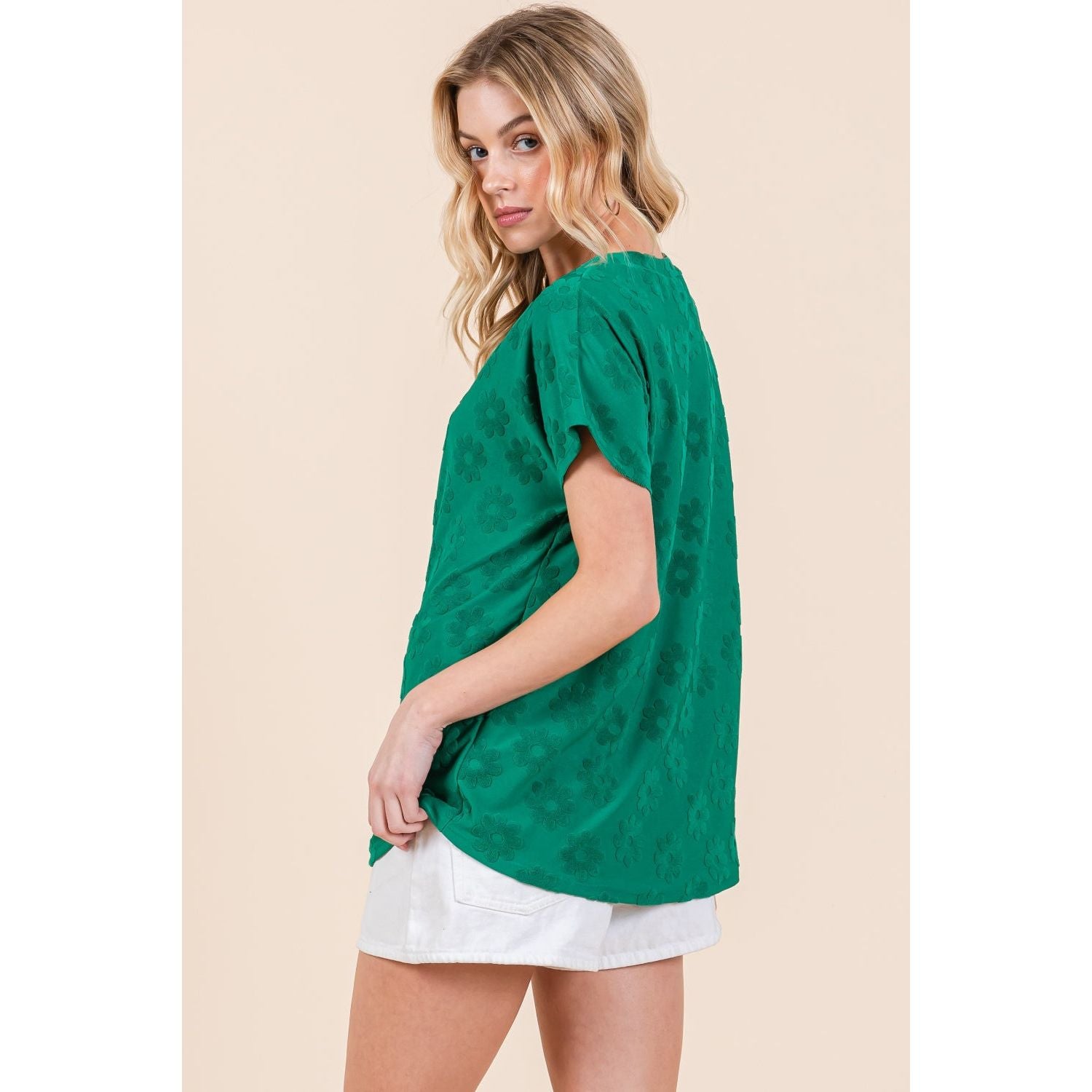The Textured Floral Pattern Short Sleeve T-Shirt is a lovely and versatile addition to your casual wardrobe. The delicate floral pattern adds a touch of femininity to the classic design. The textured fabric brings depth and interest to the overall look. With short sleeves, this shirt is perfect for warmer days and can be easily layered under a cardigan or jacket. Pair it with shorts or jeans for a relaxed and effortless outfit. Elevate your everyday style with this charming Textured Floral Pattern Short Sleeve T-Shirt today!