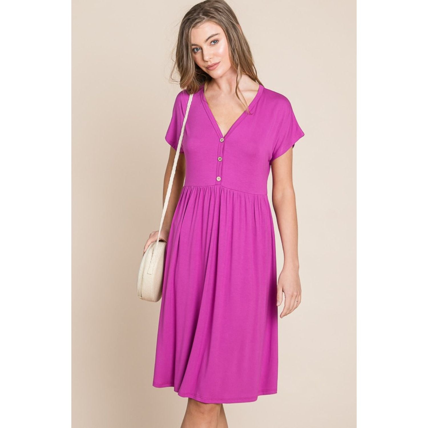 This V-Neck Button Detail Dress is a stylish and versatile piece made from soft rayon spandex fabric, ensuring both comfort and a flattering fit. The V-neckline and button detailing add a touch of sophistication to the dress, making it perfect for various occasions. Elevate your wardrobe with this chic and comfortable dress that combines style and comfort effortlessly.