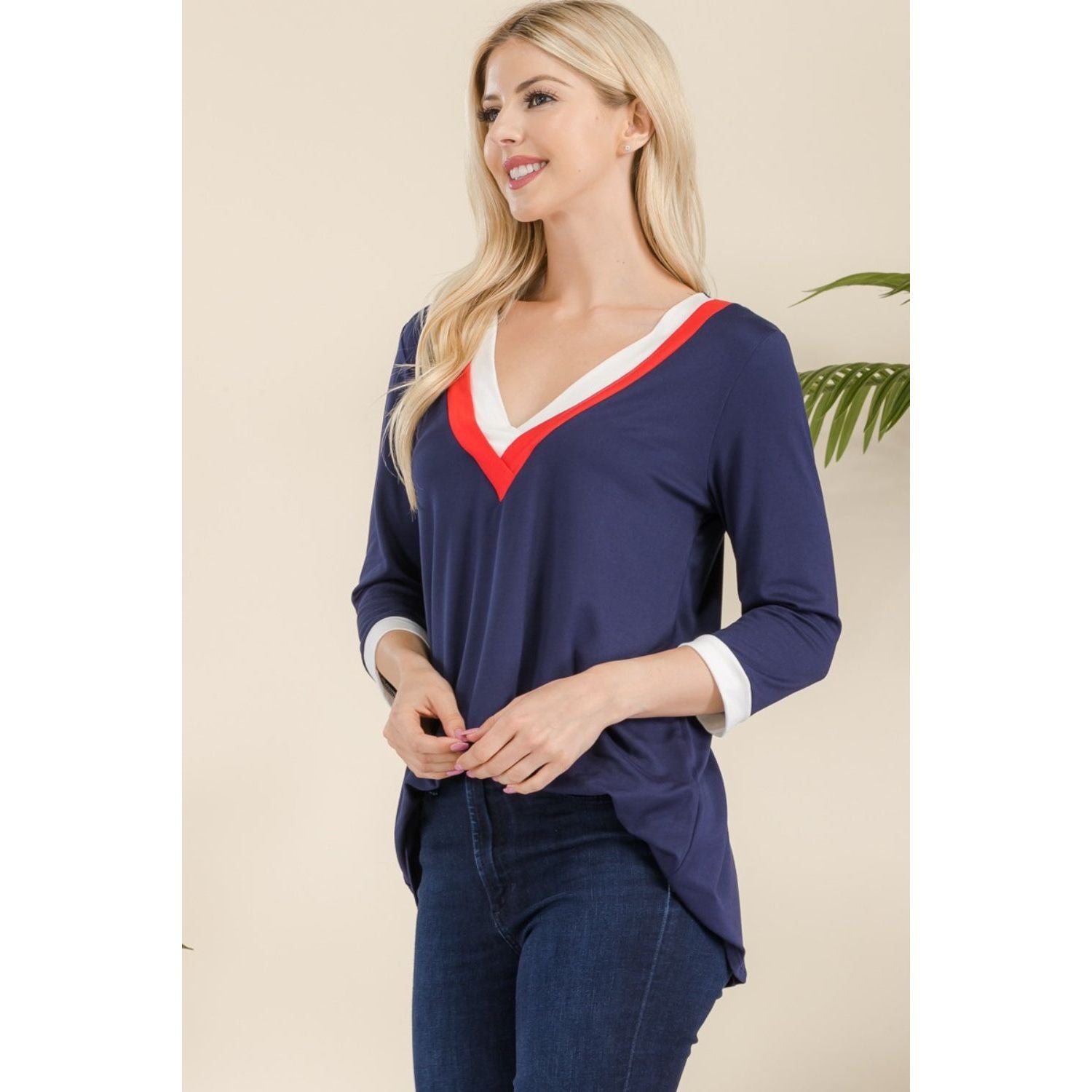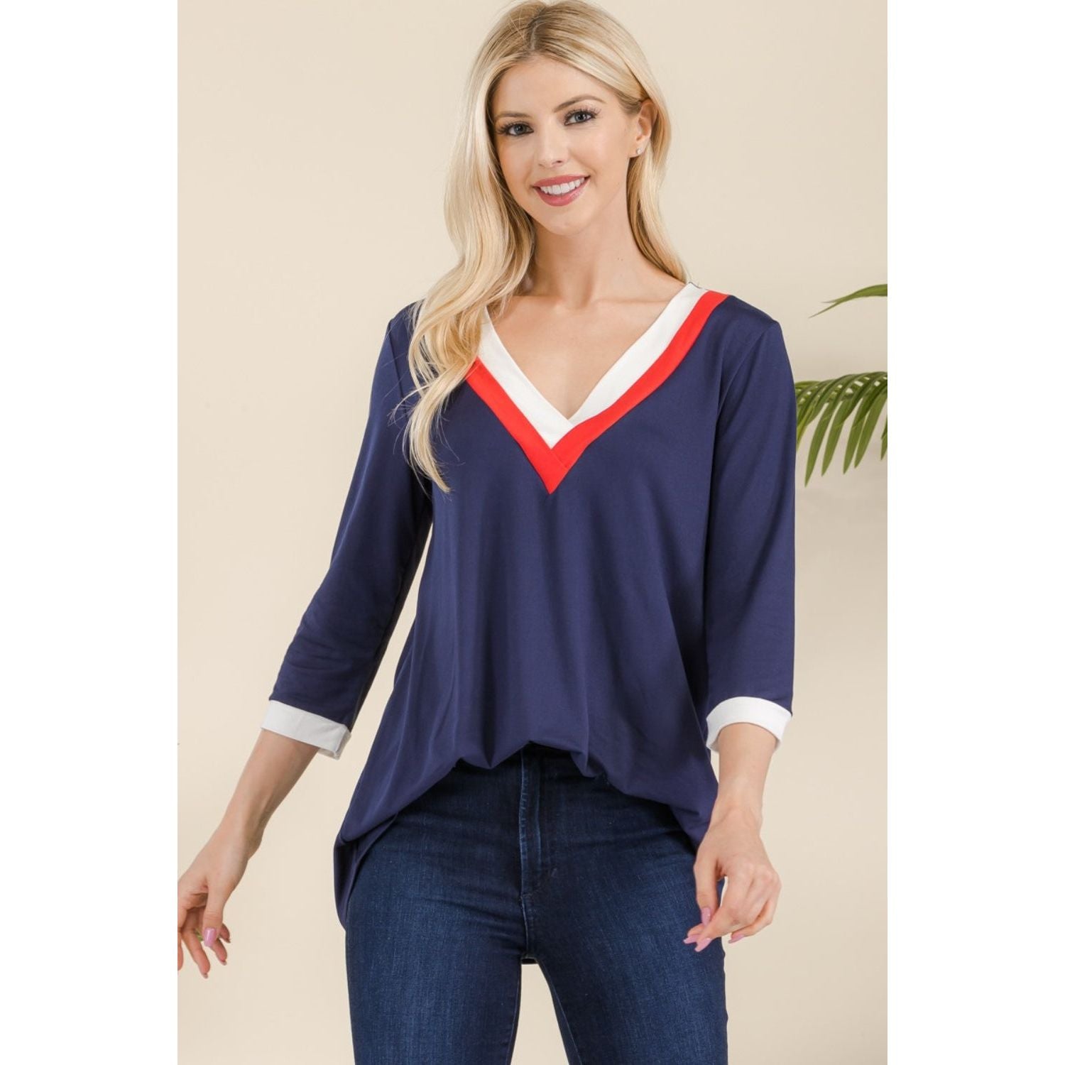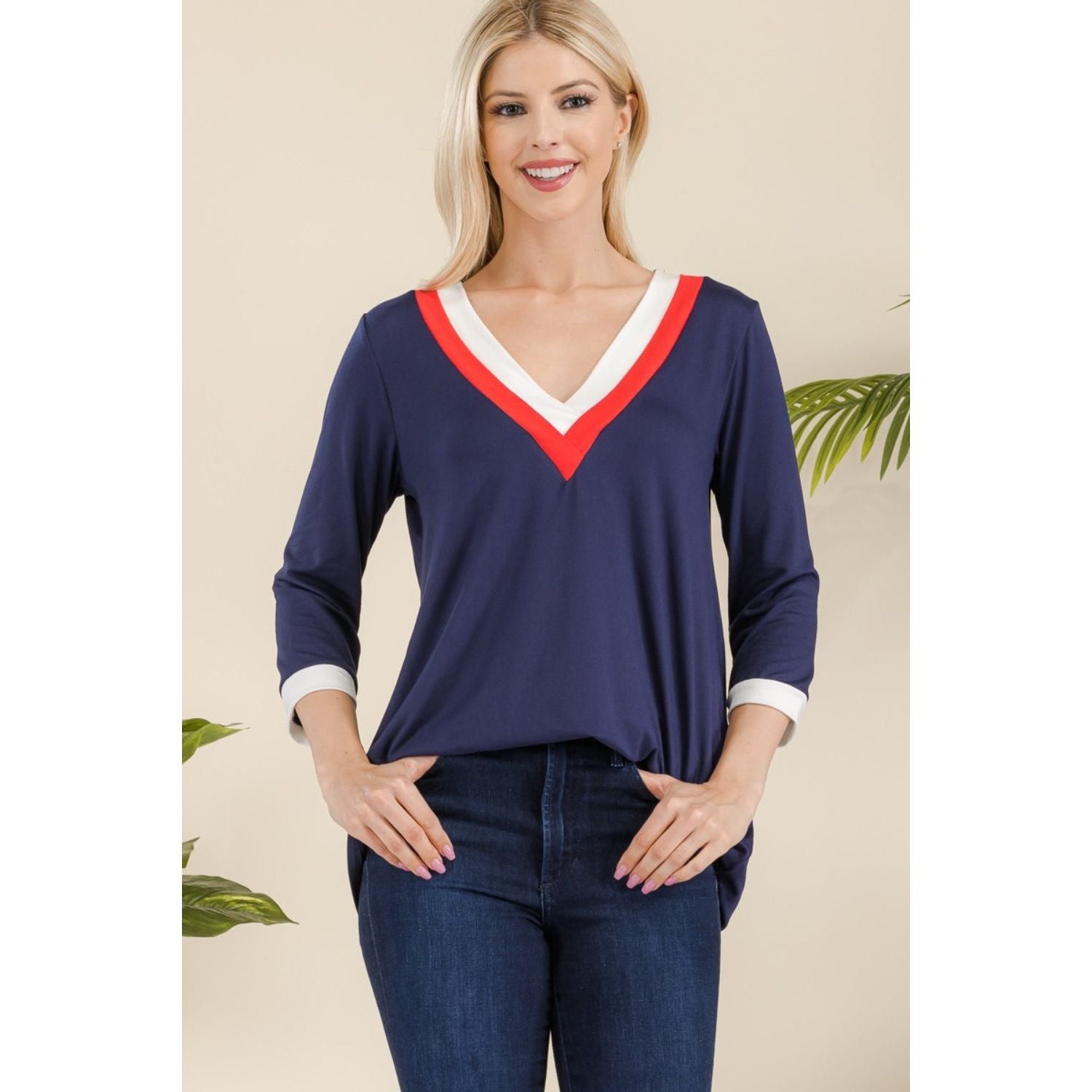 This style comes in a classic tri-color combination. The V-neckline has layered tri-color detail, that gives it a preppy look. The lightweight material makes this top a year round piece. The solid with the pop of bright color makes this top a statement.