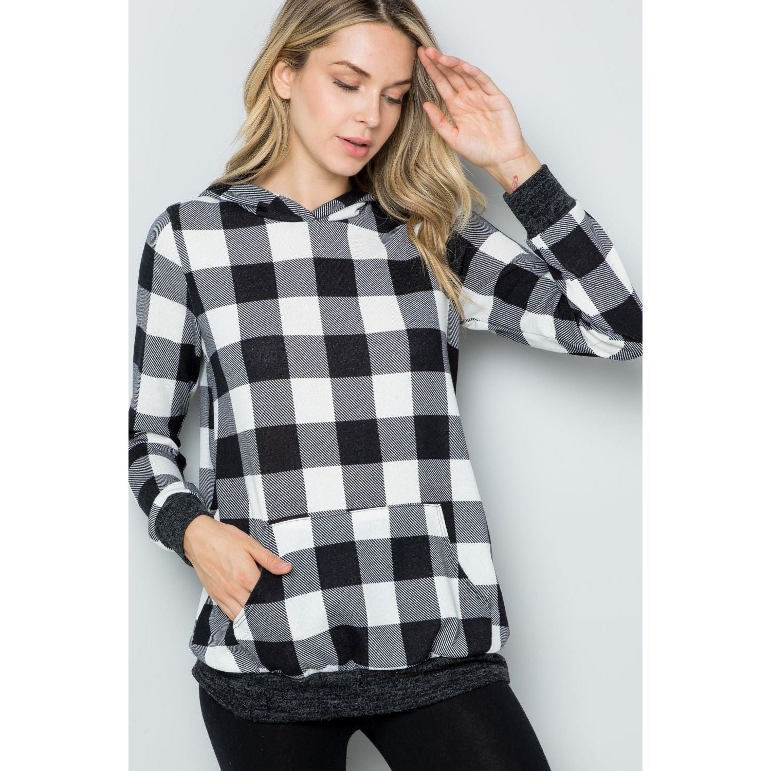 Stay cozy and stylish with this contrast plaid long sleeve hoodie. The combination of contrasting plaids adds a unique and trendy touch to the classic hoodie design. The long sleeves provide extra warmth and comfort, perfect for cooler days. The hoodie detail adds a casual and laid-back vibe to your outfit. Pair it with your favorite jeans or leggings for a relaxed yet fashionable look. Elevate your casual wardrobe with this chic and contemporary contrast plaid hoodie.