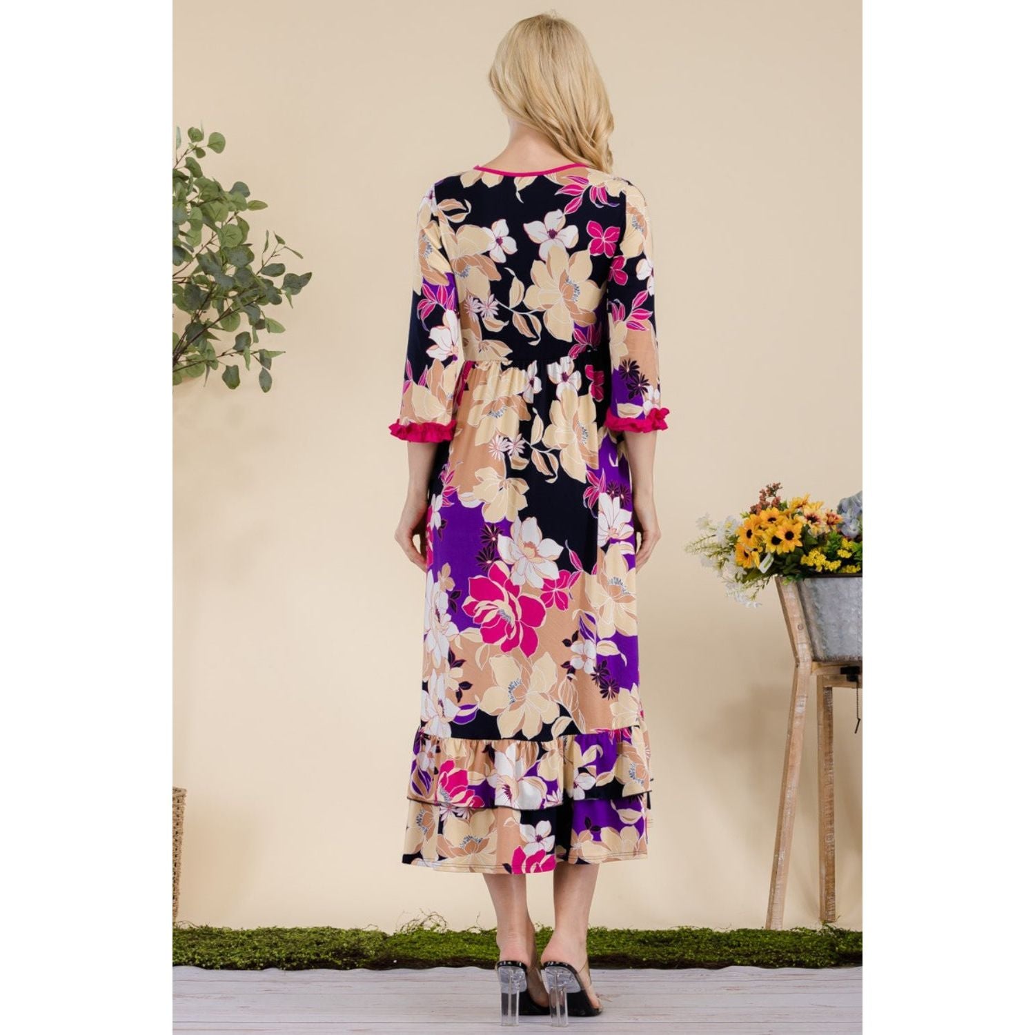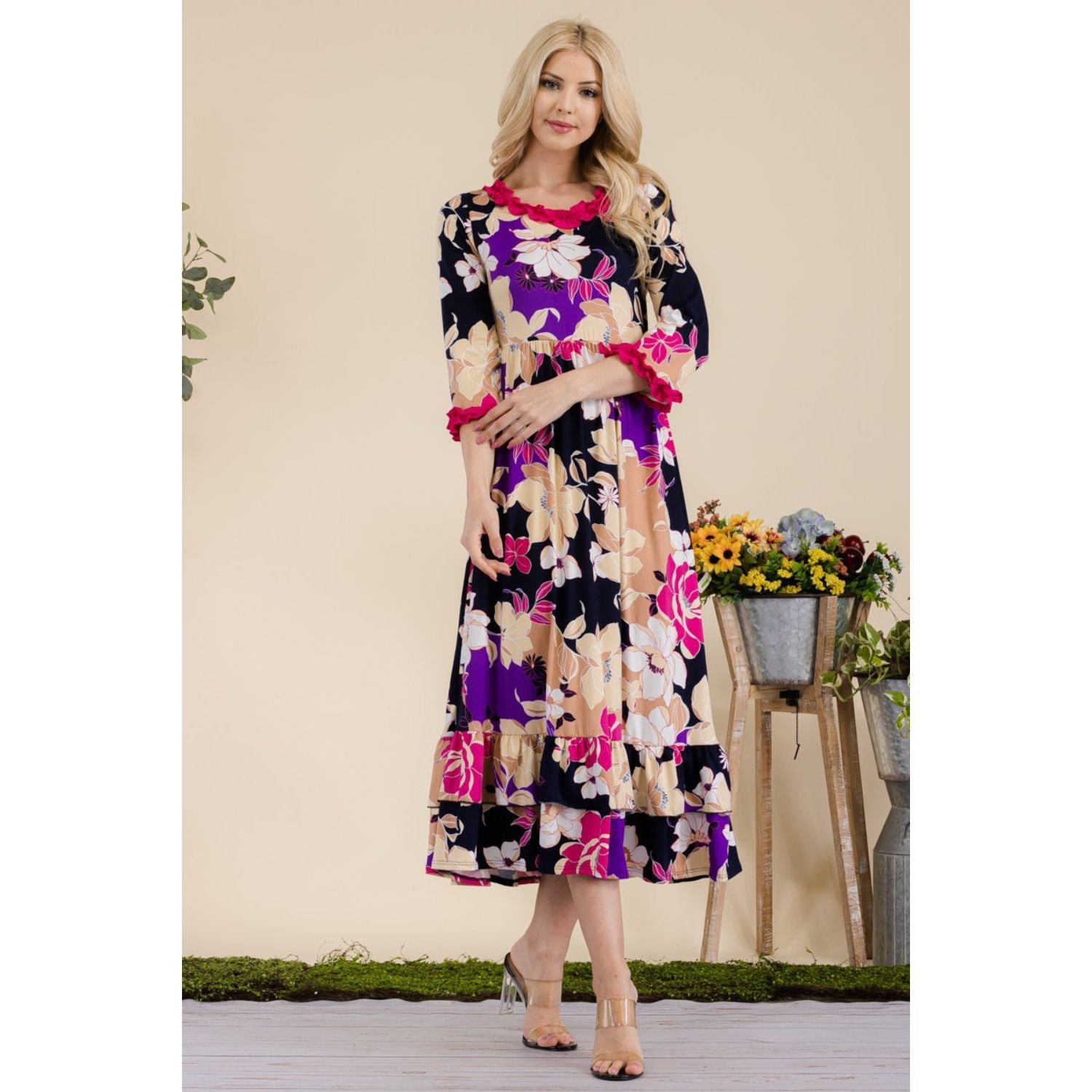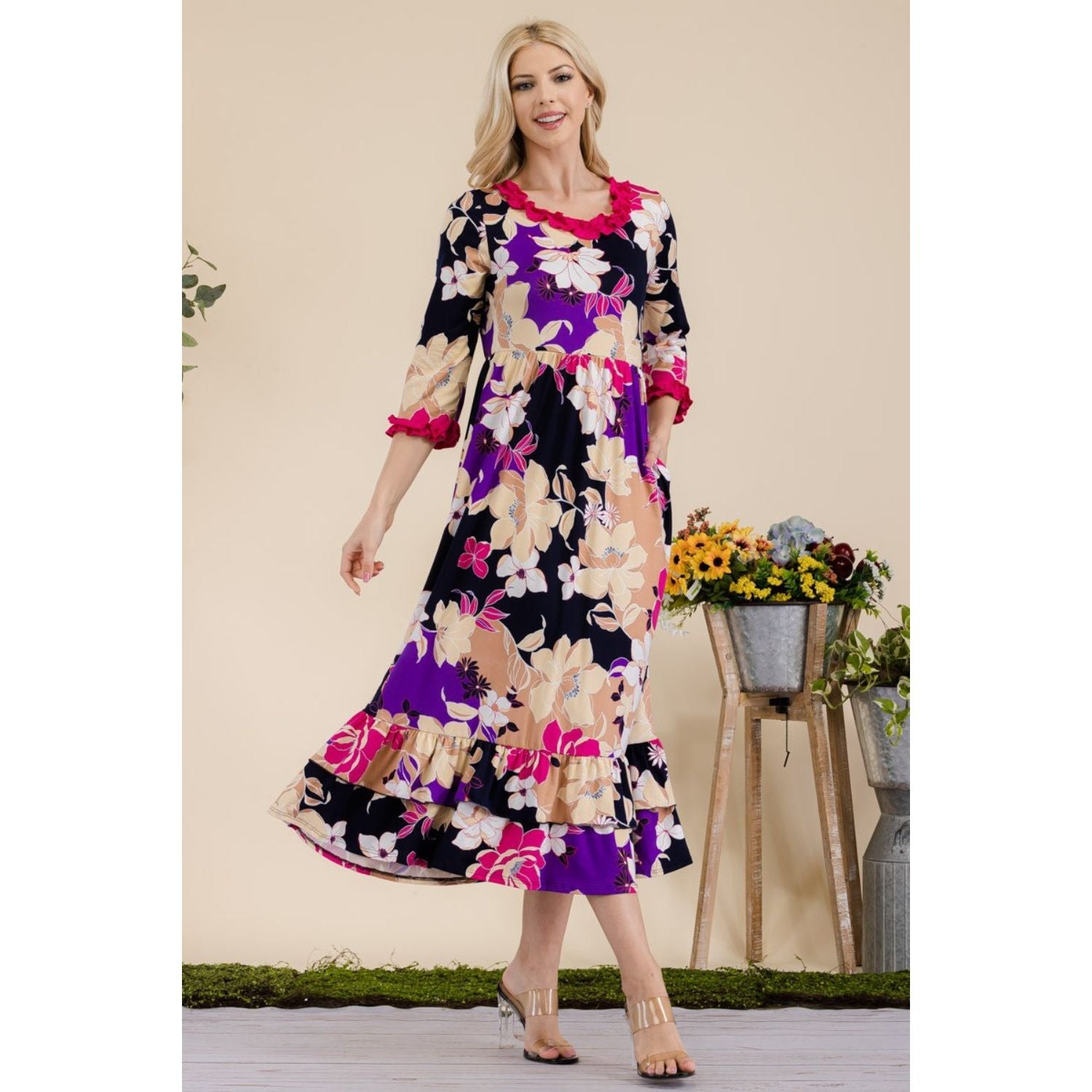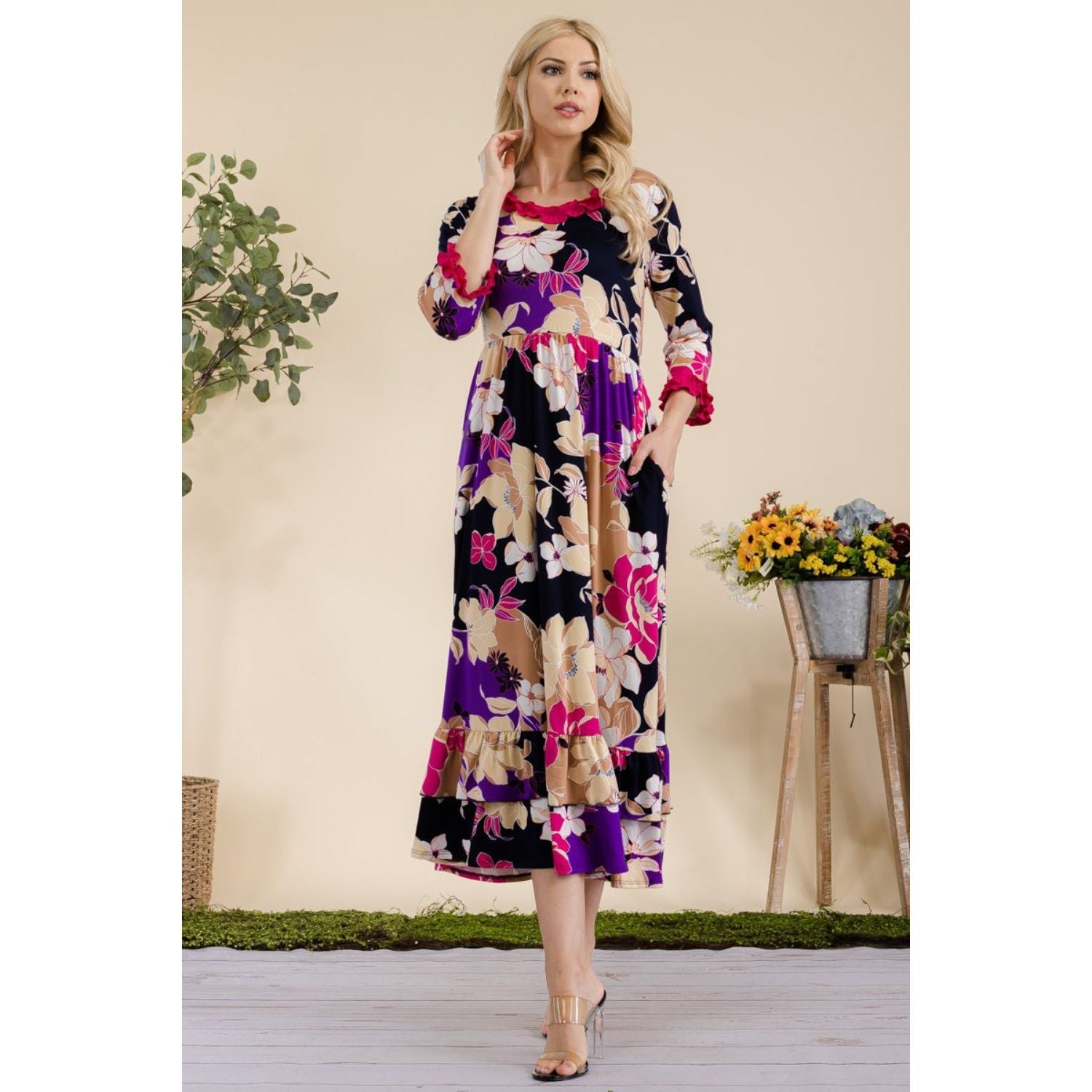 This modest A-line floral dress is a recent addition to our collection, featuring a romantic neckline with fuchsia ruffle detail, a high elastic waistband for comfort, convenient side pockets, and a double-layered ruffle hemline. Crafted from the softest material, this dress offers a true-to-size fit that is both comfortable and stylish. Make a statement at your special occasions by wearing this versatile and elegant dress.
