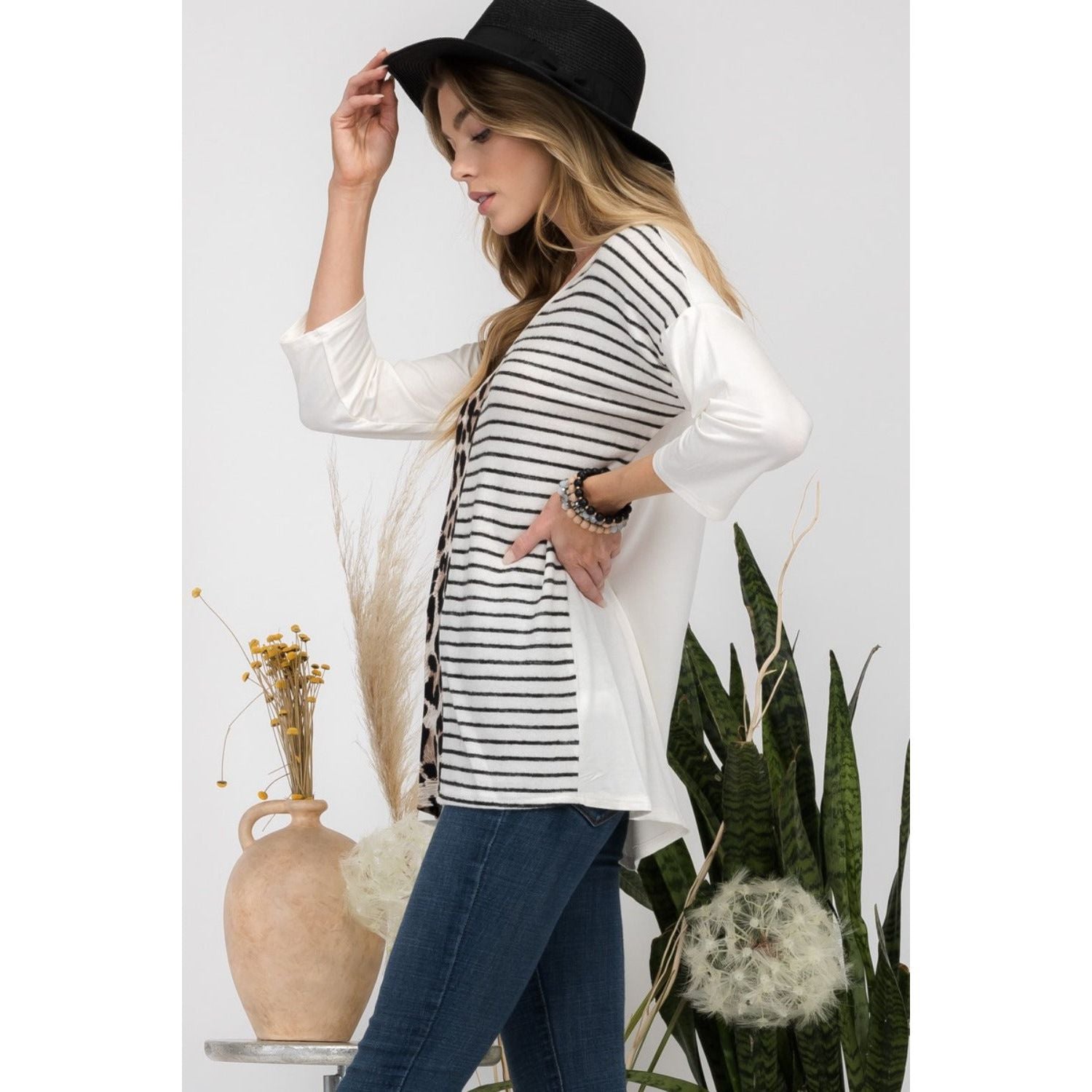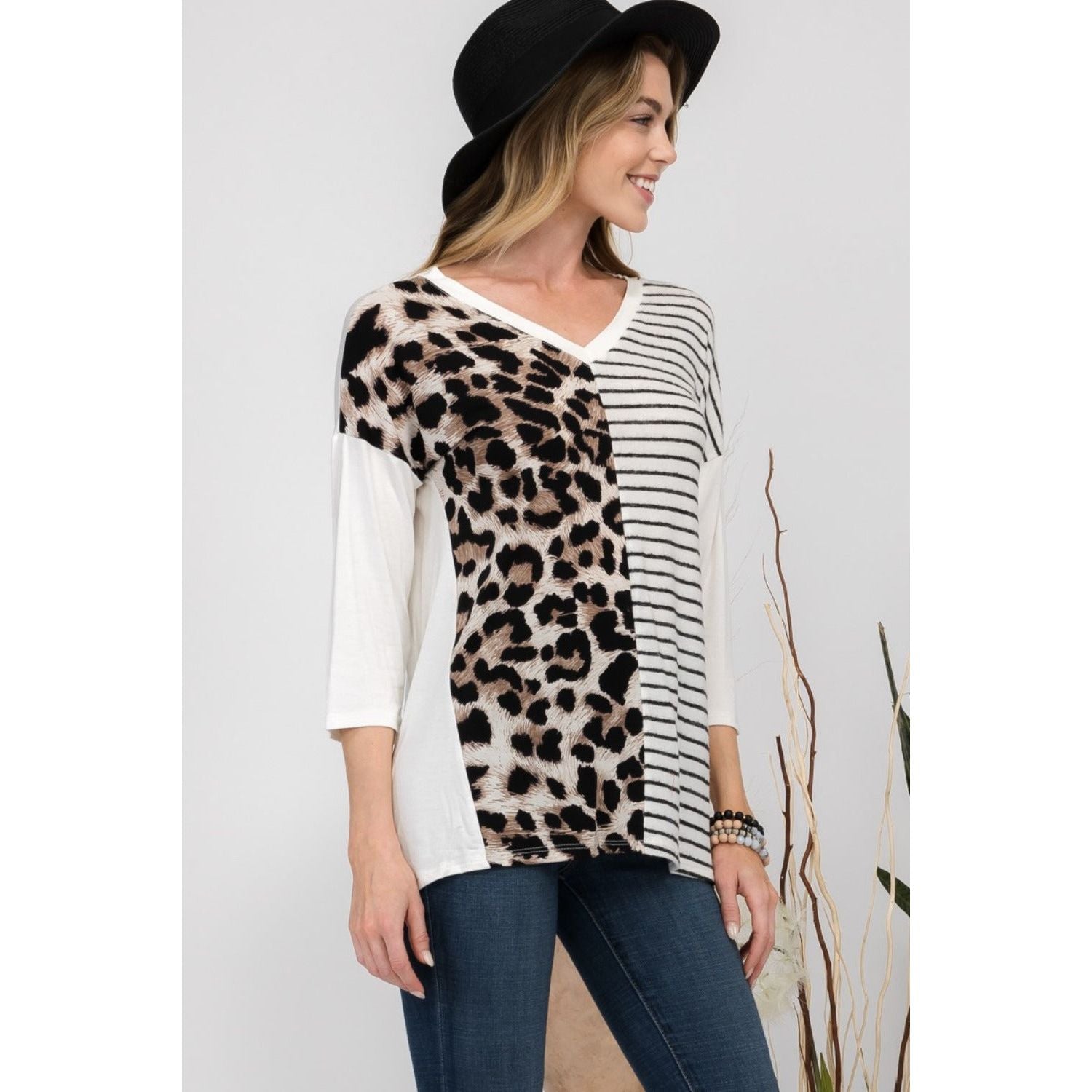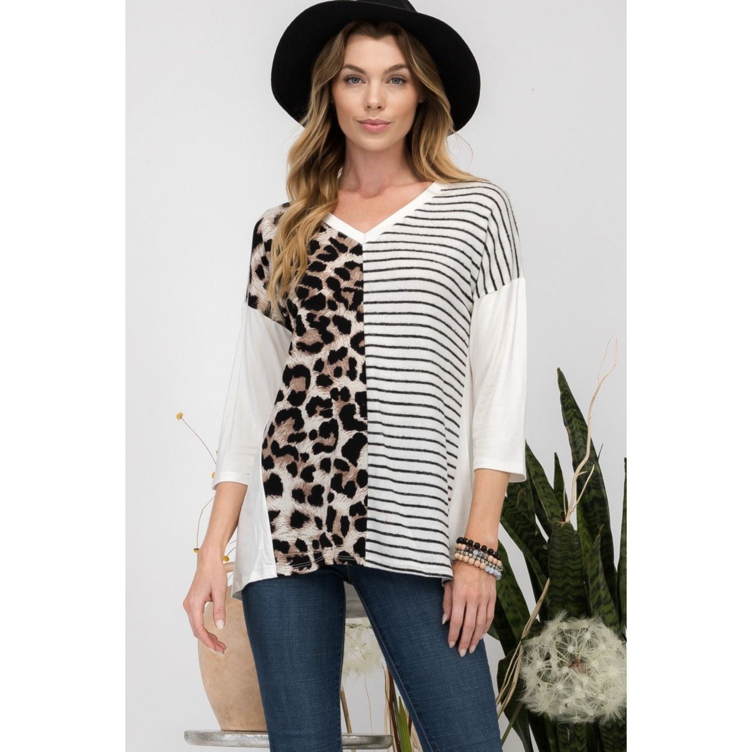 Celeste Full Size Front Leopard and Striped Print V-Neck T-Shirt