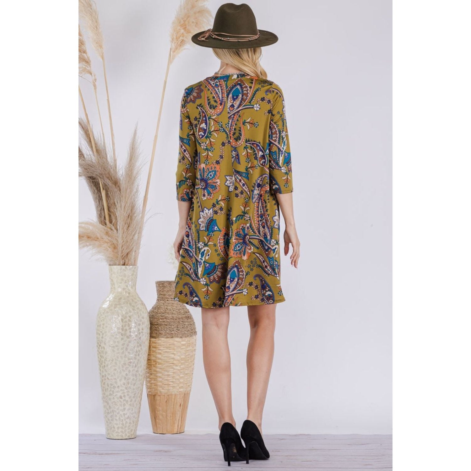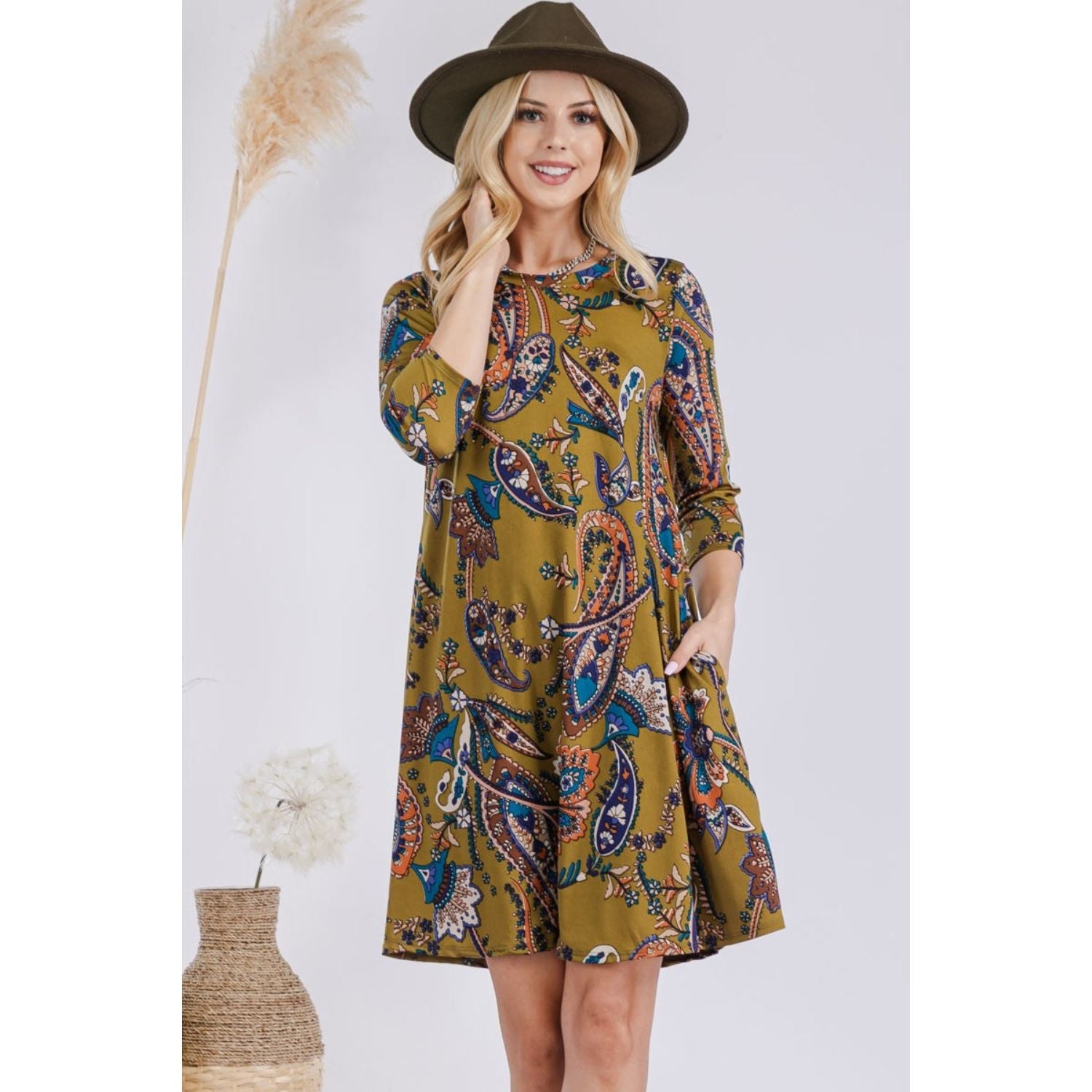 Celeste Full Size Paisley Print Round Neck Dress with Pockets
