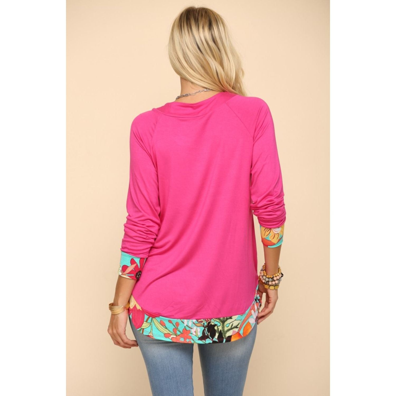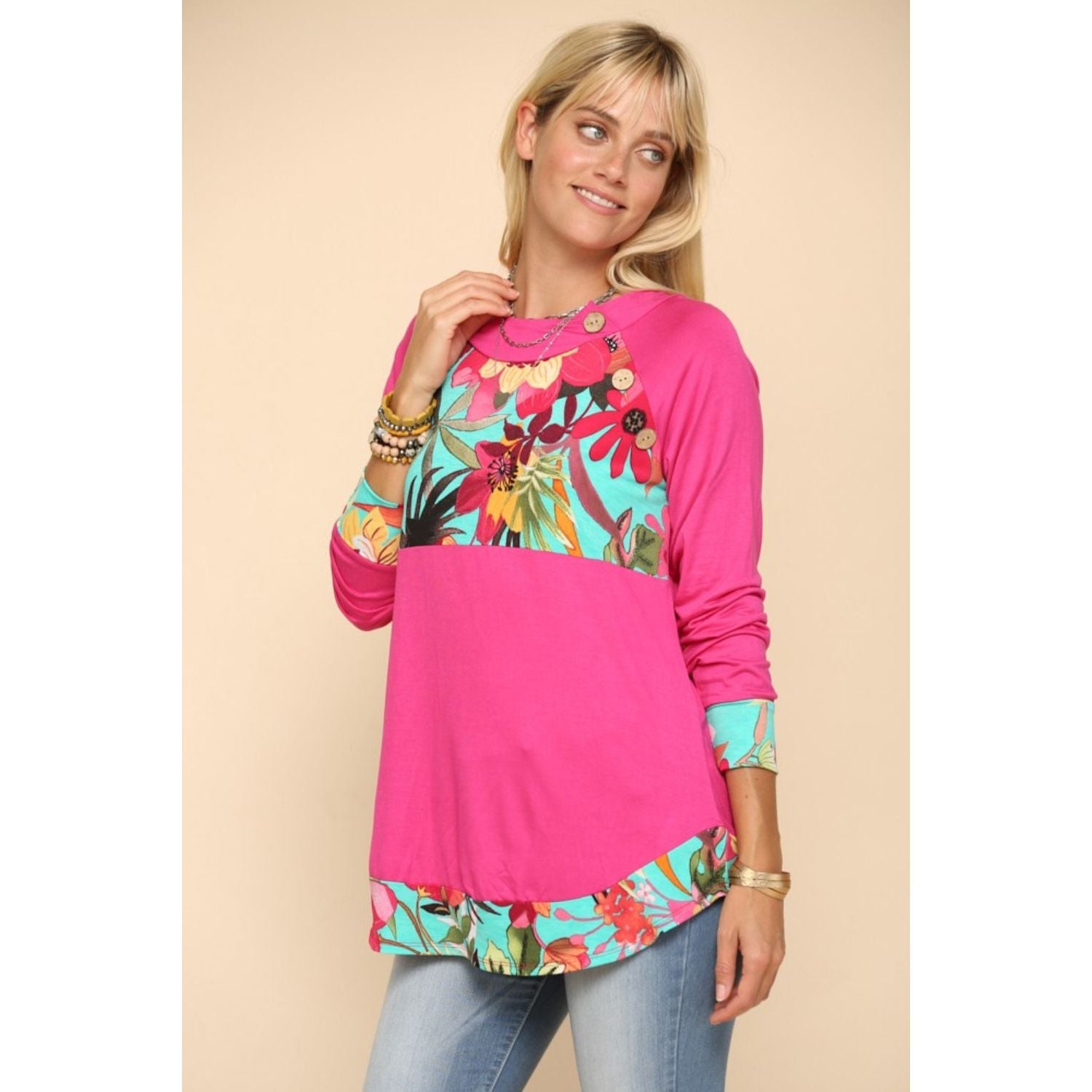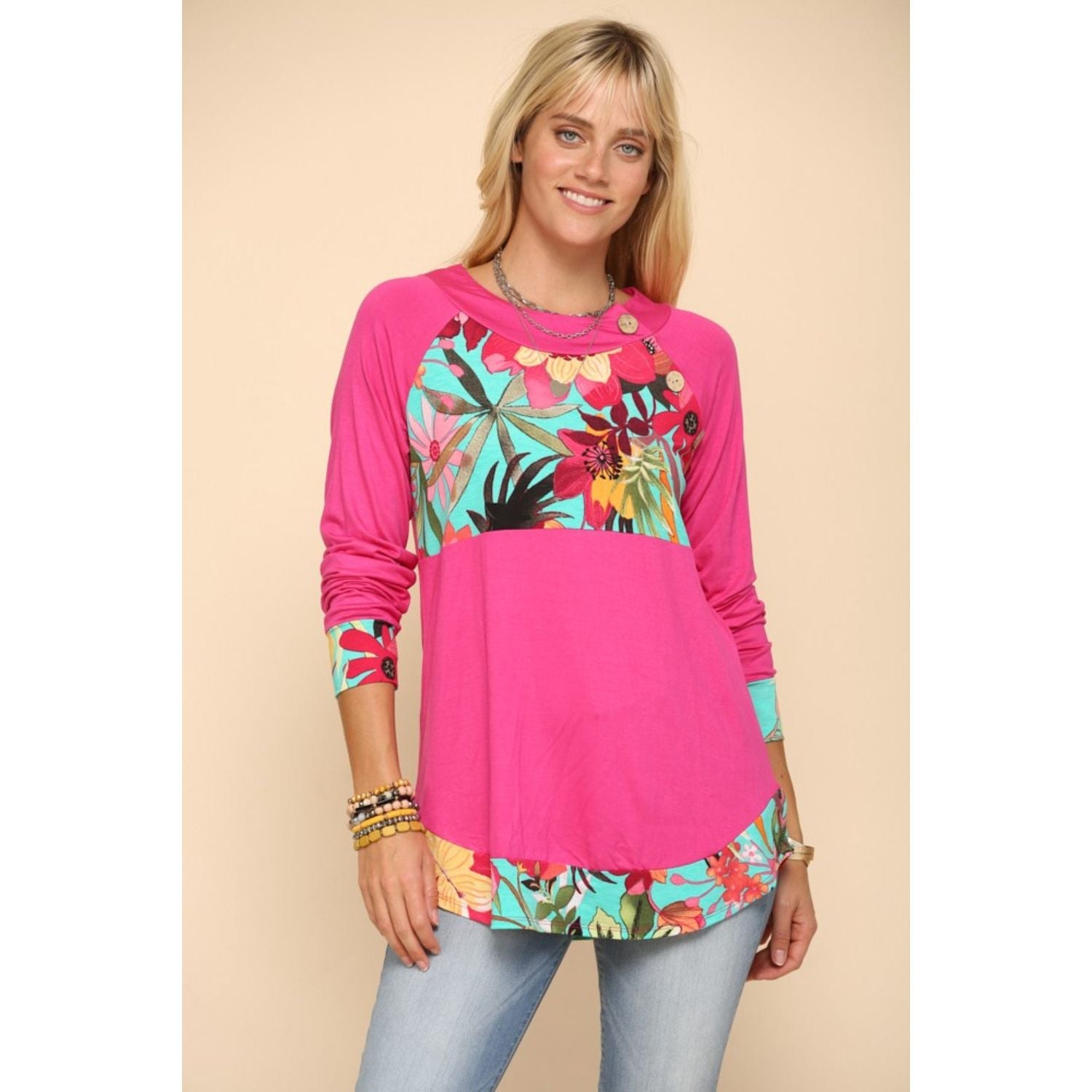 This gorgeous top features a vibrant tropical print complemented by strategically placed solid color blocking. The raglan style adds a casual vibe, while the button detailing on the raglan shoulder line adds an elegant touch. The versatile color palette makes it easy to coordinate this top with any outfit. Elevate your look with the striking combination of prints and solid colors, creating a stylish and eye-catching ensemble for any occasion.