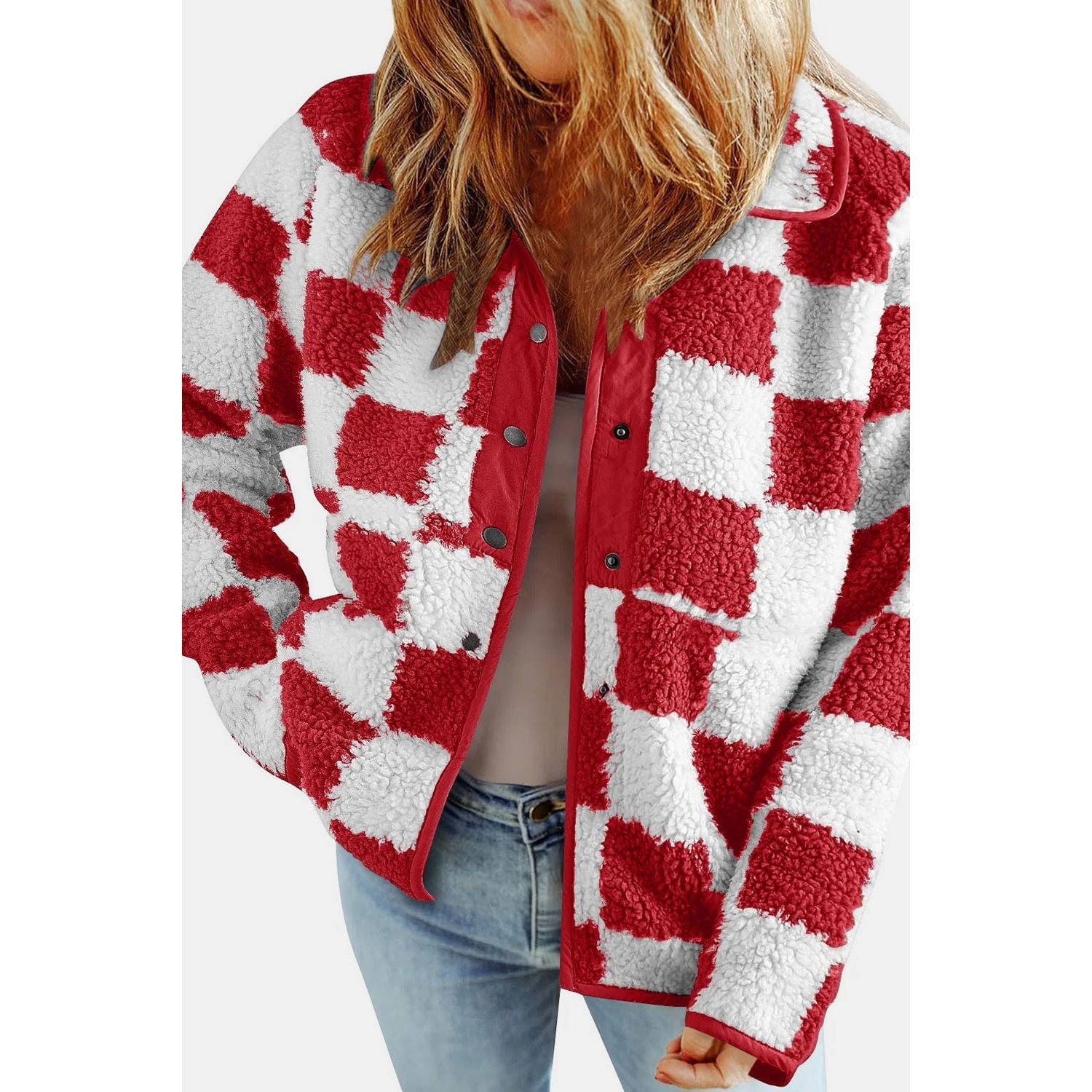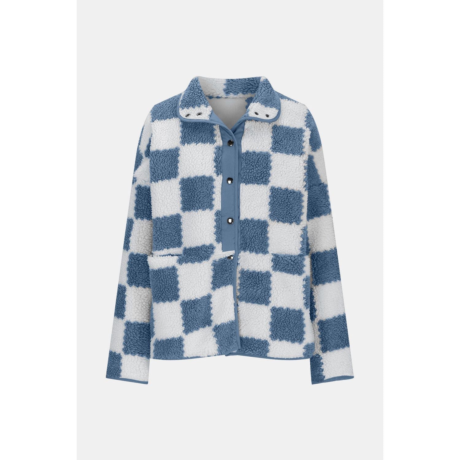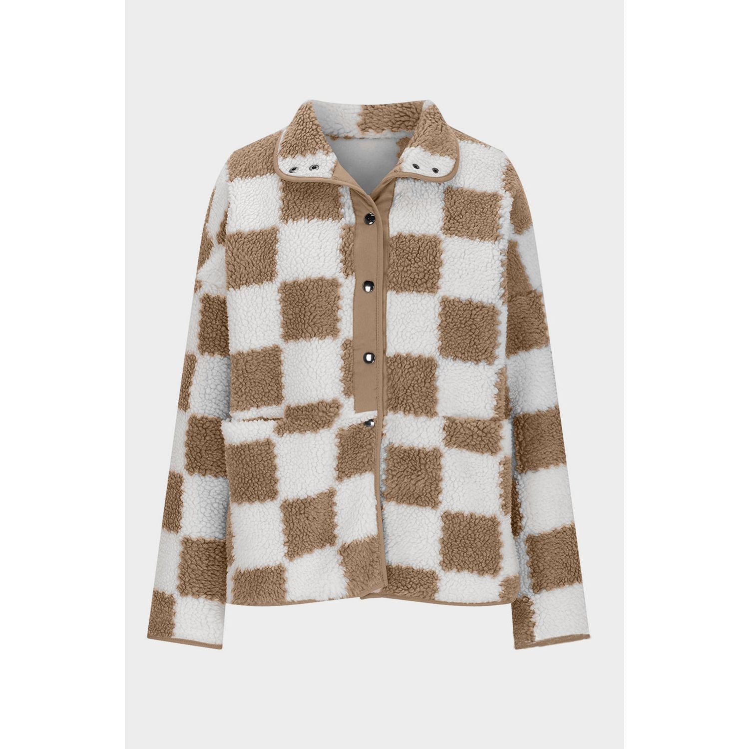 Checkered Snap Down Long Sleeve Teddy Jacket
