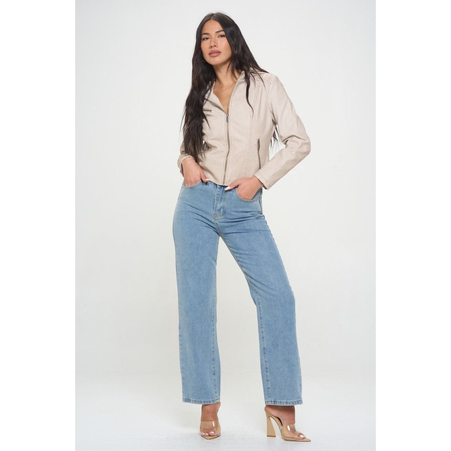 This zip-up hooded jacket is crafted from vegan leather for a stylish and sustainable option. The zip-up pocket adds a practical touch for storing essentials. The hood offers extra warmth and versatility for different weather conditions. Ideal for those seeking a chic and cruelty-free fashion statement. This jacket is a fashionable and functional addition to any wardrobe.