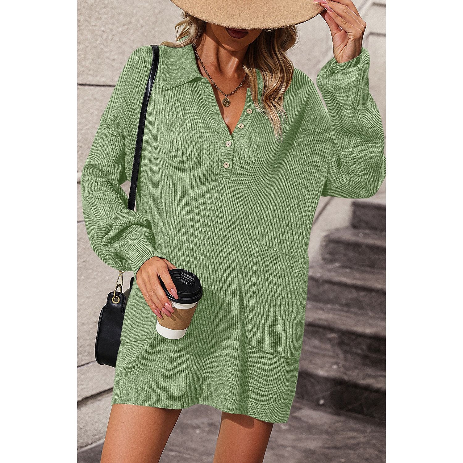 Collared Neck Long Sleeve Sweater Dress with Pockets