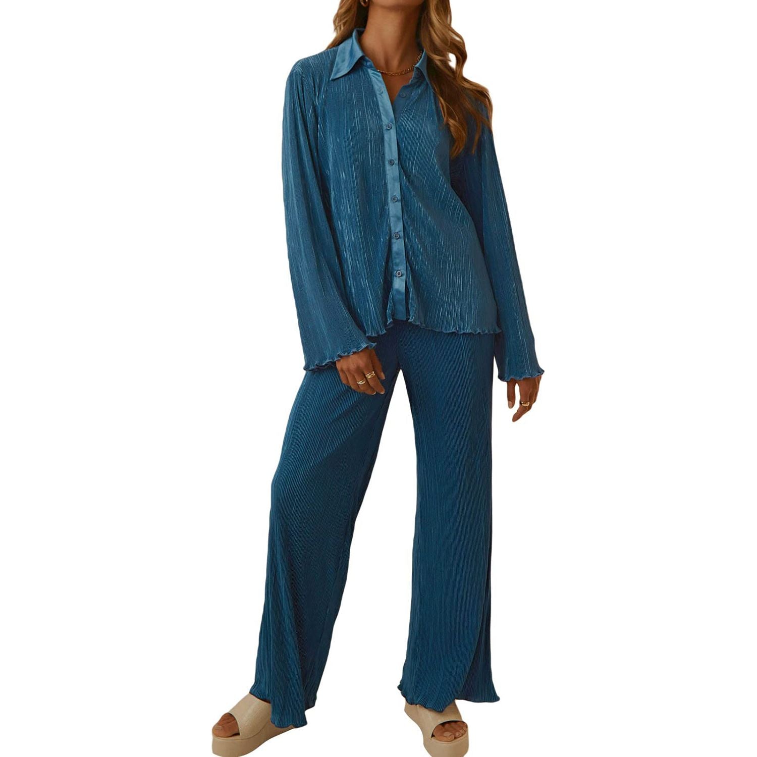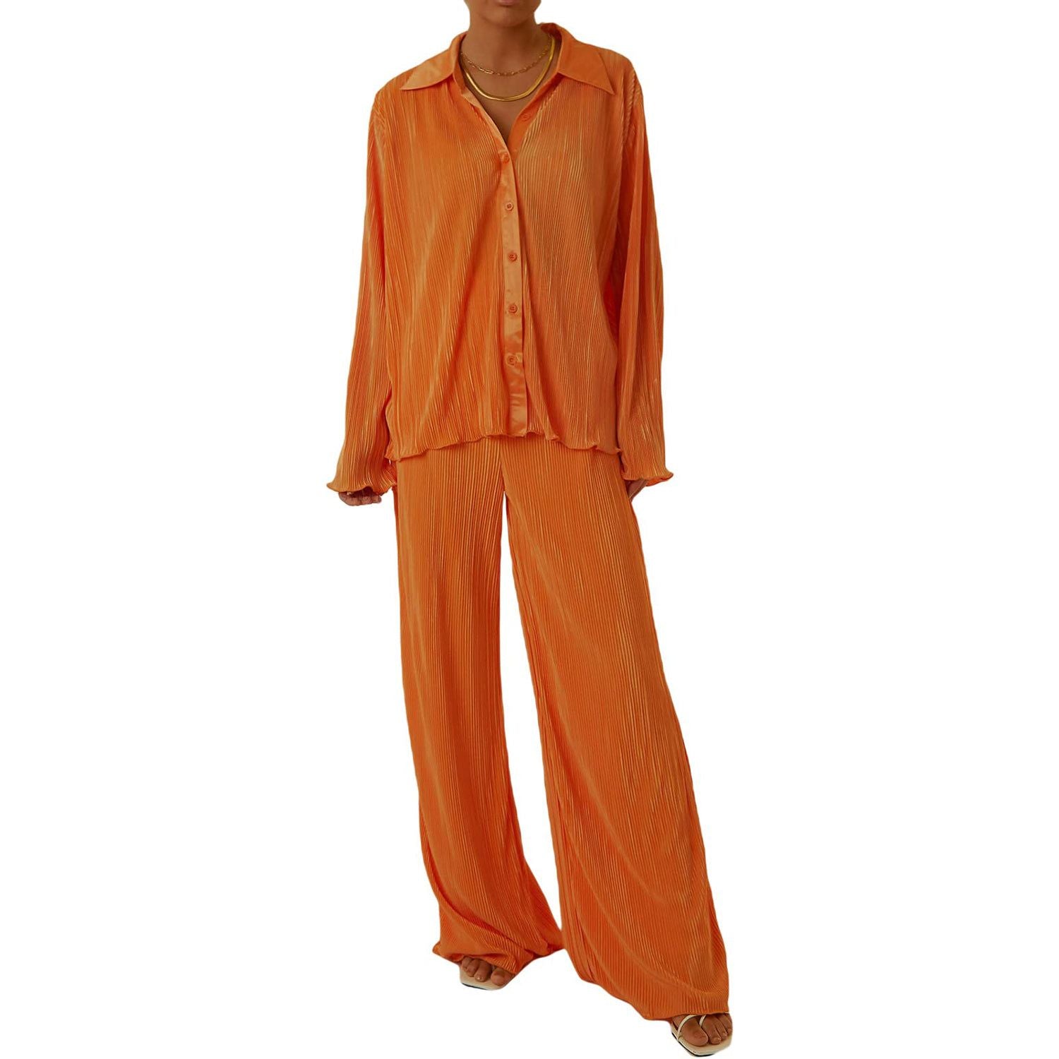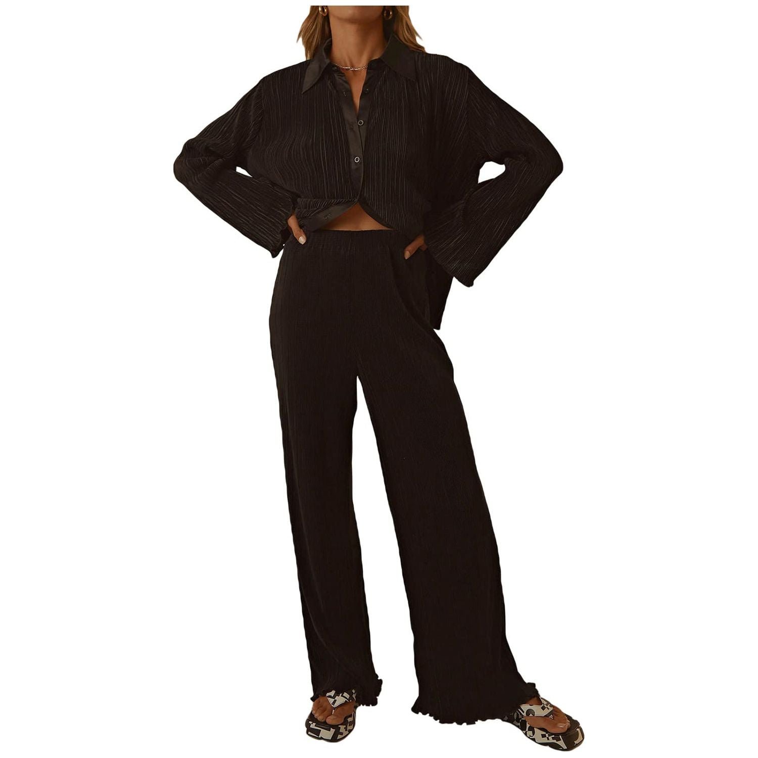 Collared Neck Long Sleeve Top and Pants Lounge Set