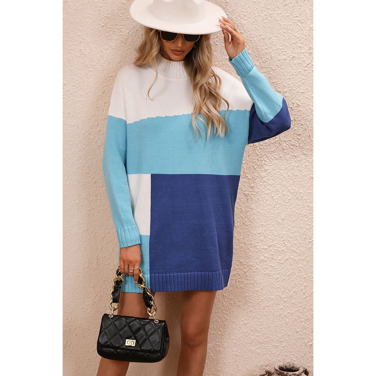 Color Block Mock Neck Dropped Shoulder Sweater Dress