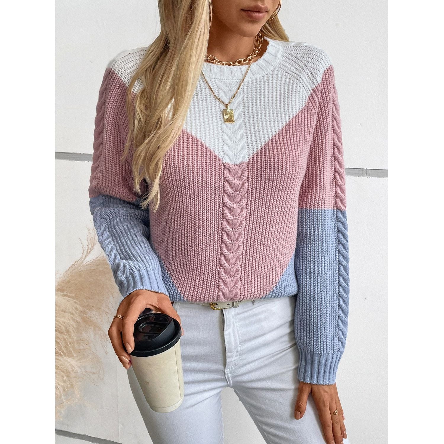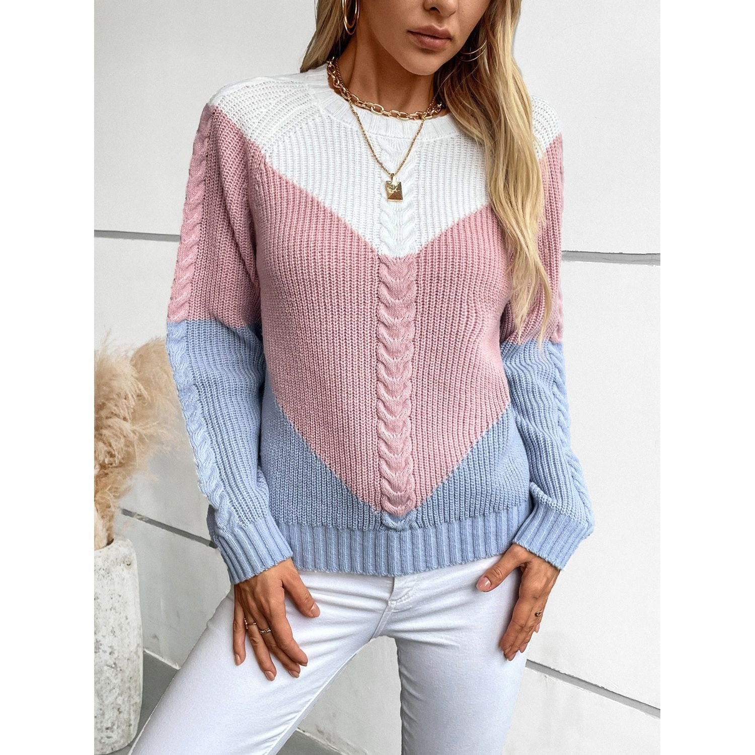 Color Block Round Neck Long Sleeve Sweater