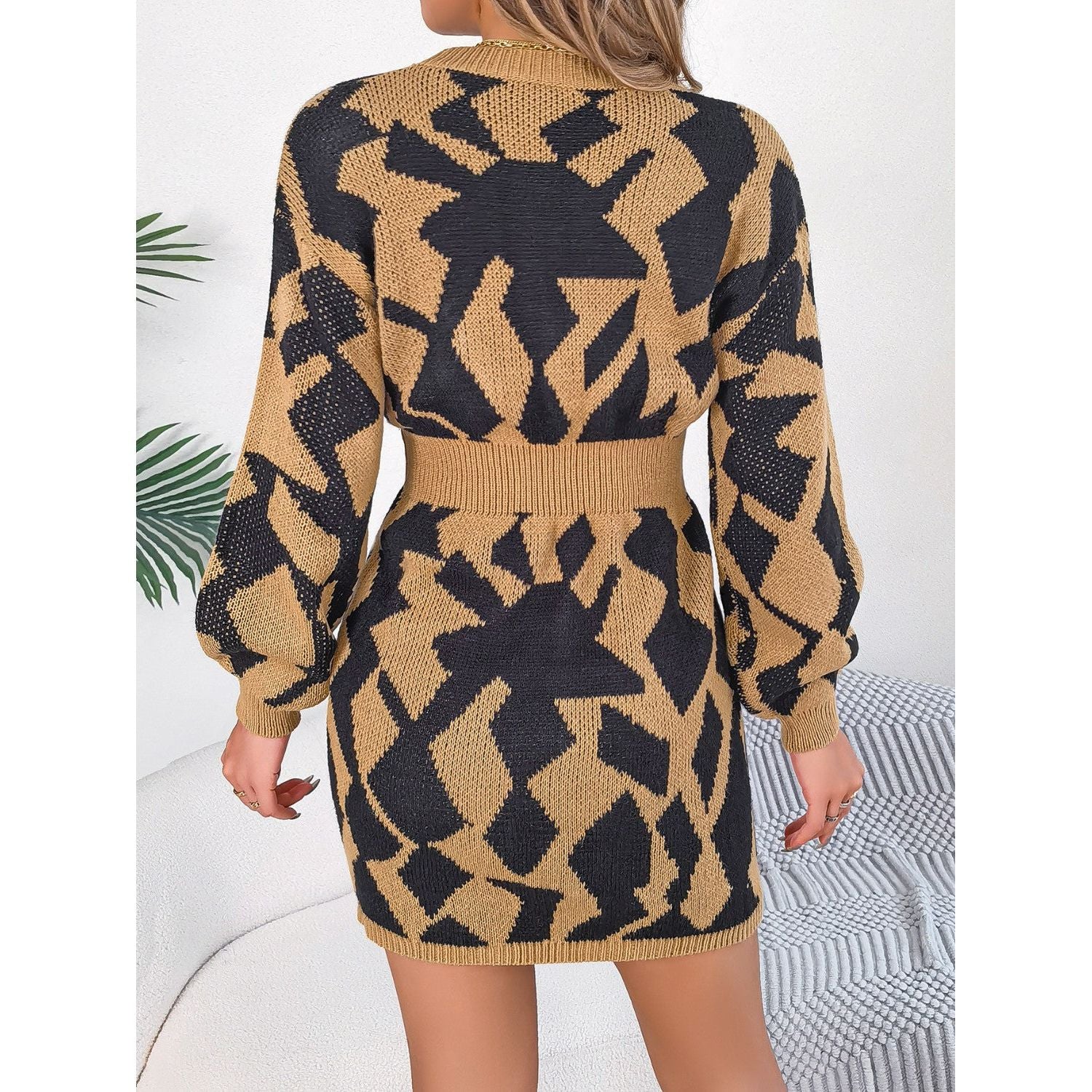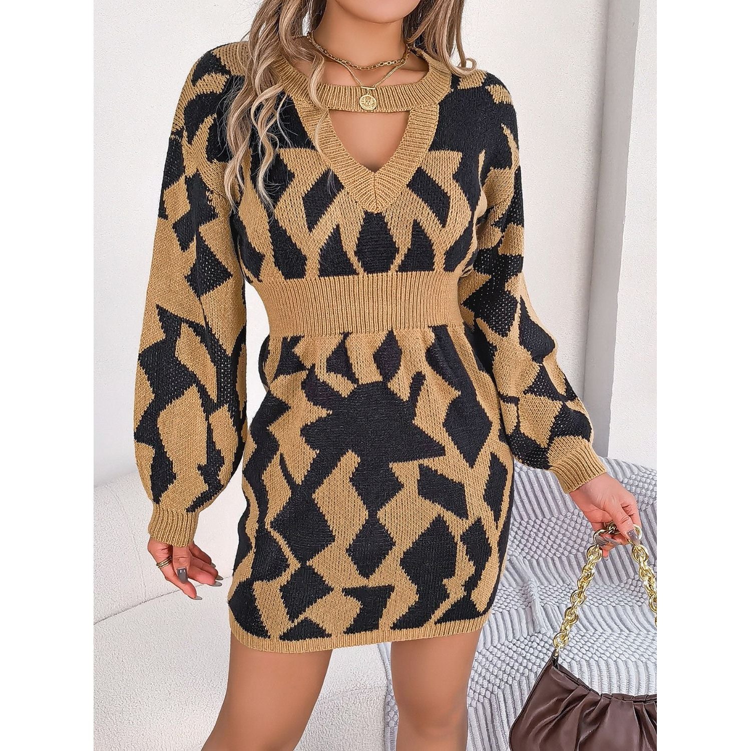 Contrast Round Neck Cutout Long Sleeve Mini Sweater Dress