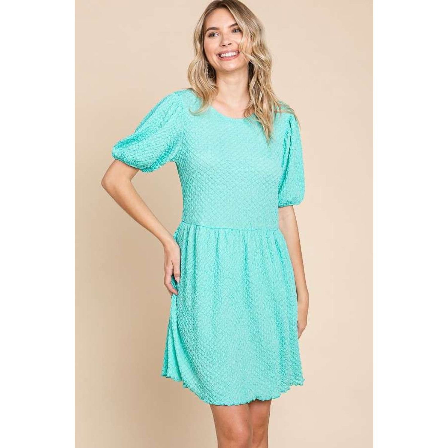 Culture Code Full Size Textured Round Neck Puff Sleeve Dress