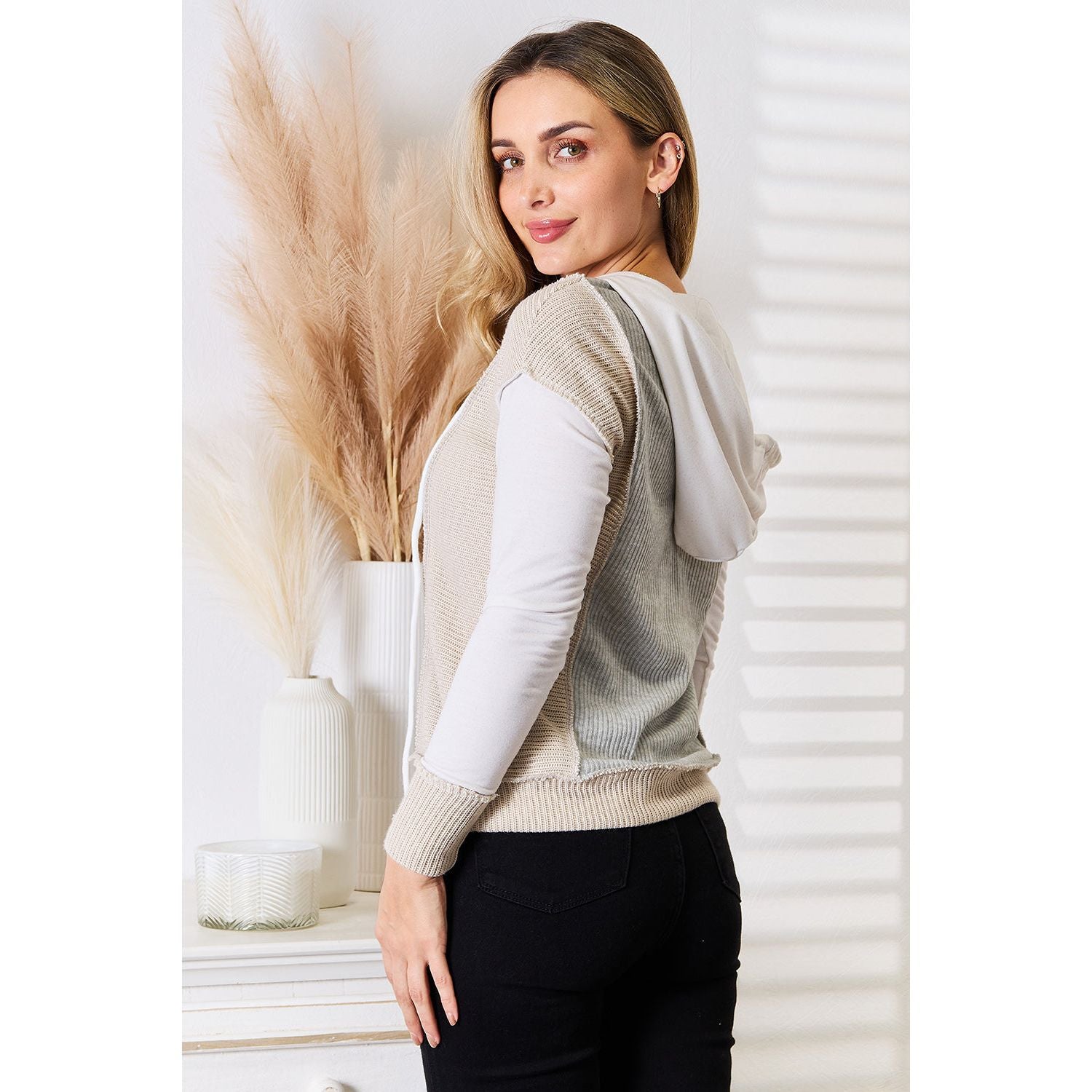 Double Take Color Block Exposed Seam Drawstring Hoodie