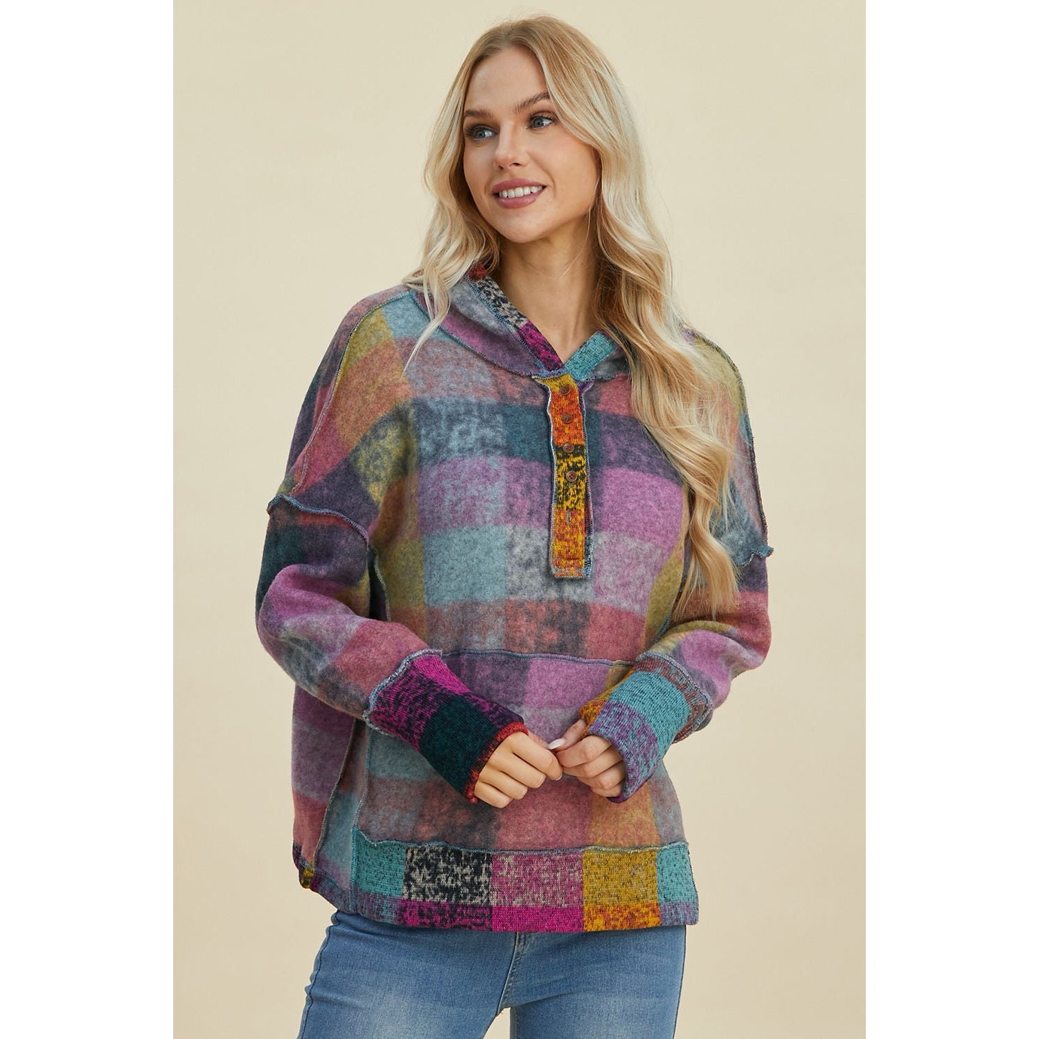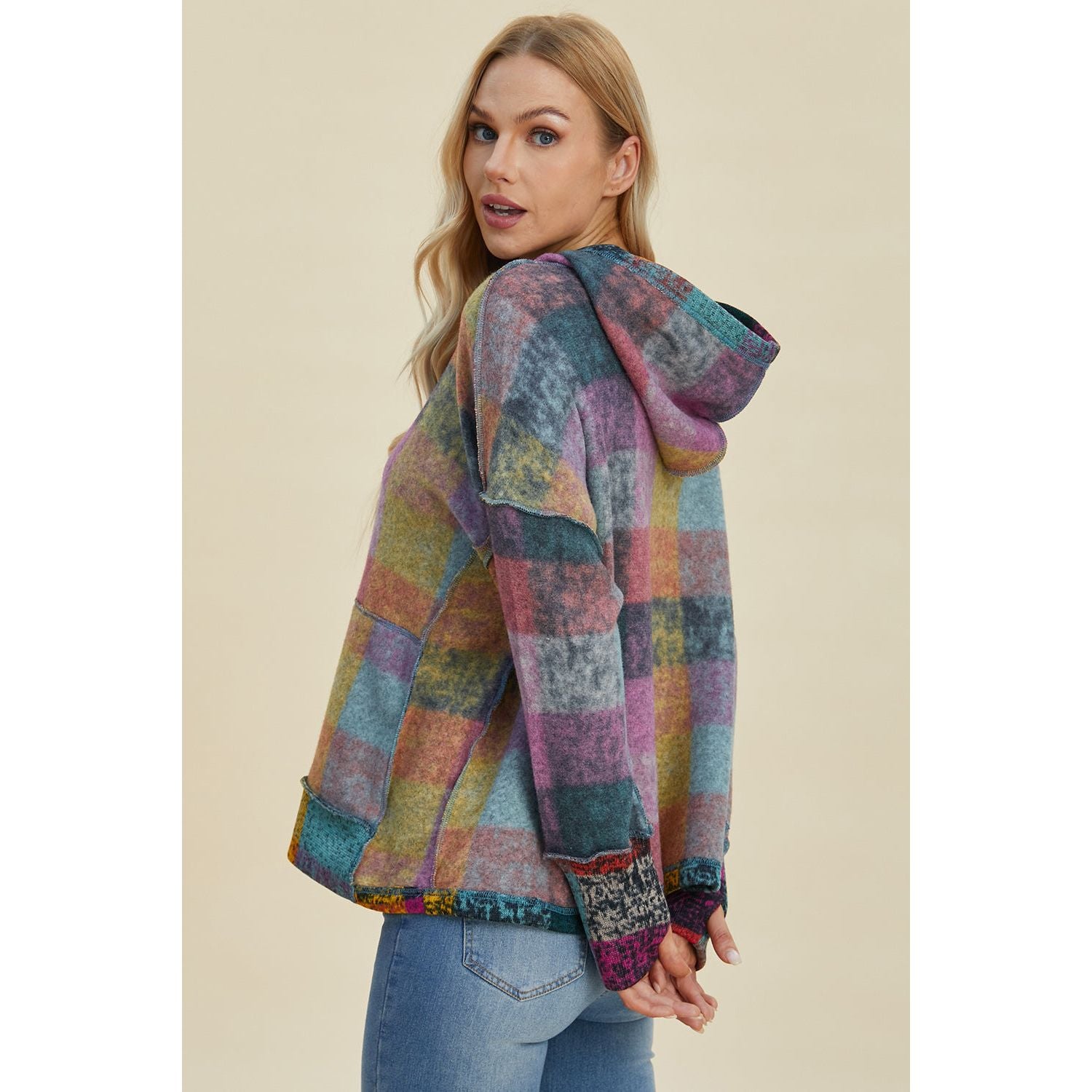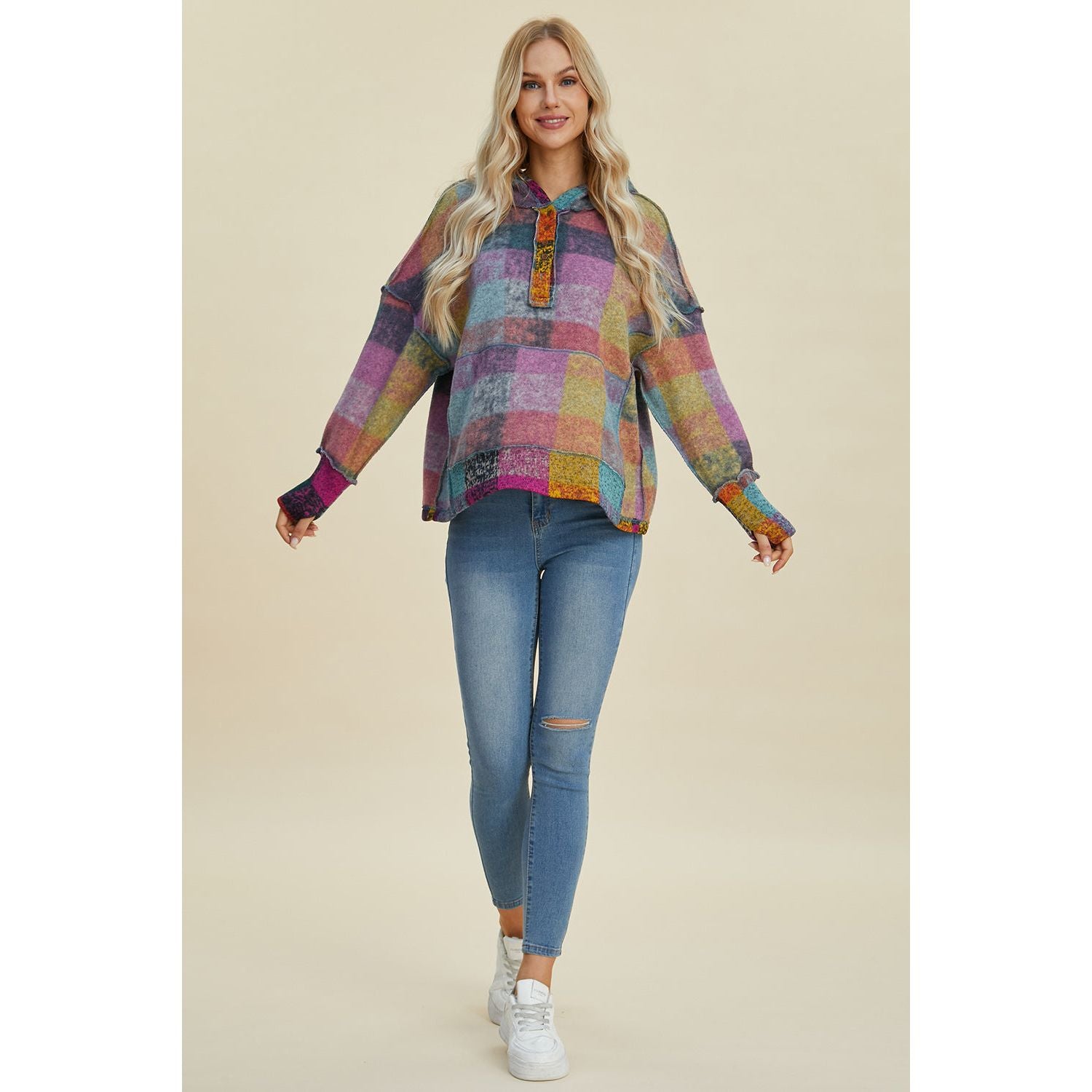 Double Take Full Size Plaid Dropped Shoulder Hoodie