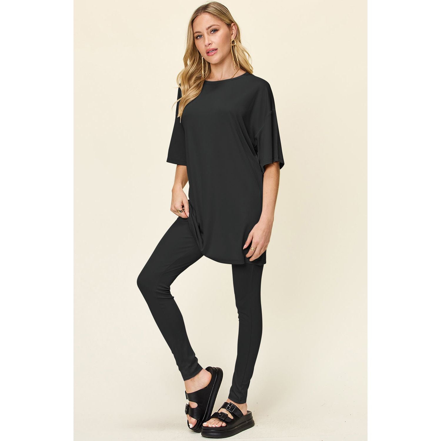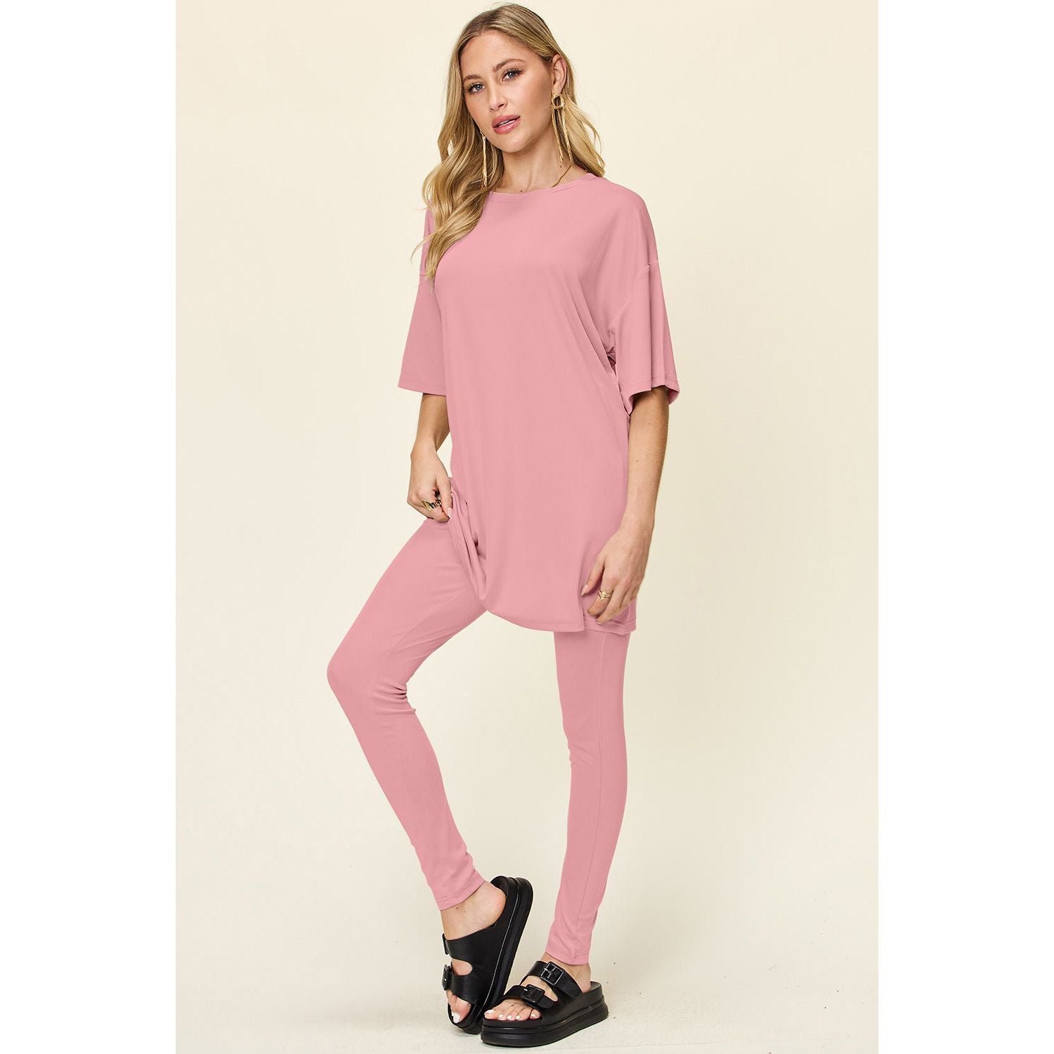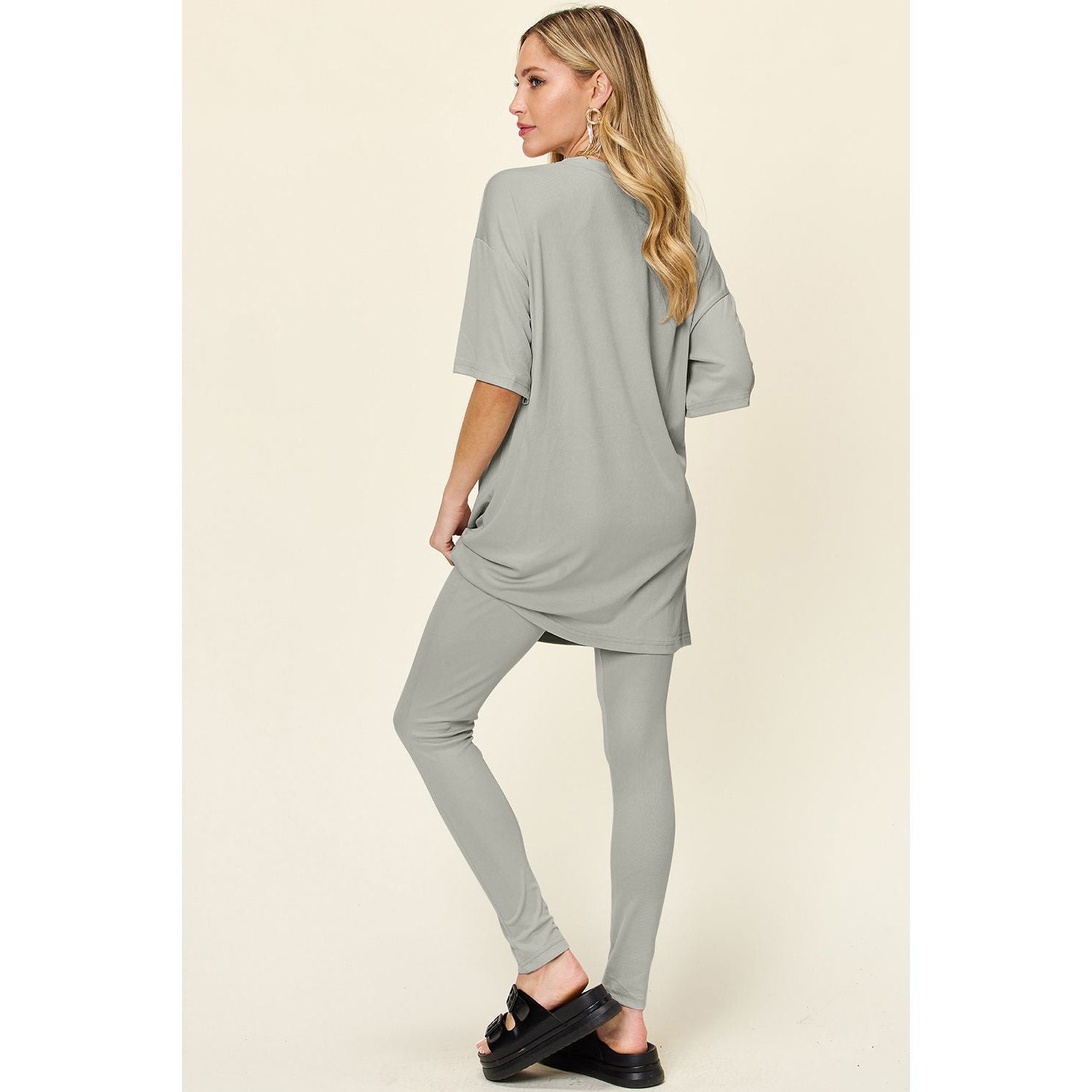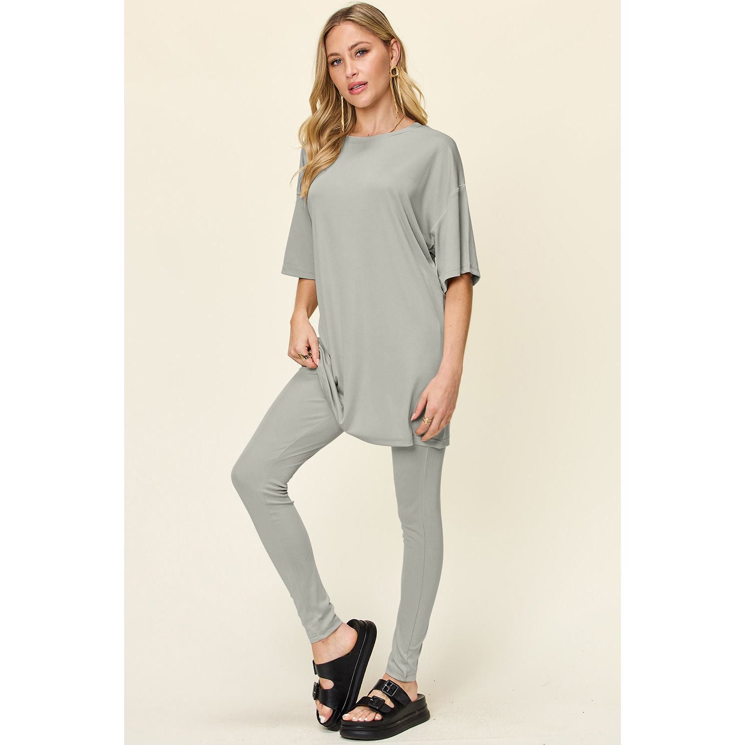 Double Take Full Size Round Neck Dropped Shoulder T-Shirt and Leggings Set