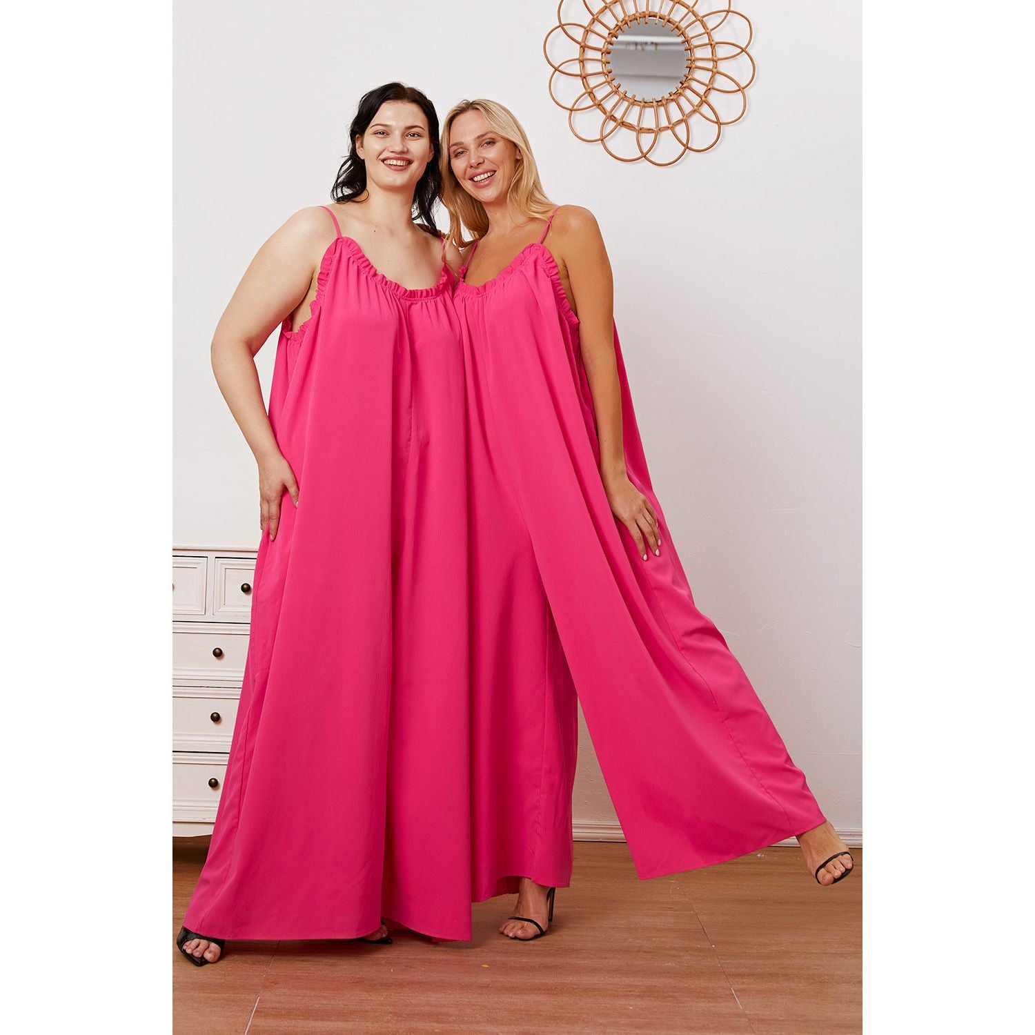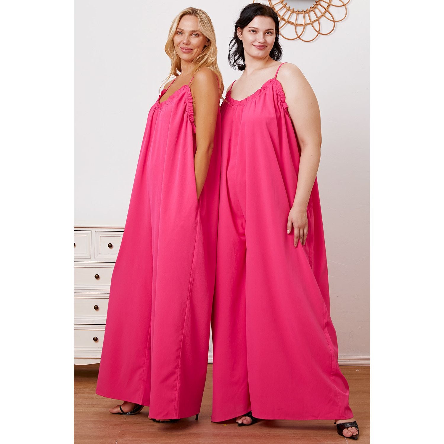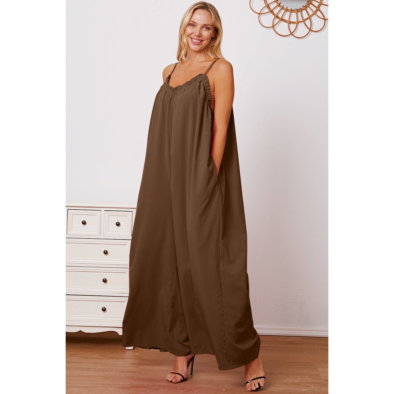 Double Take Full Size Ruffle Trim Tie Back Cami Jumpsuit with Pockets