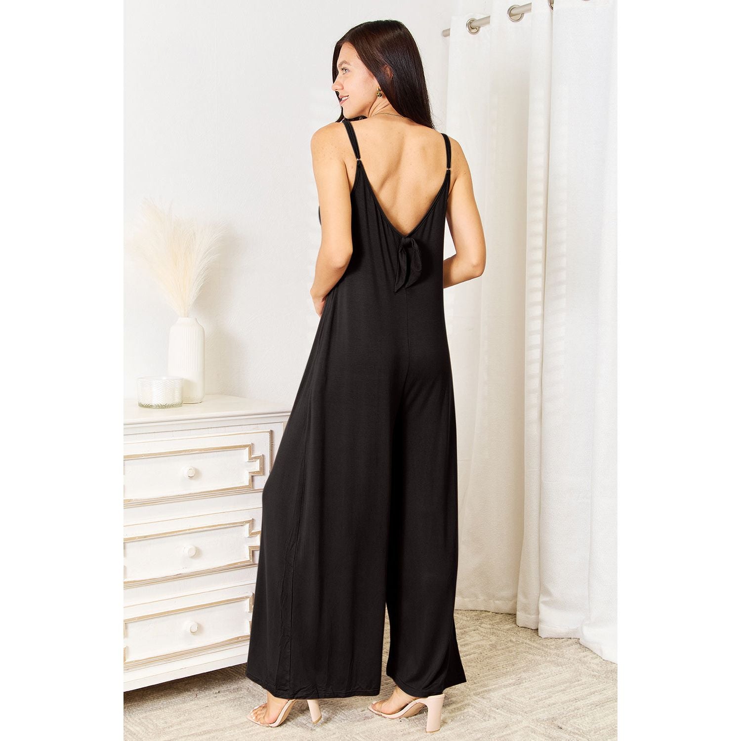 Double Take Full Size Soft Rayon Spaghetti Strap Tied Wide Leg Jumpsuit