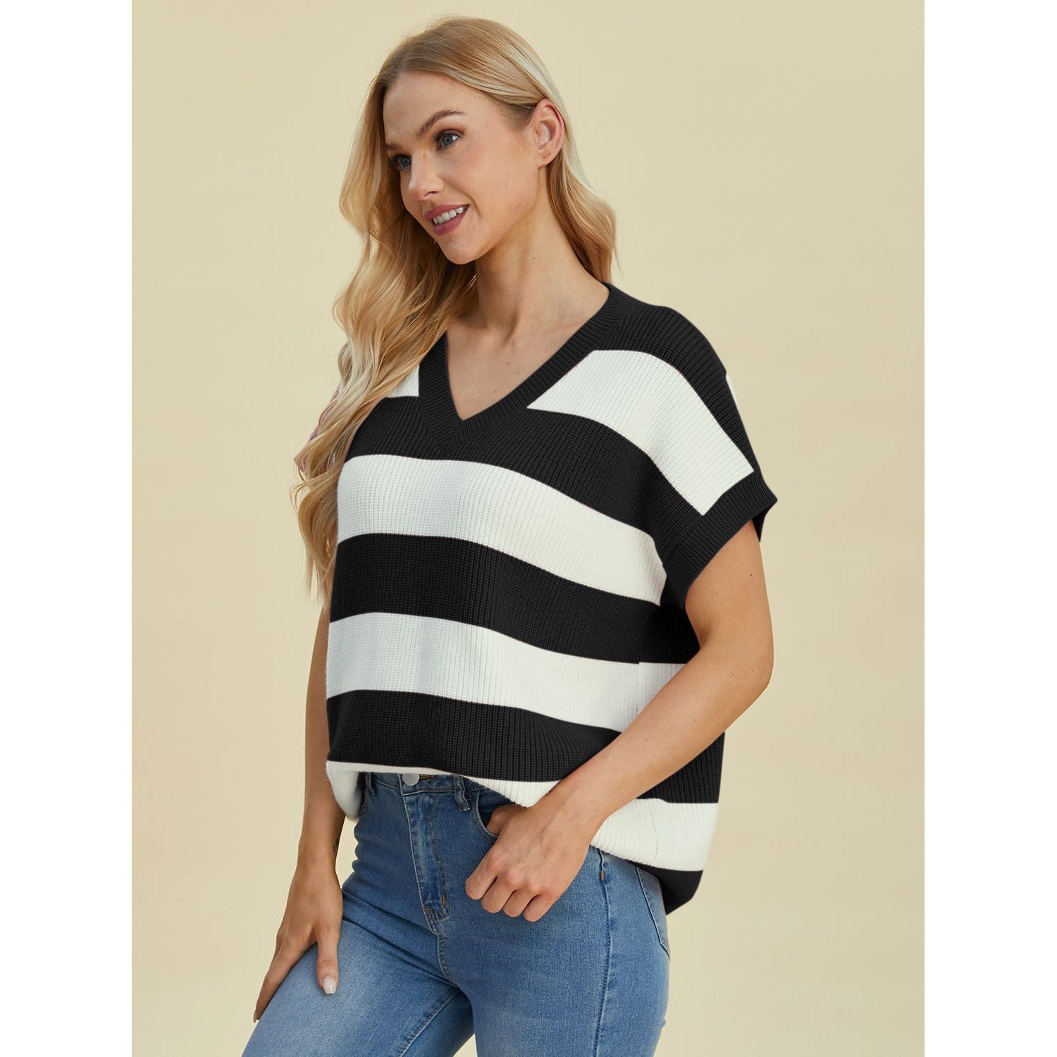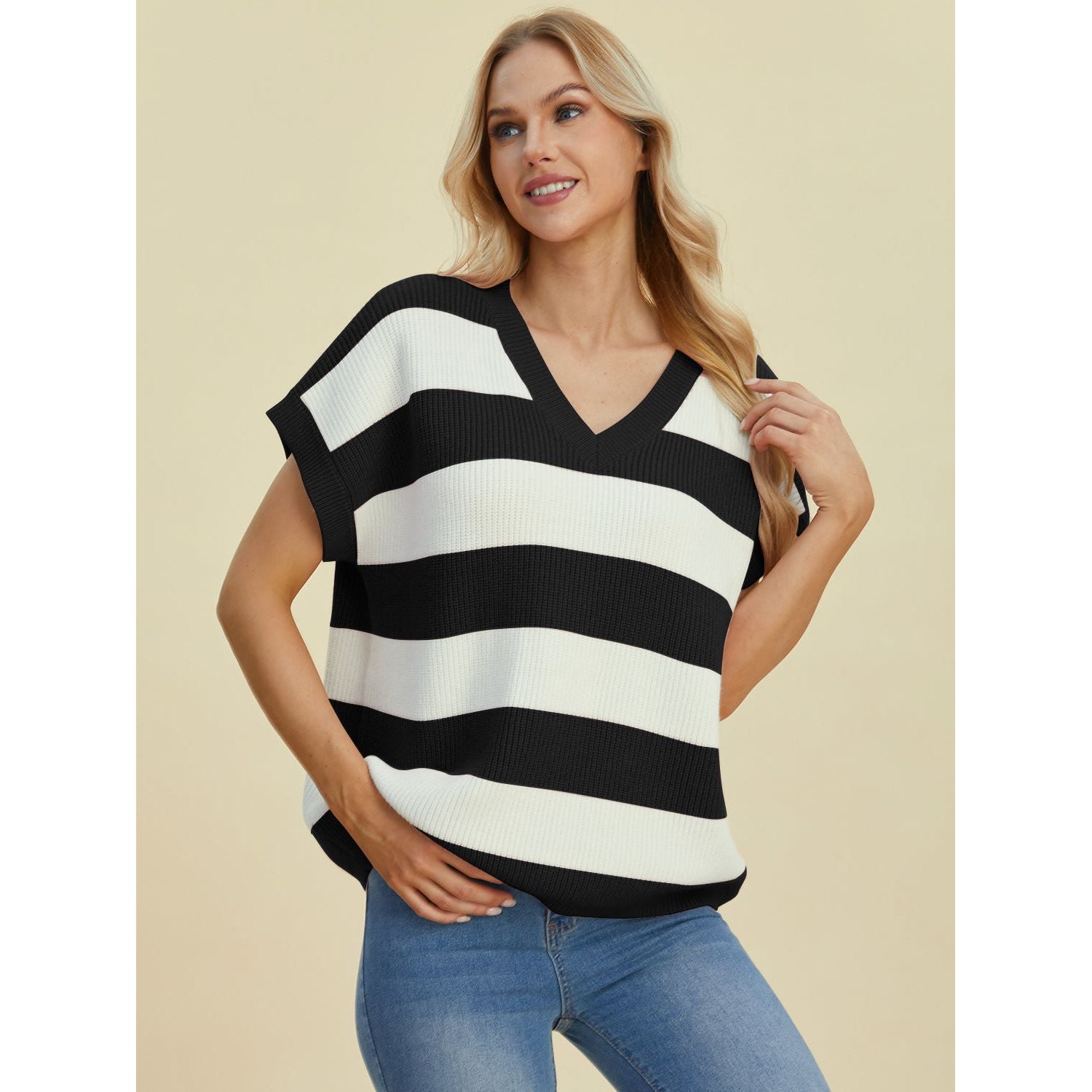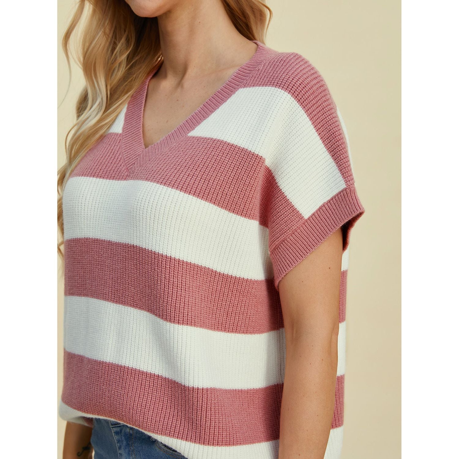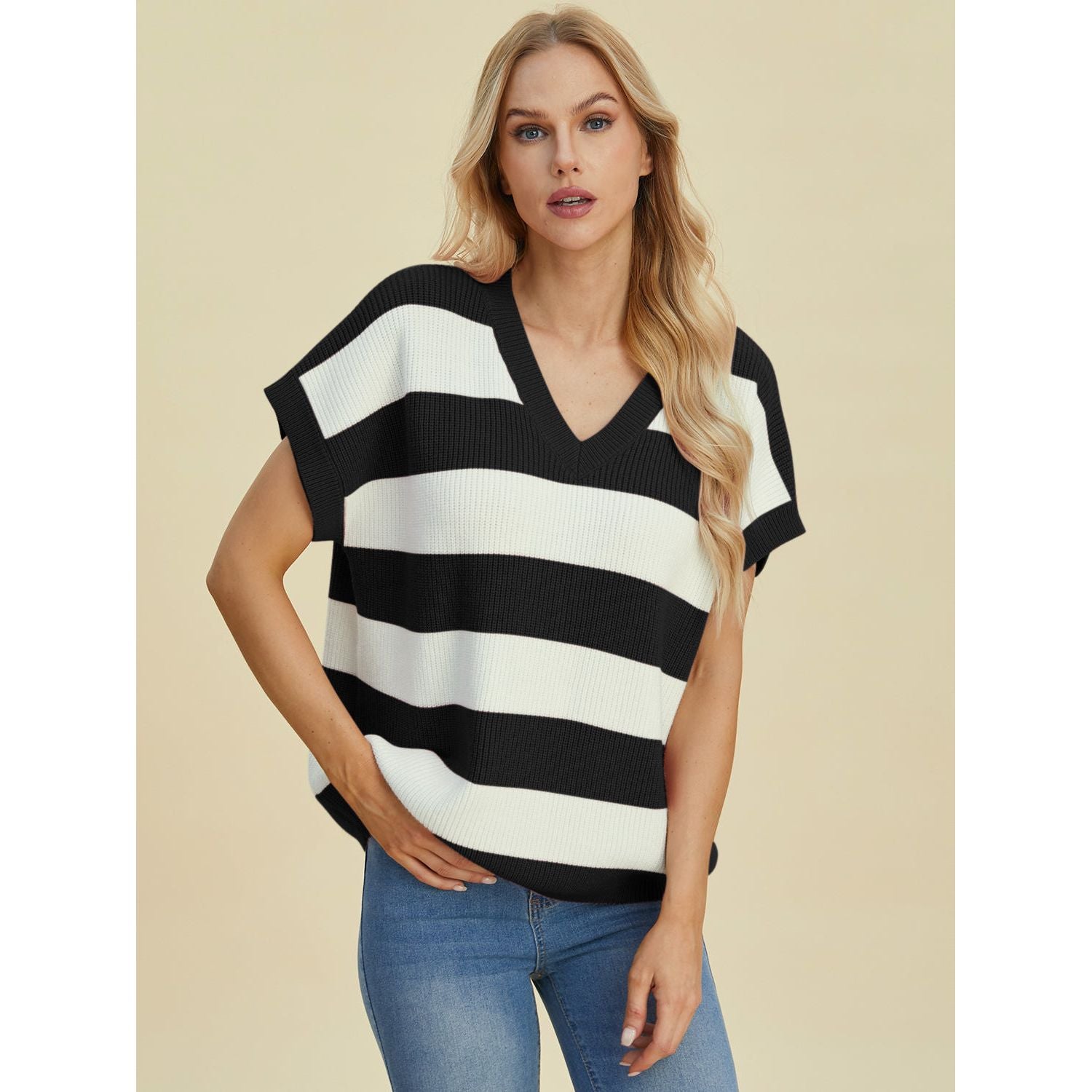 Double Take Full Size Striped V-Neck Short Sleeve Sweater