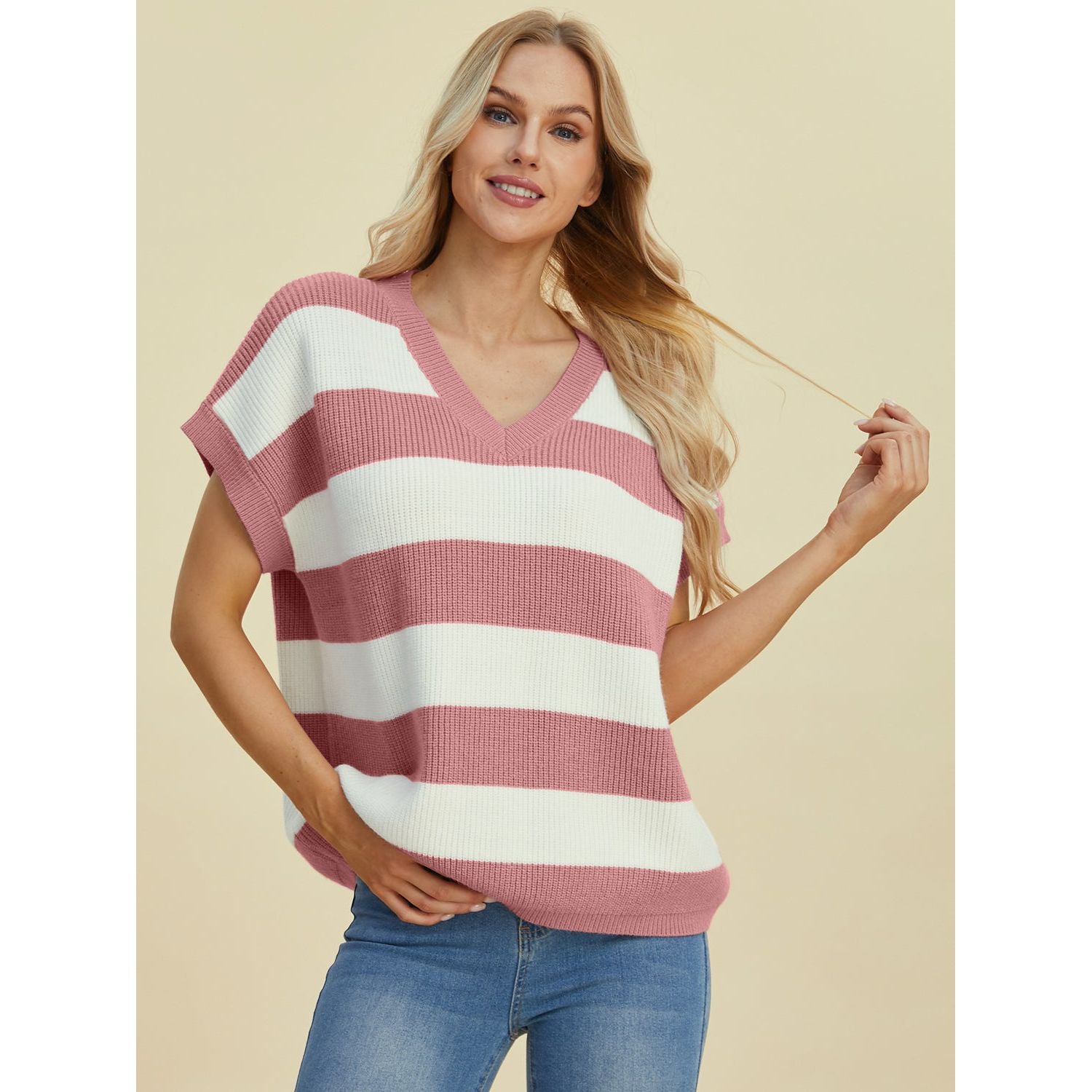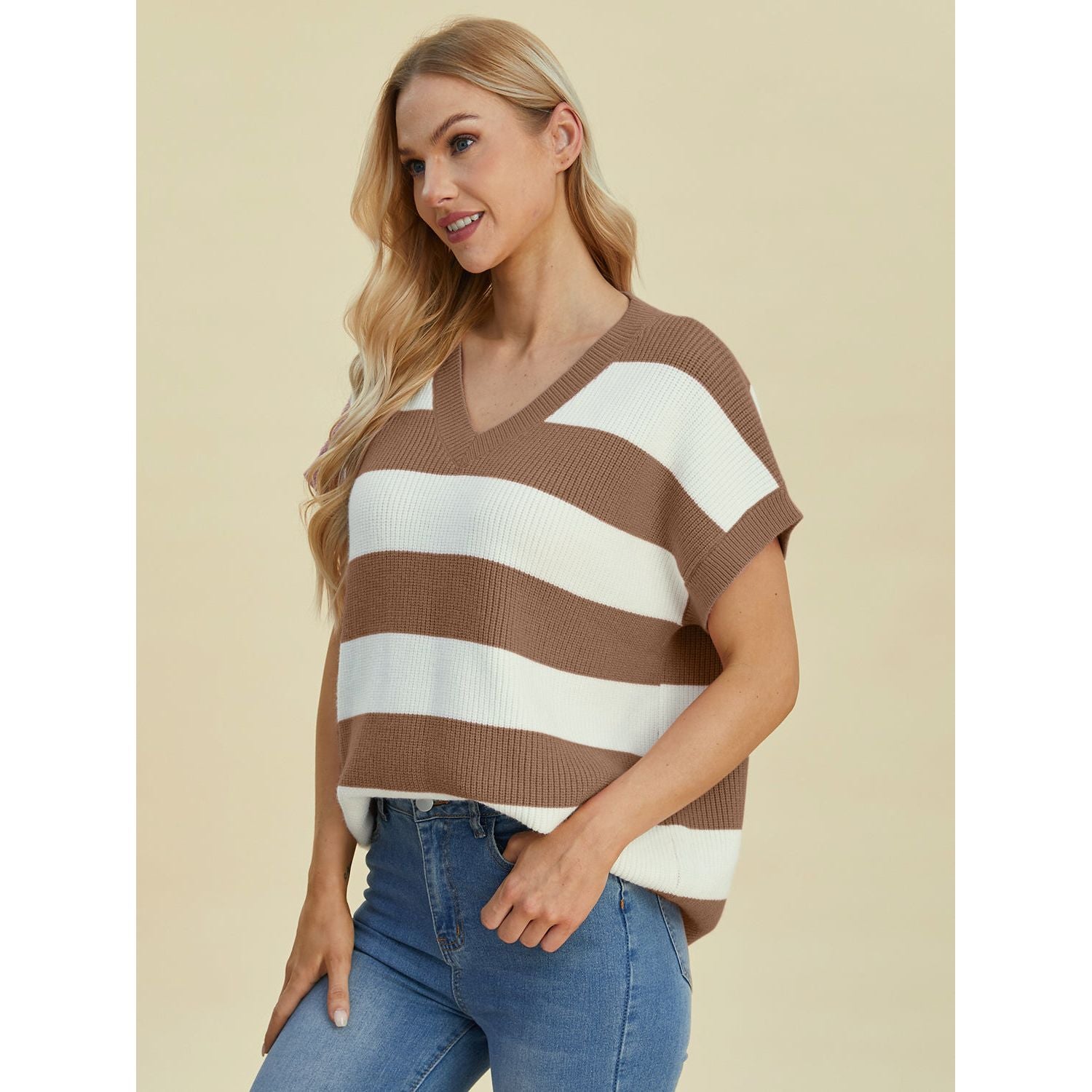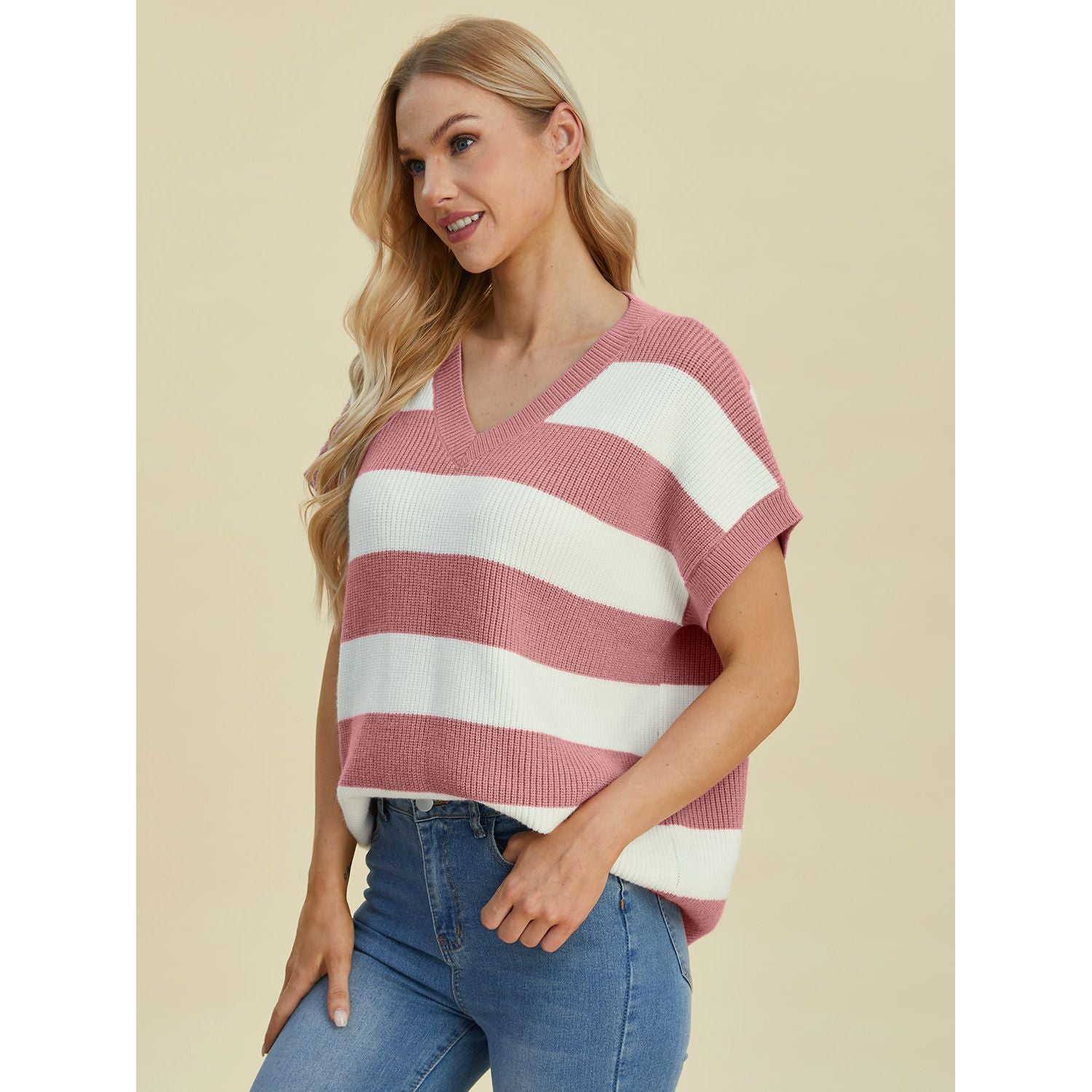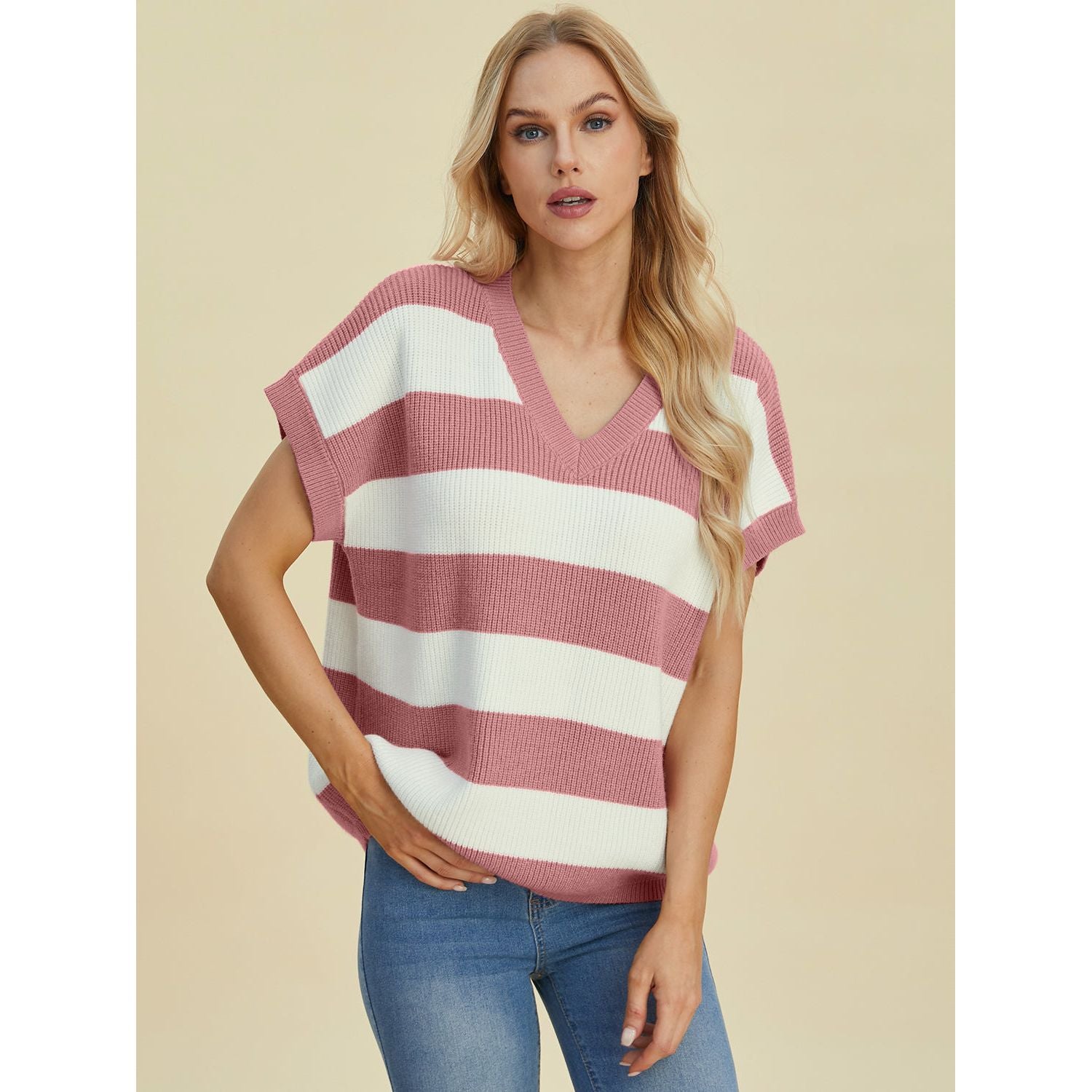 Double Take Full Size Striped V-Neck Short Sleeve Sweater