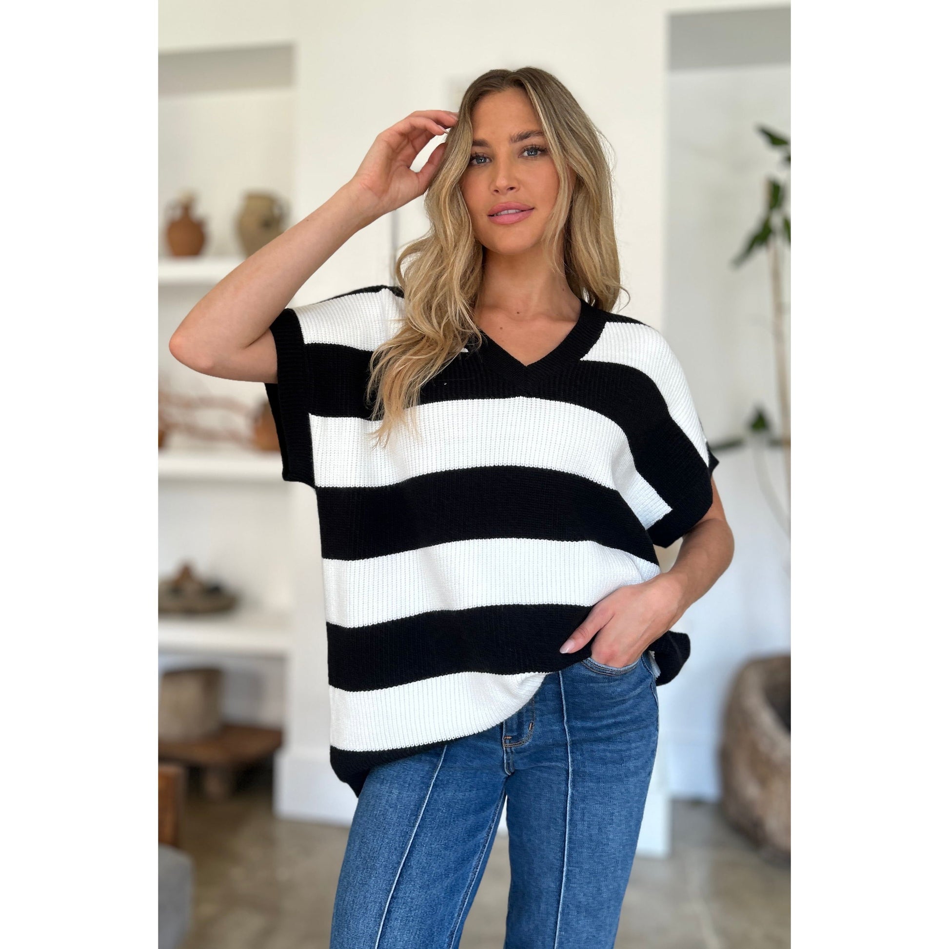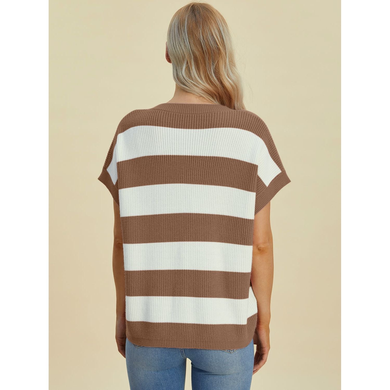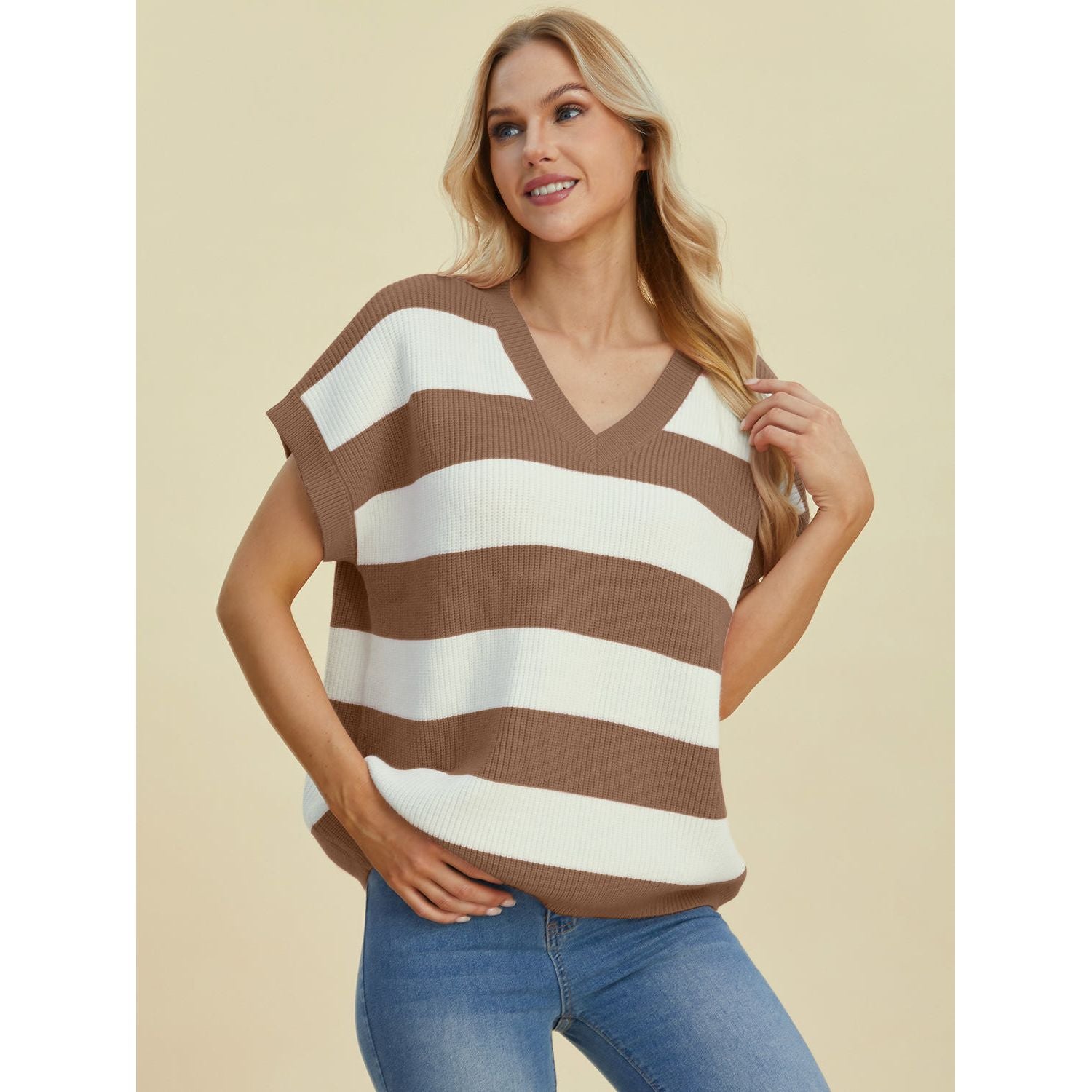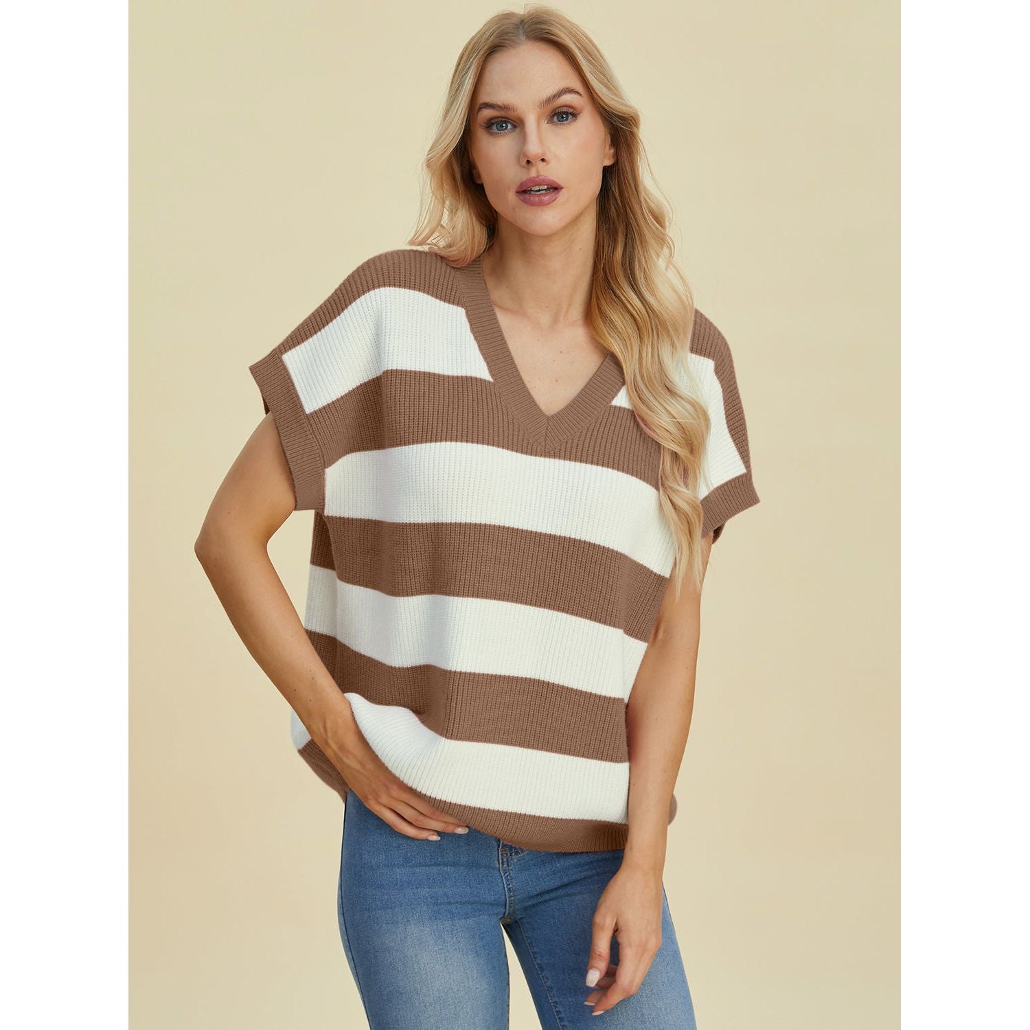 Double Take Full Size Striped V-Neck Short Sleeve Sweater