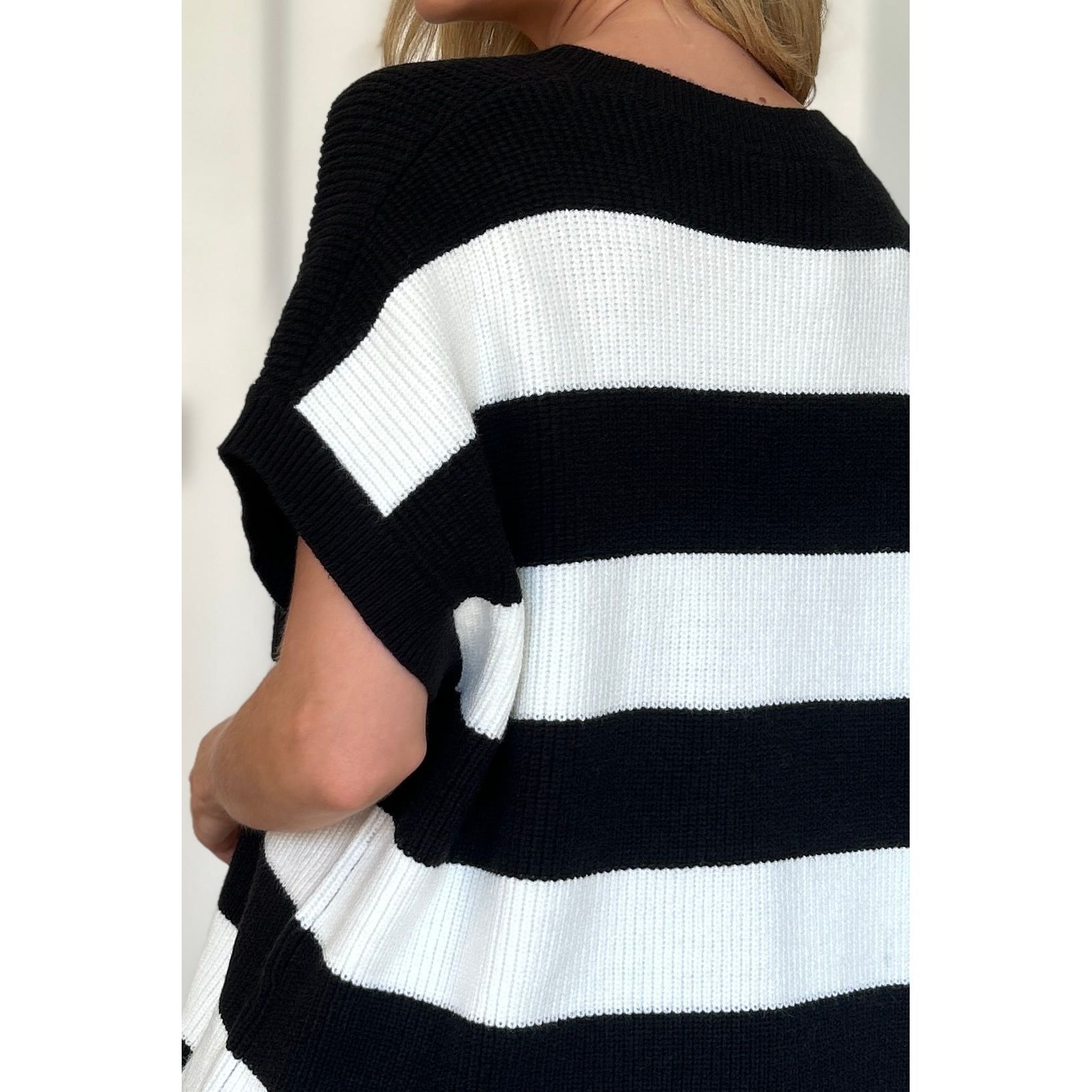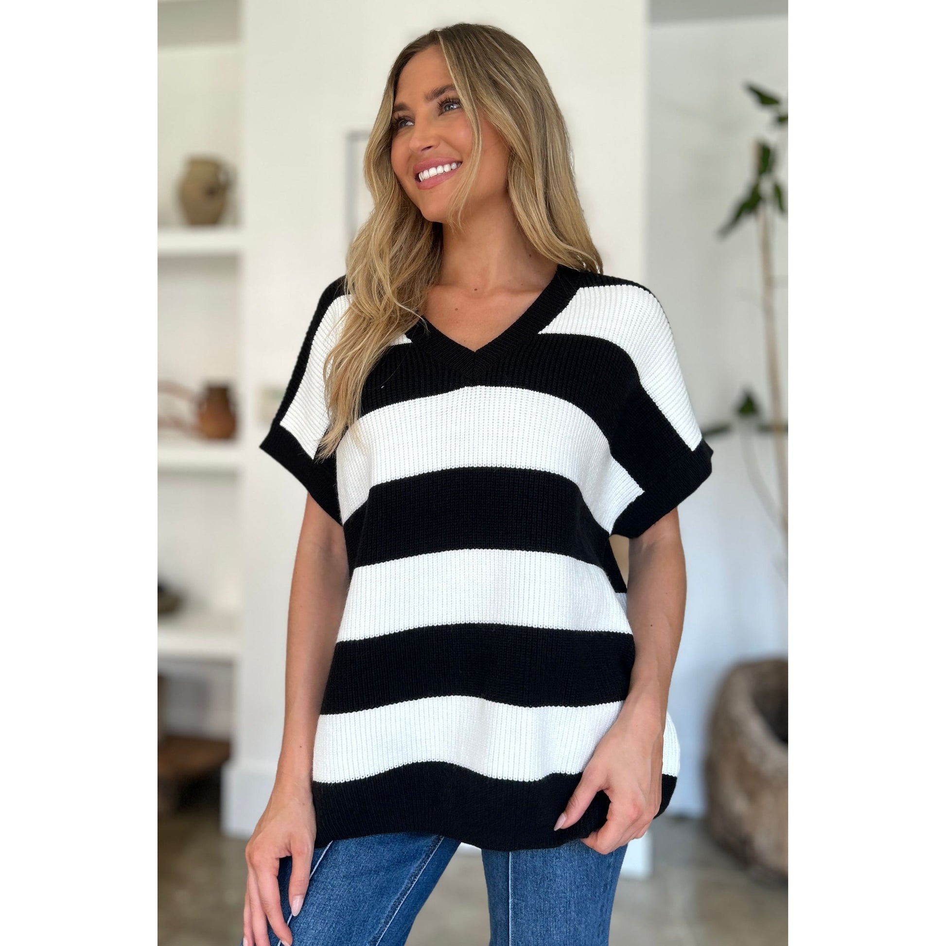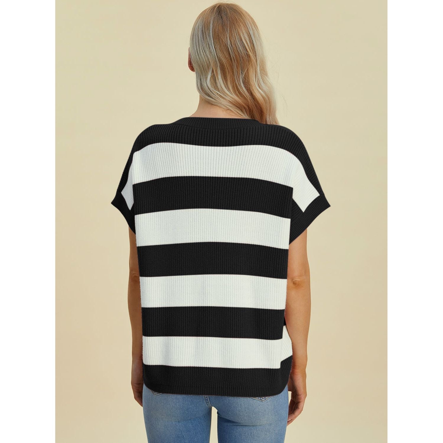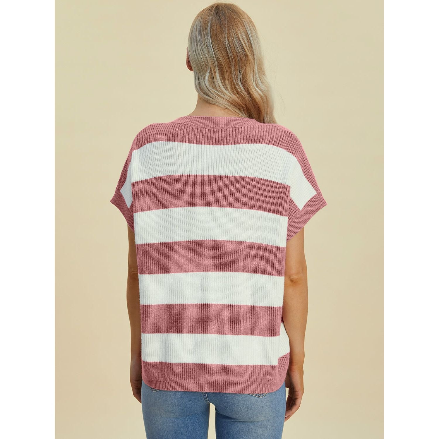 Double Take Full Size Striped V-Neck Short Sleeve Sweater