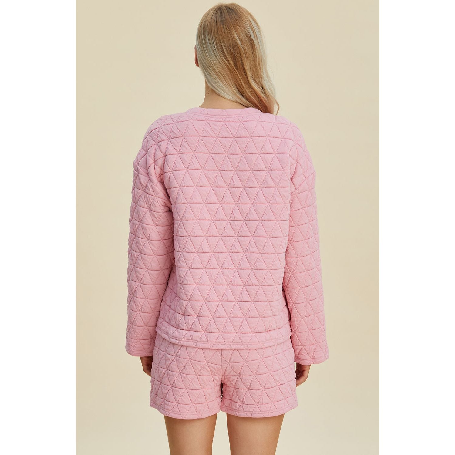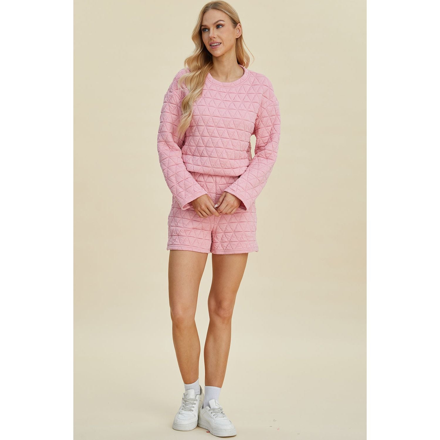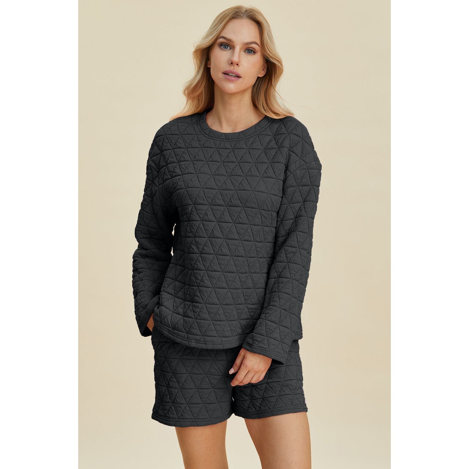 Double Take Full Size Texture Round Neck Long Sleeve Top and Shorts Set