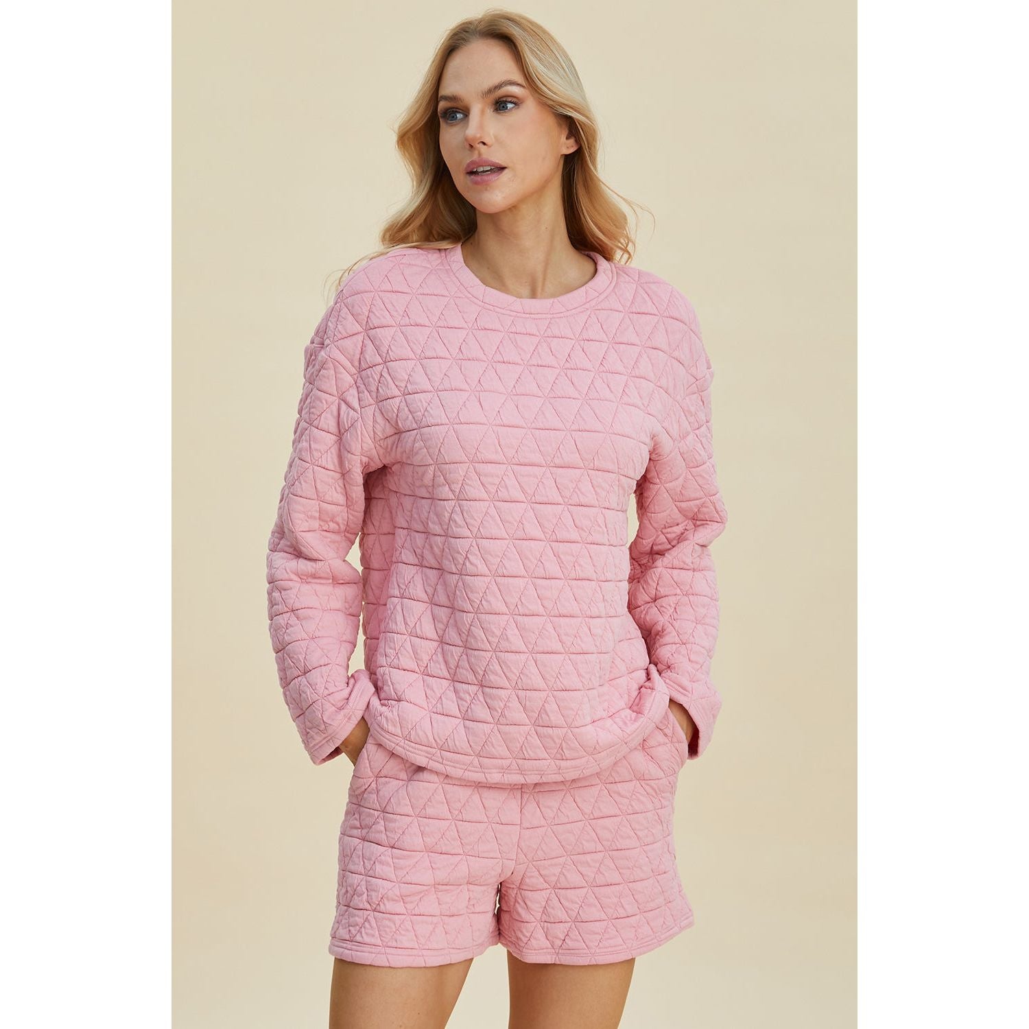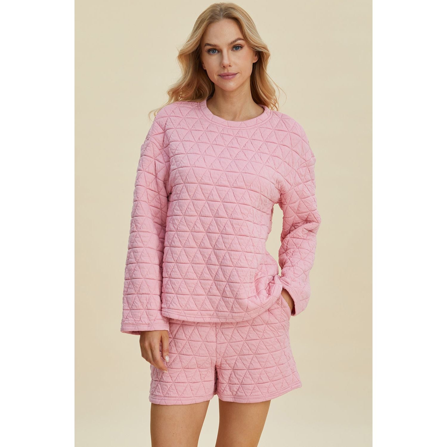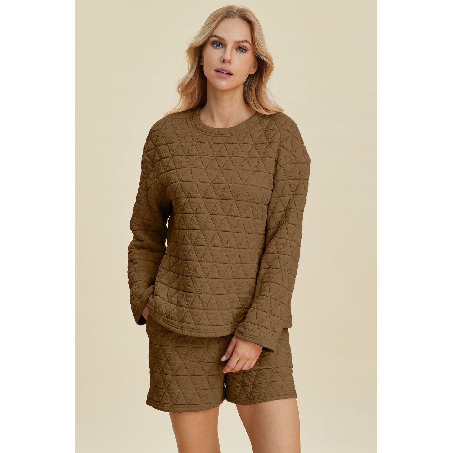 Double Take Full Size Texture Round Neck Long Sleeve Top and Shorts Set