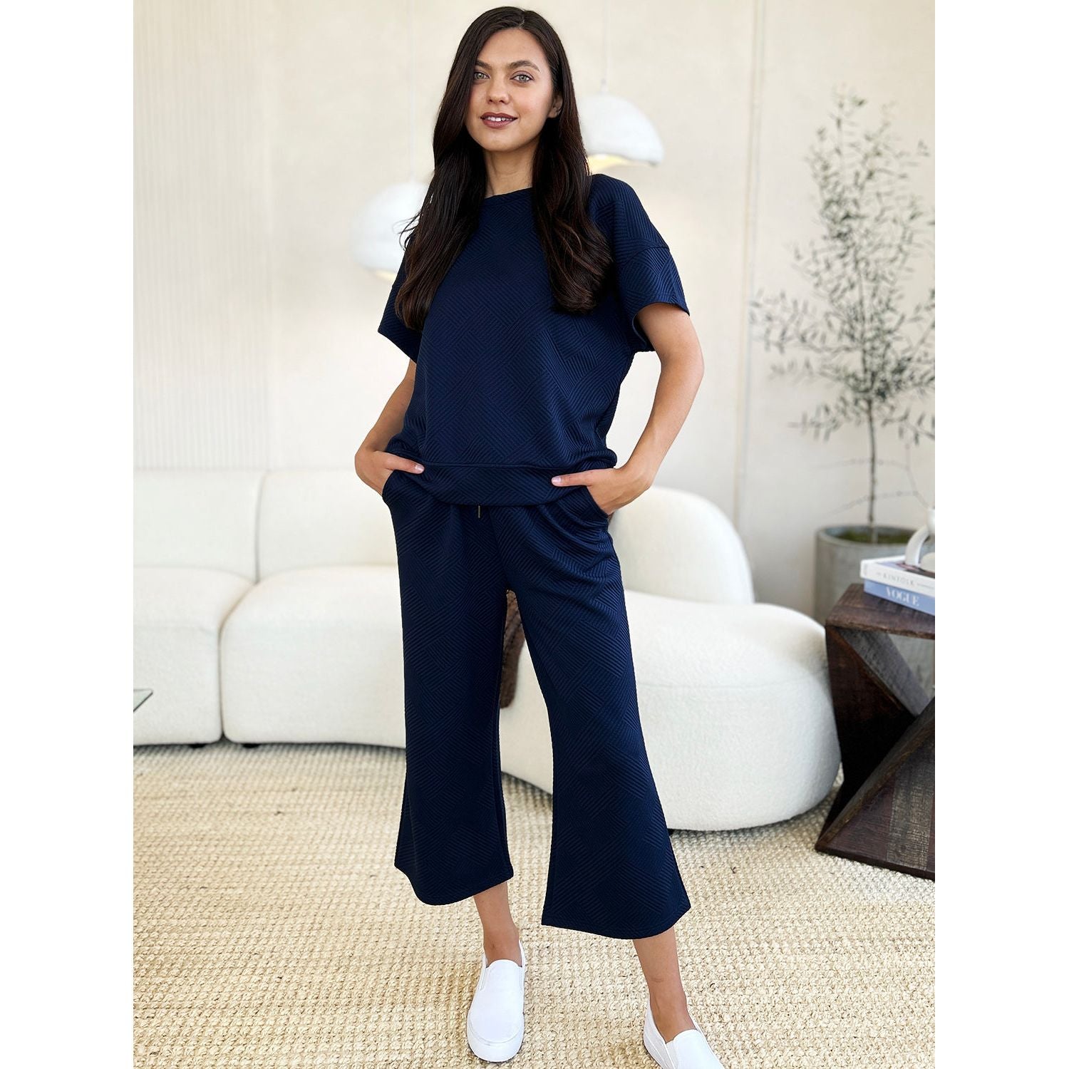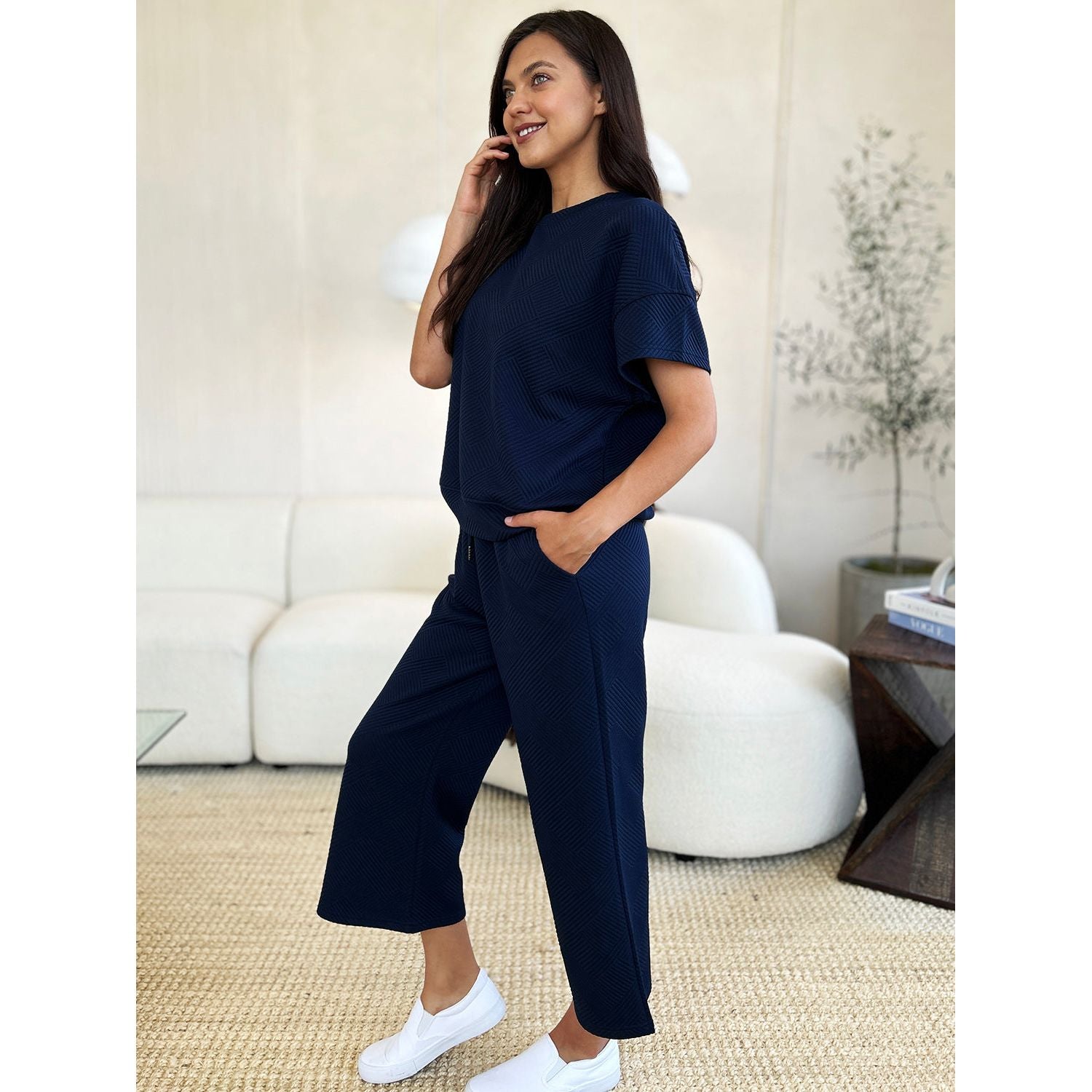 Double Take Full Size Texture Short Sleeve Top and Pants Set