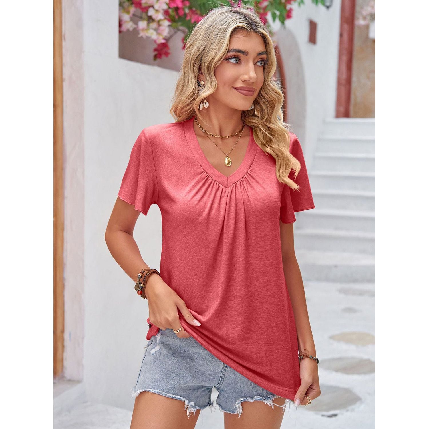 This solid T-shirt features a ruched design, adding a unique and stylish element. The V-neckline adds a touch of femininity and sophistication. With its regular length, it is easy to style with various bottoms. The short flutter sleeves add a playful and trendy touch to the T-shirt. This ruched V-neck T-shirt is a versatile and essential piece for your everyday wardrobe, offering both comfort and fashion.