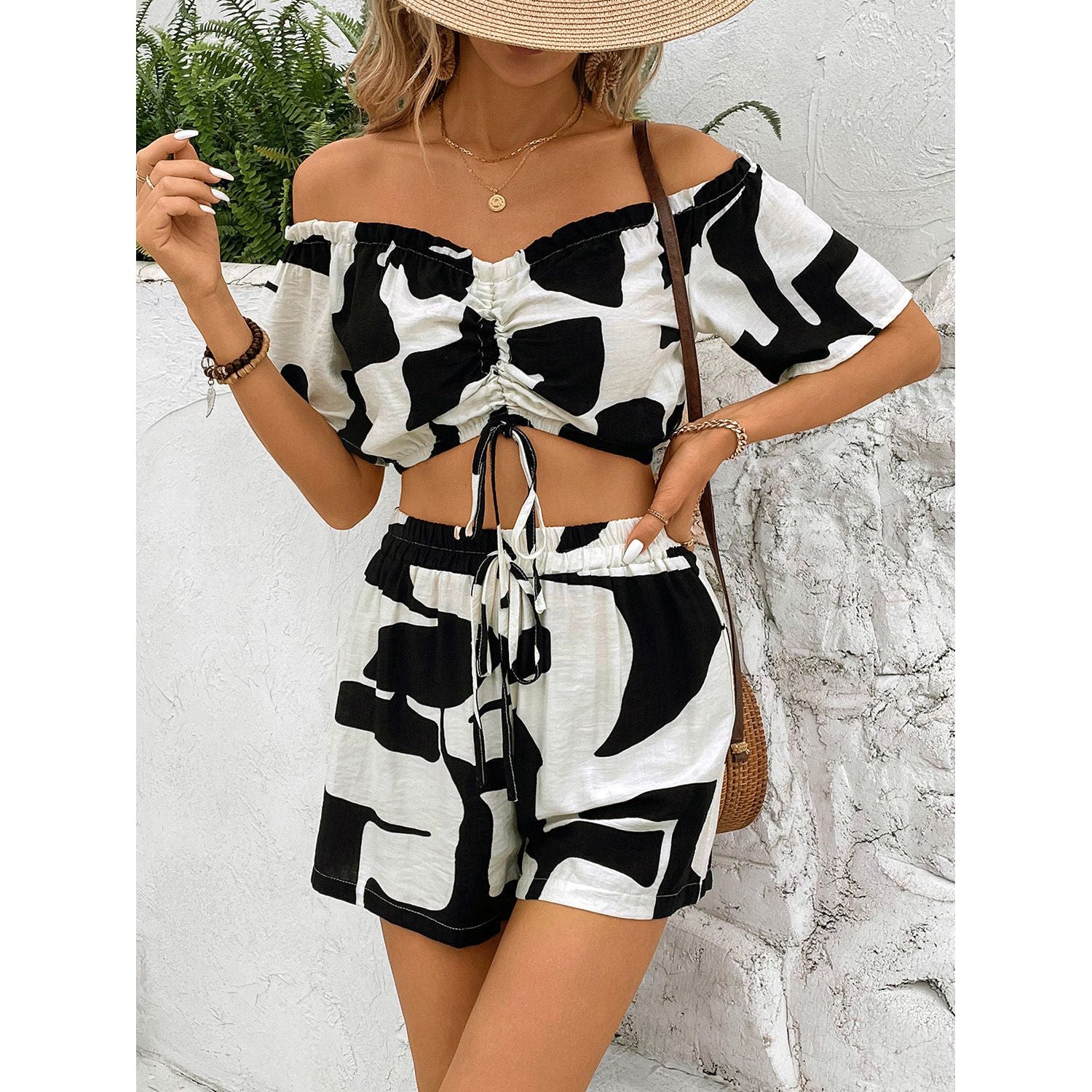 Drawstring Off-Shoulder Top and Shorts Set