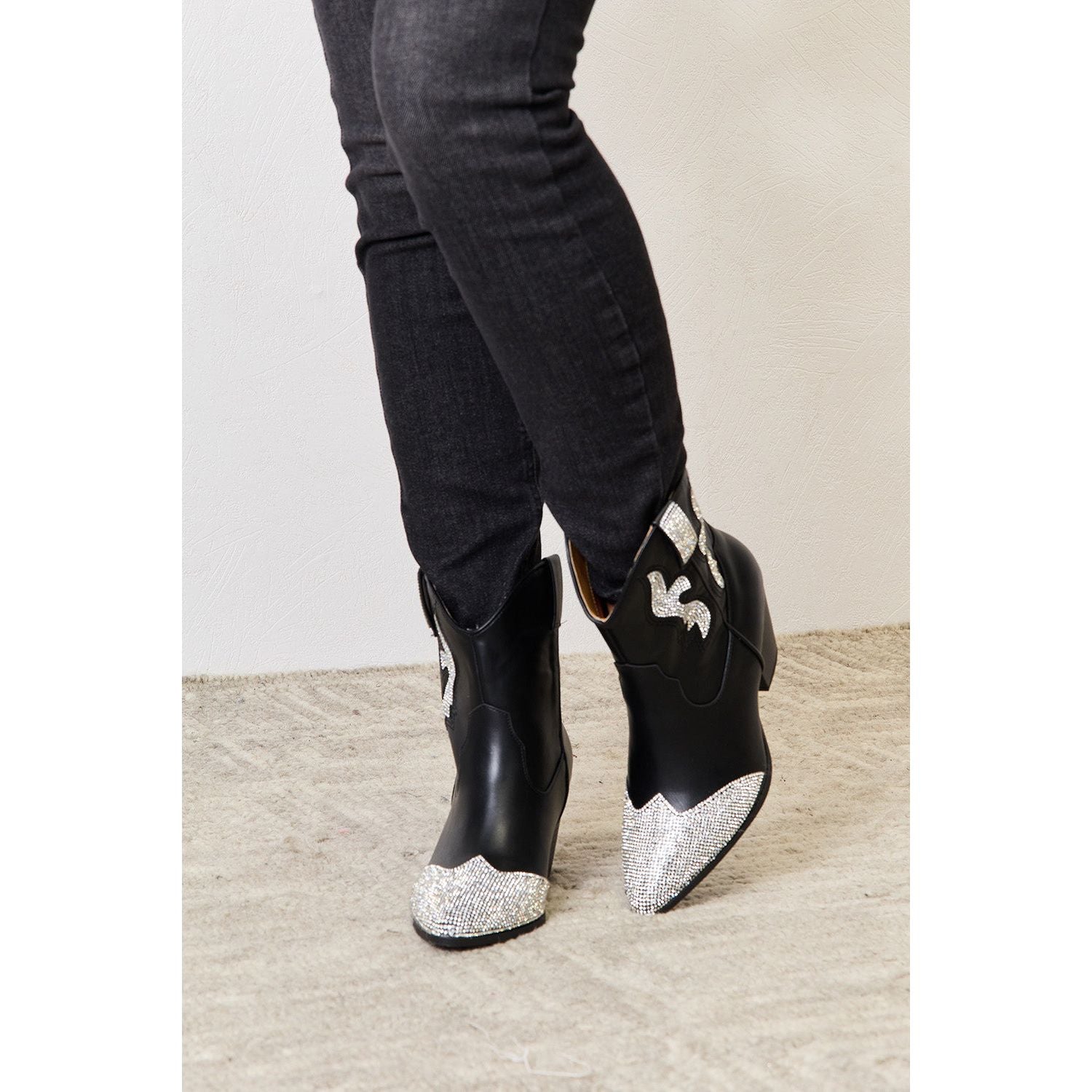 These boots feature a stunning array of rhinestones adorning the ankle, creating a captivating sparkle with every step. The pointed toe and chunky heel pay homage to classic cowboy boot design, while the ankle height offers a modern twist that's perfect for any occasion.