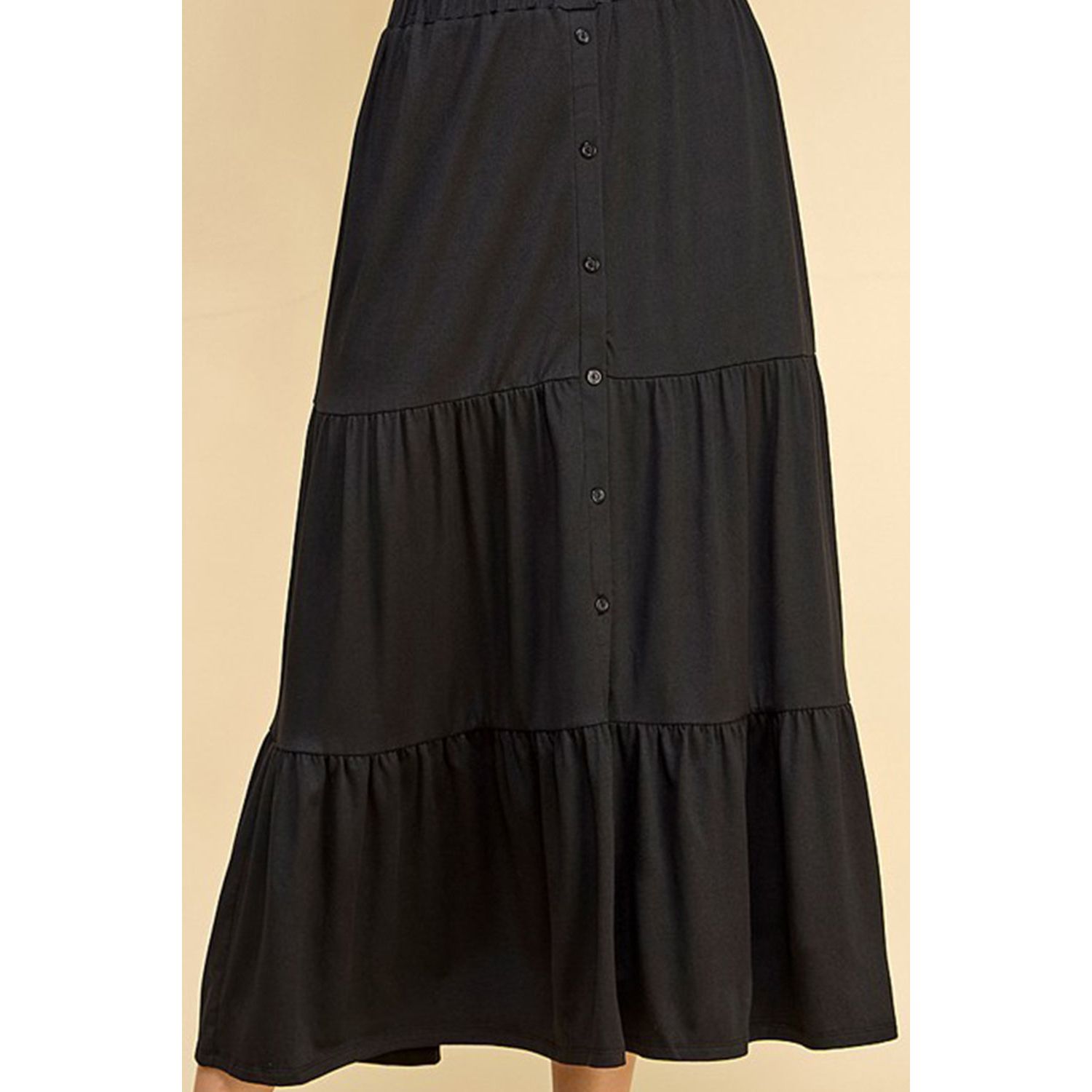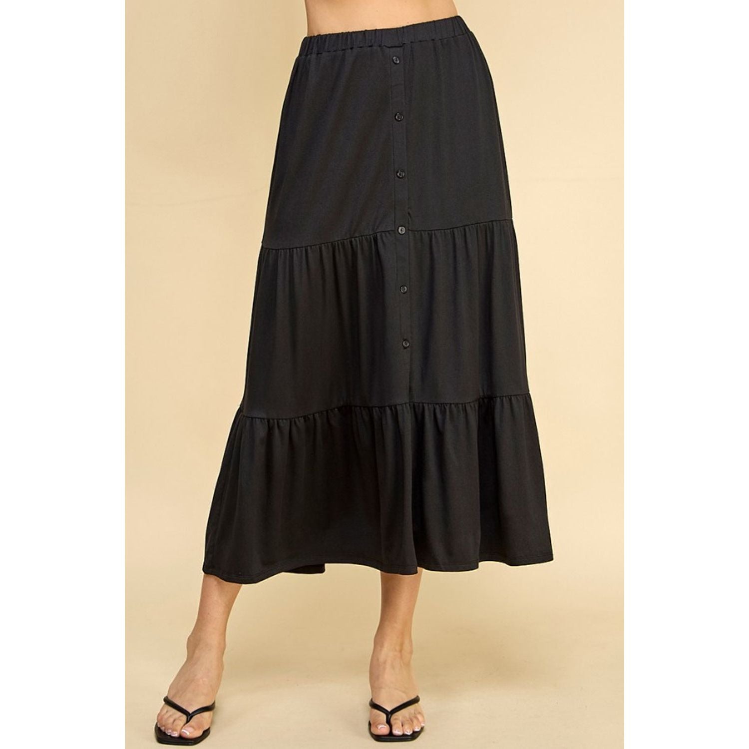 The tiered midi skirt is a stylish and feminine piece that adds a touch of elegance to any outfit. With its tiered design, it creates unique layers and movements that are both flattering and eye-catching. The midi length falls below the knee, making it a versatile option for both casual and formal occasions. Crafted from lightweight and flowy fabric, this skirt offers comfort and ease of movement. Pair it with a tucked-in blouse and heels for a sophisticated look, or dress it down with a simple t-shirt and sandals for a more laid-back vibe. Whether you're attending a wedding or simply going out for brunch, the tiered midi skirt is a versatile and chic addition to your wardrobe.
