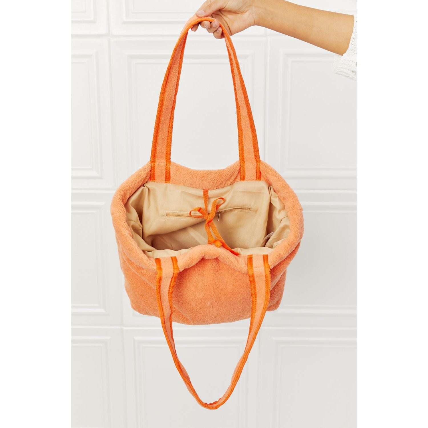 This beautiful orange tote is great for that extra pop of color. It is made of this super soft, plush material so it would also make a great beach/pool pillow. This bag features one zip pocket and one slip pocket inside.