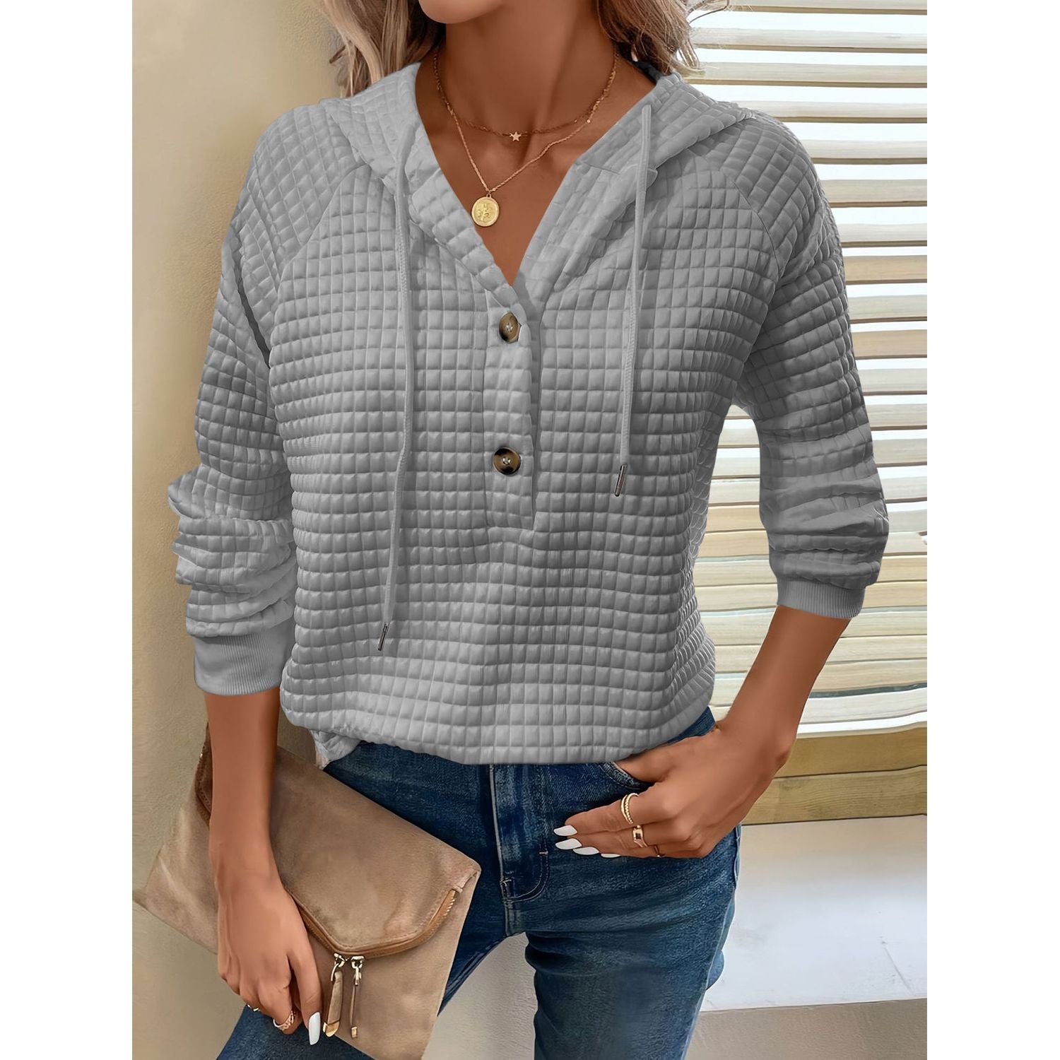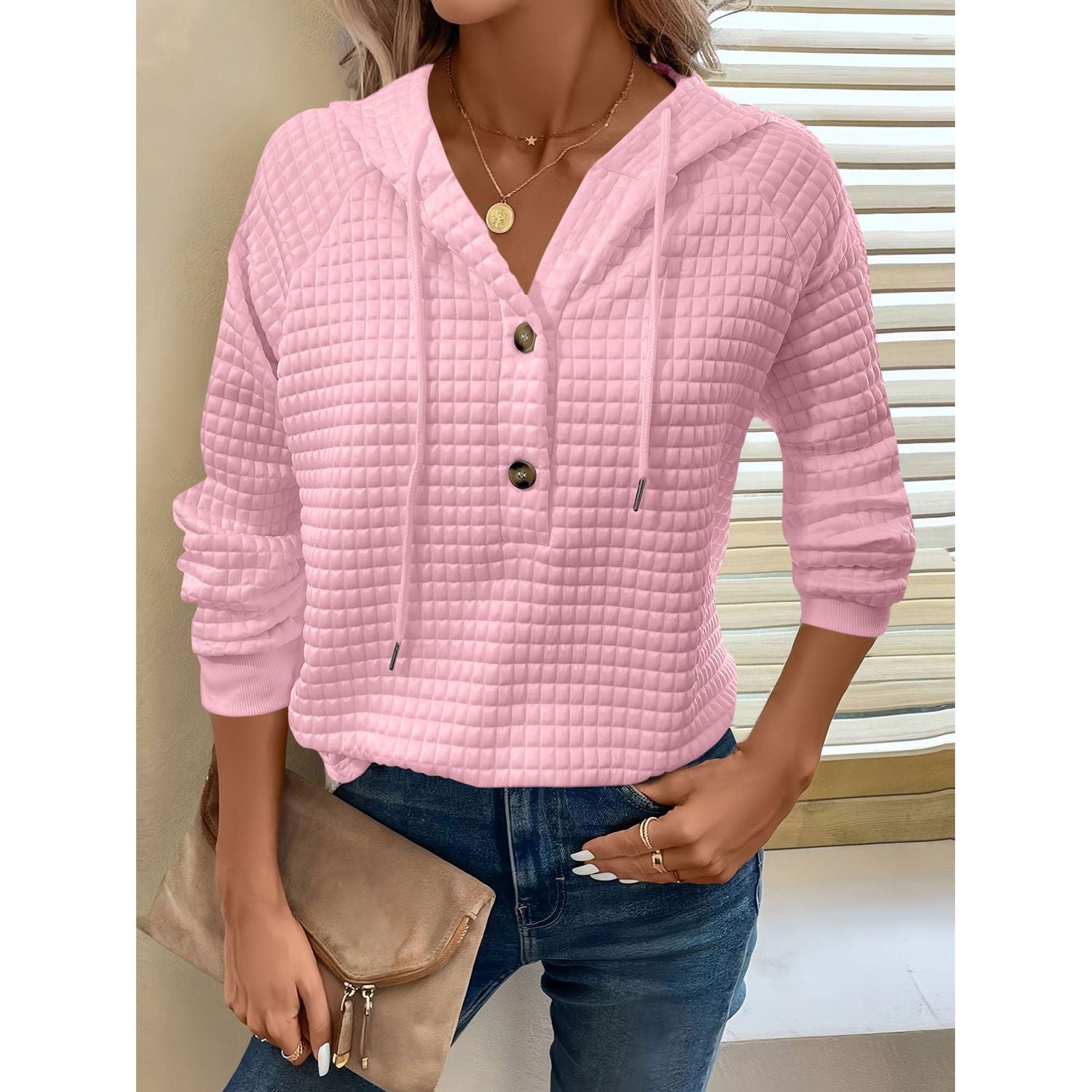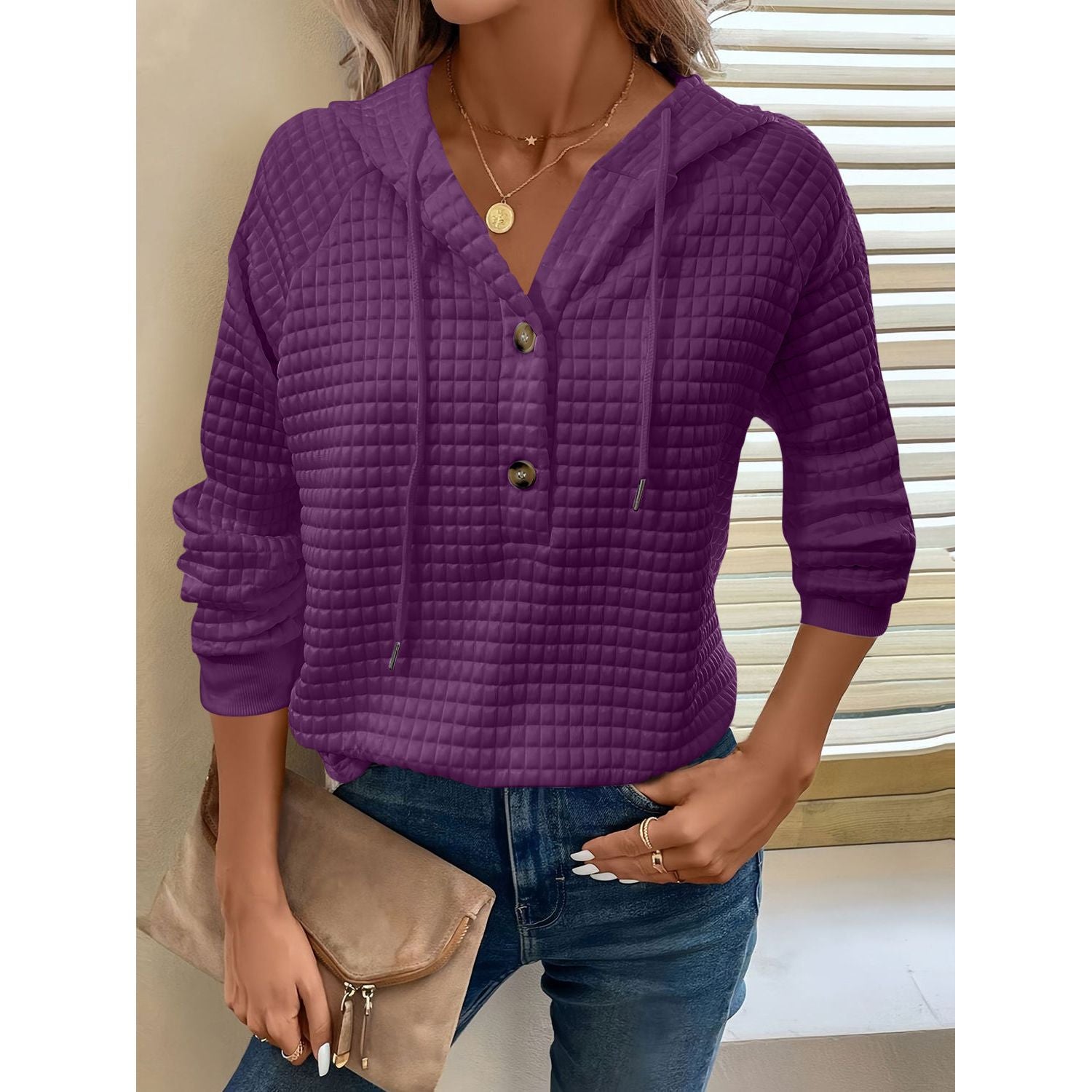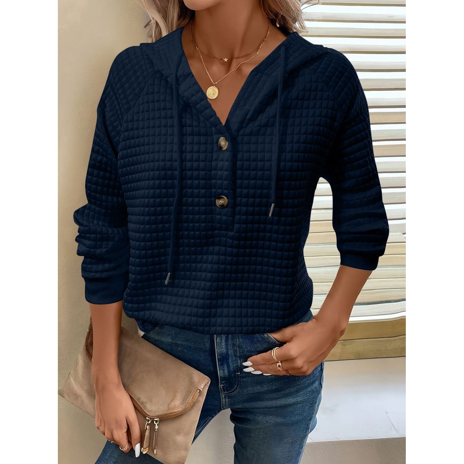 Full Size Texture Button Detail Drawstring Long Sleeve Hoodie