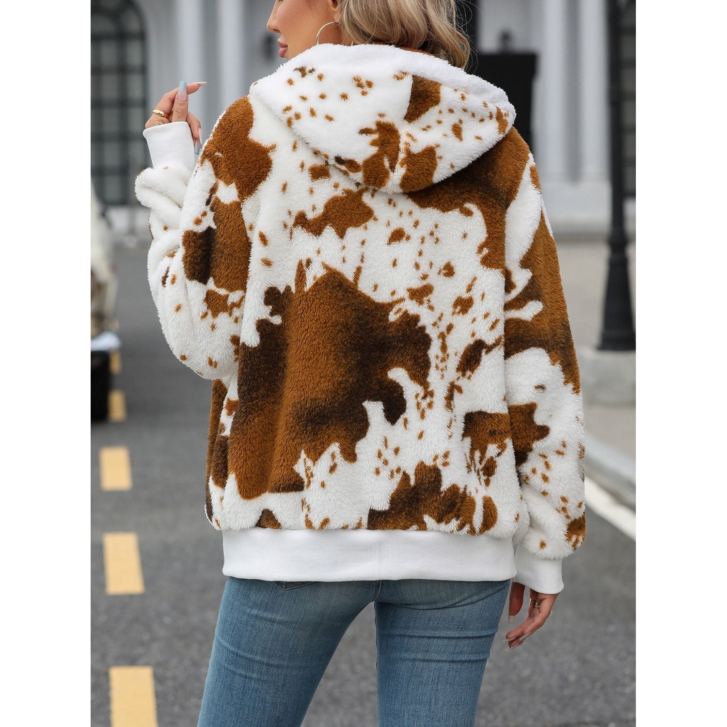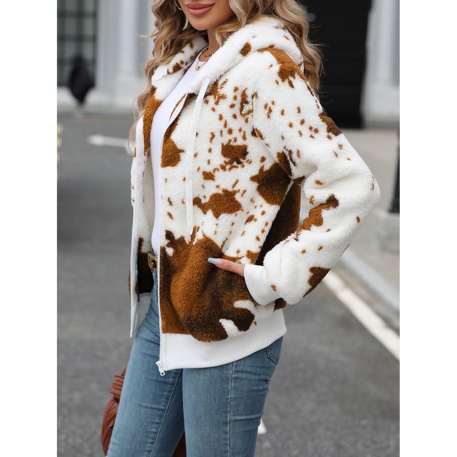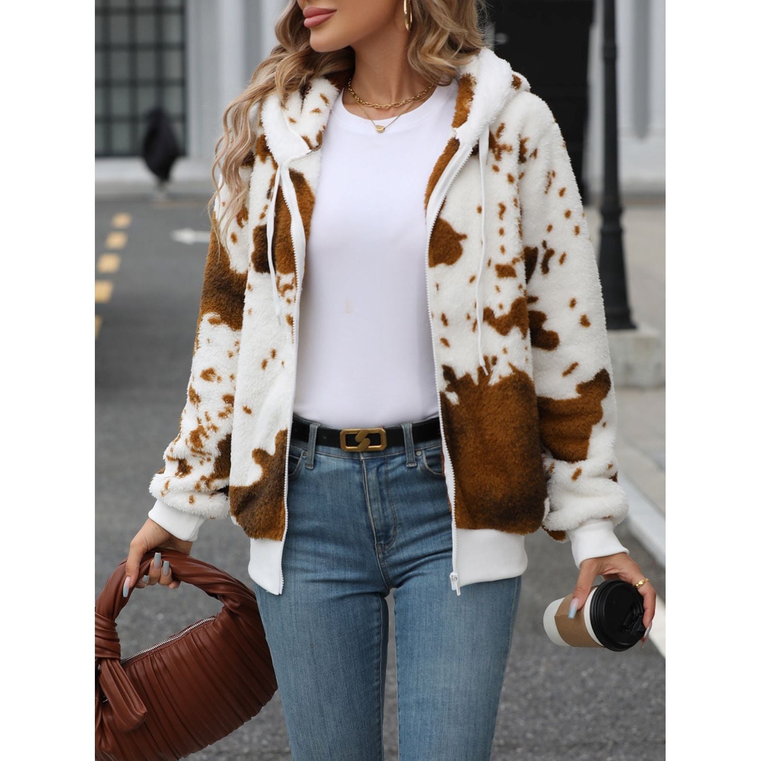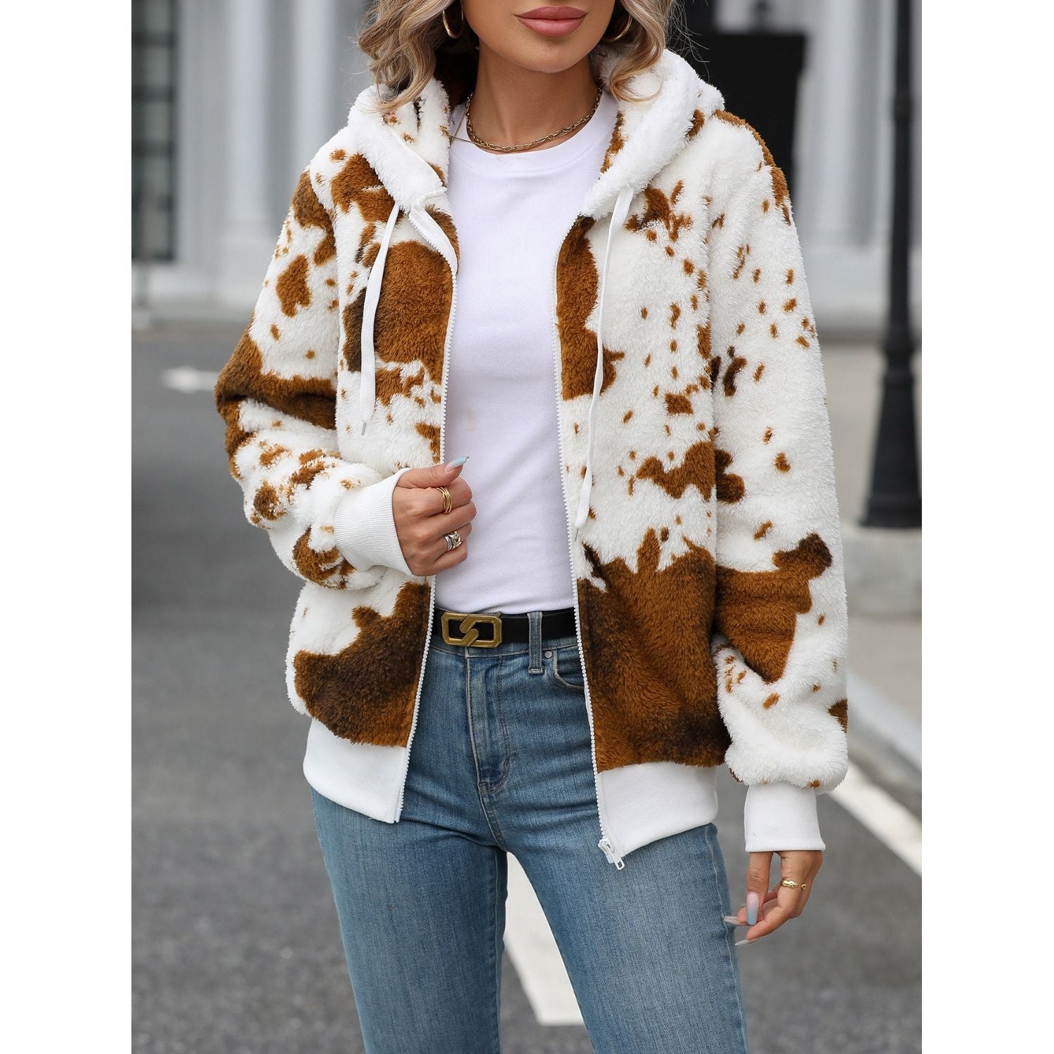 Fuzzy Drawstring Zip Up Hooded Jacket