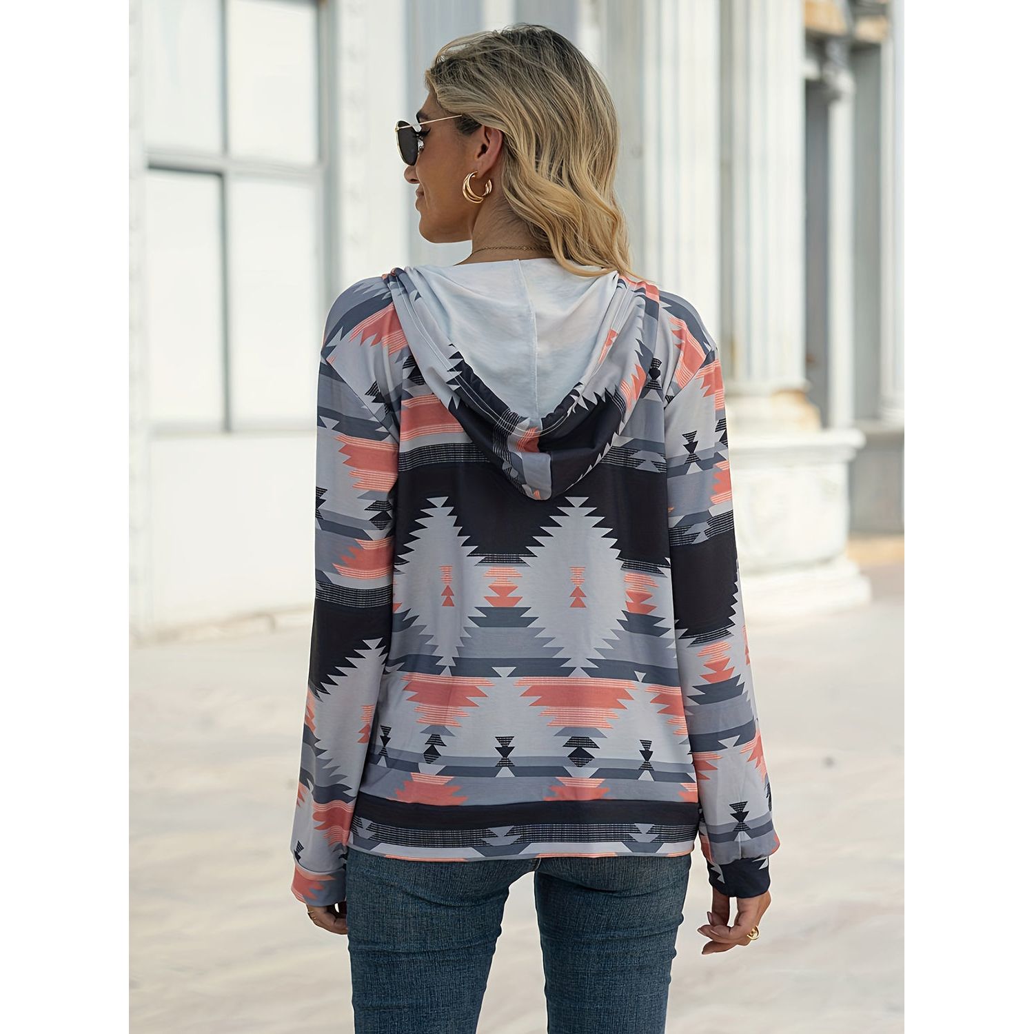Geometric Zip Up Long Sleeve Hooded Jacket