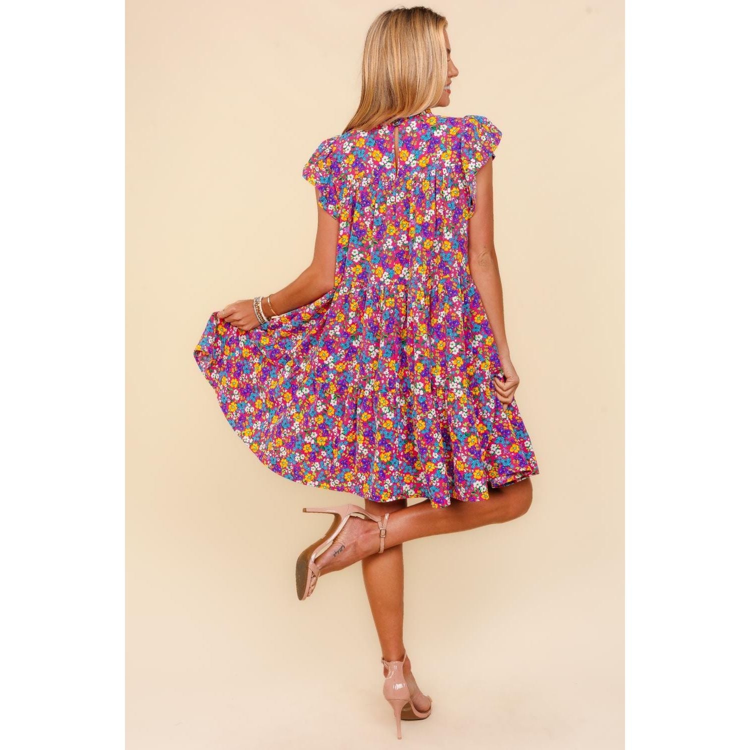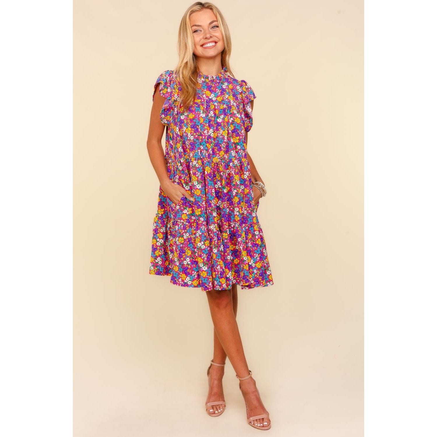 This frilled mock neck yoke dress features flutter short sleeves and a tiered knee-length design, creating a feminine and elegant silhouette. The ditzy small floral print adds a touch of charm and whimsy to the overall look. With side pockets for added convenience, this woven dress combines style with practicality. Perfect for a brunch date or a garden party, this dress exudes a romantic and chic vibe. Embrace a fresh and delightful style with this lovely piece that is sure to capture attention. Elevate your wardrobe with this tasteful and fashionable dress that offers both sophistication and functionality.