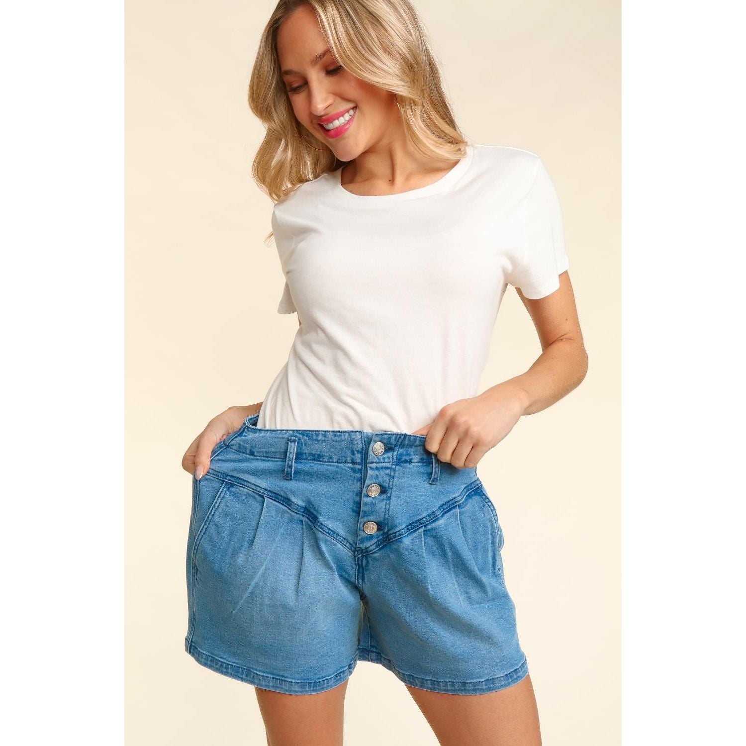 These High Rise Button Fly Washed Denim Shorts are a versatile addition to your wardrobe. The high rise design provides a flattering fit, while the button fly detail adds a trendy touch. Made from washed denim, these shorts offer a relaxed and comfortable feel. Pair them with a basic top for a casual look, or dress them up with a blousy blouse for a more elevated style. The classic denim fabric ensures that these shorts are timeless and easy to style for various occasions. Update your summer wardrobe with these chic and easy-to-wear denim shorts.