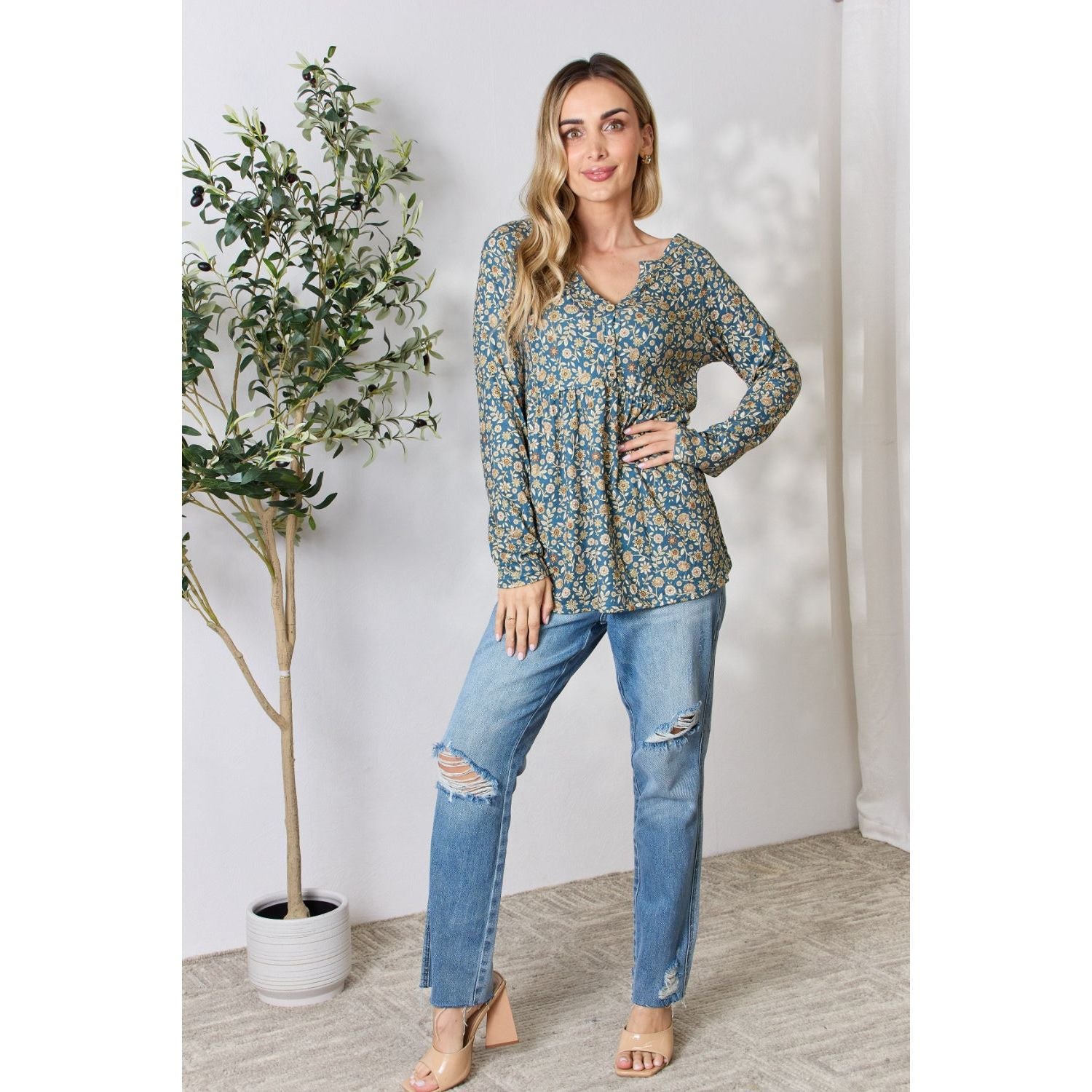 Heimish Full Size Floral Half Button Long Sleeve Blouse